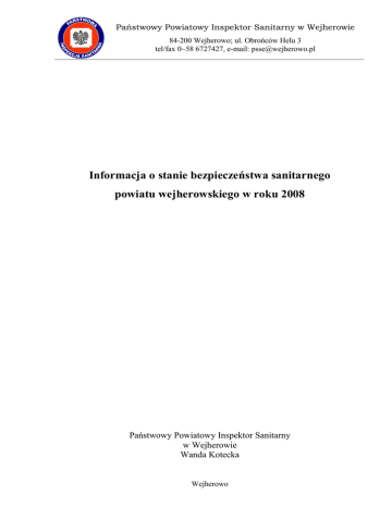 Państwowy Powiatowy Inspektor Sanitarny w Wejherowie 84-200 Wejherowo; ul. Obrońców Helu 3 tel/fax 0~58 6727427, e-mail: [email protected] Informacja o stanie bezpieczeństwa sanitarnego powiatu wejherowskiego w roku 2008 Państwowy Powiatowy Inspektor Sanitarny w Wejherowie Wanda Kotecka Wejherowo Informacja o stanie bezpieczeństwa sanitarnego powiatu wejherowskiego za 2008r Spis treści Spis treści.........................................................................................................................................2 Spis tabel .........................................................................................................................................2 Spis rysunków .................................................................................................................................2 Wstęp ...............................................................................................................................................3 Ocena zagrożeń sanitarnych na podstawie działalności kontrolnej prowadzonej na terenie powiatu wejherowskiego. ................................................................................................................4 Sytuacja epidemiologiczna chorób zakaźnych na terenie powiatu. ............................................4 Inwazyjna choroba meningokokowa. ...................................................................................... 5 Pokąsania ................................................................................................................................. 6 Antygeny HBS i HCV ............................................................................................................. 6 Zakażenia wewnątrzszpitalne. ................................................................................................. 6 Analiza szczepień ochronnych ................................................................................................ 6 Ocena stanu sanitarno-technicznego i funkcjonalności placówek służby zdrowia. ................ 6 Nadzór sanitarny nad obiektami komunalnymi ...........................................................................7 Ocena zagrożenia wystąpienia Legionelozy po pobycie w hotelach. ..................................... 7 Zły stan techniczny obiektów PKP ......................................................................................... 7 Ocena zagrzybienia obiektów mieszkalnych. ......................................................................... 7 Ocena zaszczurzenia................................................................................................................ 7 Ocena stanu sanitarnego kąpielisk. ......................................................................................... 7 Ocena stanu sanitarnego basenów ........................................................................................... 7 Ocena stanu sanitarnego wodociągów .................................................................................... 8 Ocena zanieczyszczenia powietrza atmosferycznego w Wejherowie. .................................. 10 Ocena higienizacji procesu nauczania i stanu sanitarnego placówek oświatowych. ...............11 Ocena poprawy bezpieczeństwa i jakości zdrowotnej żywności. .............................................12 Ocena higienicznych warunków pracy. .....................................................................................13 Działalność oświatowa i promocja zdrowia. .............................................................................14 Zapobiegawczy nadzór sanitarny. .............................................................................................15 Sytuacja kadrowa Stacji.................................................................................................................15 Podsumowanie działalności kontrolno-represyjnej PPIS w Wejherowie w roku 2008. ..............16 Spis tabel Tabela 1 Statystyka epidemiologiczna z wybranych chorób zakaźnych za lata 2007-2008 na terenie powiatu wejherowskiego .....................................................................................................4 Tabela 2 Zanieczyszczenie benzo/a/pirenem i substancjami smołowymi w powietrzu atmosferycznym w Wejherowie w latach 2004-2008 ...................................................................10 Tabela 3 Dopuszczalne stężenia 24h zanieczyszczeń powietrza atmosferycznego ......................11 Tabela 4 Analiza chorób zawodowych w latach 2003-2008 .........................................................13 Tabela 5 Zestawienie narażenia pracowników na czynniki szkodliwe w środowisku pracy ........14 Tabela 6 Działalność kontrolno-represyjna PPIS w Wejherowie w 2008r. ..................................16 Spis rysunków Rysunek 1 Ocena wodociagów pod względem dostarczanej jakości wody ...................................8 Rysunek 2 Ocena zaopatrzenia ludności w wodę na terenie powiatu wejherowskiego .................9 Rysunek 3 Ocena zaopatrzenia w wodę ludności w poszczególnych gminach powiatu wejherowskiego ...............................................................................................................................9 Rysunek 4 Średnie miesięczne zanieczyszczenie powietrza atmosferycznego w Wejherowie ....10 Strona 2 z 16 Informacja o stanie bezpieczeństwa sanitarnego powiatu wejherowskiego za 2008r Wstęp Państwowy Powiatowy Inspektor Sanitarny w Wejherowie, realizując zadania z zakresu zdrowia publicznego, przeprowadzał w roku 2008 ocenę warunków higieniczno-zdrowotnych dotyczących higieny komunalnej, higieny pracy, higieny miejsc wypoczynku i rekreacji oraz procesów nauczania pod kątem występowania czynników, mogących mieć szkodliwy wpływ na zdrowie mieszkańców powiatu wejherowskiego. Ocenialiśmy również bezpieczeństwo żywności w produkcji i obrocie, warunki sanitarno-