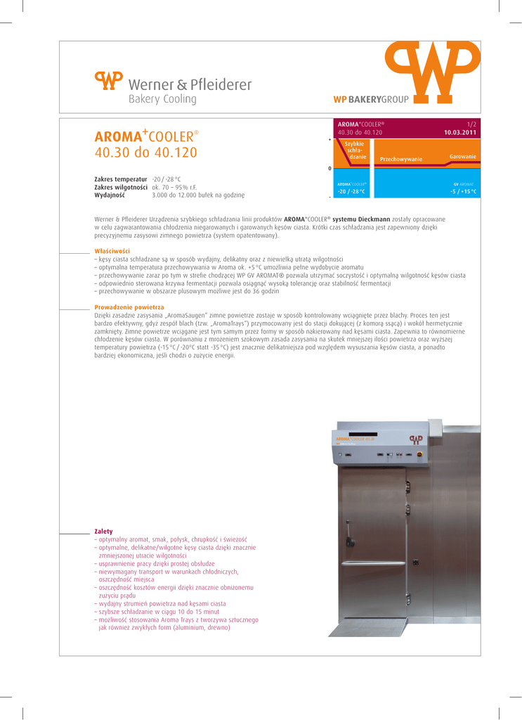 WP BAKERYGROUP AROMA+COOLER 40.30 do 40.120 ® + AROMA+COOLER® 40.30 do 40.120 Szybkie schładzanie 1/2 10.03.2011 Przechowywanie Garowanie 0 Zakres temperatur -20 / -28 °C Zakres wilgotności ok. 70 – 95 % r.F. Wydajność 3.000 do 12.000 bułek na godzinę - AROMA+COOLER® GV AROMAT -20 / -28 °C -5 / +15 °C Werner & Pfleiderer Urządzenia szybkiego schładzania linii produktów AROMA+COOLER® systemu Dieckmann zostały opracowane w celu zagwarantowania chłodzenia niegarowanych i garowanych kęsów ciasta. Krótki czas schładzania jest zapewniony dzięki precyzyjnemu zasysowi zimnego powietrza (system opatentowany). Właściwości – kęsy ciasta schładzane są w sposób wydajny, delikatny oraz z niewielką utratą wilgotności – optymalna temperatura przechowywania w Aroma ok. +5 °C umożliwia pełne wydobycie aromatu – przechowywanie zaraz po tym w strefie chodzącej WP GV AROMAT® pozwala utrzymać soczystość i optymalną wilgotność kęsów ciasta – odpowiednio sterowana krzywa fermentacji pozwala osiągnąć wysoką tolerancję oraz stabilność fermentacji – przechowywanie w obszarze plusowym możliwe jest do 36 godzin Prowadzenie powietrza Dzięki zasadzie zasysania „AromaSaugen“ zimne powietrze zostaje w sposób kontrolowany wciągnięte przez blachy. Proces ten jest bardzo efektywny, gdyż zespół blach (tzw. „AromaTrays“) przymocowany jest do stacji dokującej (z komorą ssącą) i wokół hermetycznie zamknięty. Zimne powietrze wciągane jest tym samym przez formy w sposób nakierowany nad kęsami ciasta. Zapewnia to równomierne chłodzenie kęsów ciasta. W porównaniu z mrożeniem szokowym zasada zasysania na skutek mniejszej ilości powietrza oraz wyższej temperatury powietrza (-15 °C / -20°C statt -35 °C) jest znacznie delikatniejsza pod względem wysuszania kęsów ciasta, a ponadto bardziej ekonomiczna, jeśli chodzi o zużycie energii. Zalety – optymalny aromat, smak, połysk, chrupkość i świeżość – optymalne, delikatne/wilgotne kęsy ciasta dzięki znacznie zmniejszonej utracie wilgotności – usprawnienie pracy dzięki prostej obsłudze – niewymagany transport w warunkach chłodniczych, oszczędność miejsca – oszczędność kosztów energii dzięki znacznie obniżonemu zużyciu prądu – wydajny strumień powietrza nad kęsami ciasta – szybsze schładzanie w ciągu 10 do 15 minut – możliwość stosowania Aroma Trays z tworzywa sztucznego jak również zwykłych form (aluminium, drewno) WP BAKERYGROUP Szczegóły techniczne Wydajność 3.000 do 12.000 bułek na godzinę Czas schładzania 10 do 15 minut Obudowa komory –p anele z izolacją 100 mm PU, spienione, bez FCKW, HFCKW i HKW – s zybki montaż na miejscu dzięki systemowi wpustów i piór z piankowymi ekscentrycznymi śrubami rzymskimi wartość k 0,20 W/m²K Powierzchnie Obicie standardowe – ś ciany wewnętrzne: stal szlachetna – ściany zewnętrzne: blacha stalowa, ocynkowana, biała – przód urządzenia: stal szlachetna, szlif ziarnisty opcjonalnie obicie ze stali szlachetnej na wszystkich powierzchniach Podłoże – System TECFLOOR, izolowany PU, 100 mm, z bezpośrednio spienioną płytą podłogową ze stali szlachetnej 0,8 mm – nałożona płyta podłogowa ze stali szlachetnej 3 mm jako wanna z podciągniętymi brzegami Osłona ubijaka wewnątrz z profilami czworokątnymi ze stali szlachetnej Drzwi Drzwi obrotowe - wymiar w świetle 80 x 200 cm z - 3 zawiasami drzwiowymi – solidnym zamknięciem za pomocą dźwigni dociskowej dla zastosowań przemysłowych – wewnętrzną i zewnętrzną osłoną ubijaka – uszczelnieniem drzwi – ogrzewaniem ramy drzwiowej – wielowarstwową gumą szlifierską do uszczelnienia przy podłożu Sterowanie poprzez regulator EMS w komplecie z szafą sterowniczą wg VDE, wstępnie połączone i proste w obsłudze Wydajność poszczególnych urządzeń uzależniona jest od wymiarów blach – 40 x 60 cm dla 16 kęsów ciasta po 60 g – 60 x 80 cm dla 32 kęsów ciasta po 60 g 40 form na rolę Wyposażenie – wyłącznik maszyny – soft start czyli łagodny rozruch – podgrzewanie miski olejowej – skraplacz sterowany ciśnieniowo o regulowanej liczbie obrotów umożliwiający bardziej ekonomiczną eksploatację – niskoszumowe, oddzielne skraplacze (< 56 dB) lub cicho pracujące wirniki (< 38 dB) do wyboru – wszystkie niezbędne środki w celu zapewnienia bezpieczeństwa System ssący szybkoschładzający Dieckmann AROMA+COOLER 40.30 typ 40. Dla blach 40 x 60/60 x 80 Wydajność kęsy ciasta Blachy Rollis szt. 3.000 AROMA+COOLER 40.45 AROMA+COOLER 40.60 AROMA+COOLER 40.90 AROMA+COOLER 40.120 4.500 6.000 9.000 12.000 szt. 1 2 2 4 4 Czas chłodzenia 40 x 60 blachy min. 13 17 13 17 13 Czas chłodzenia 60 x 80 blach min. Wymiary zewnętrzne (B X T X H) cm 17 25 17 25 20 130 x 150 x 300 130 x 210 x 300 130 x 210 x 300 250 x 210 x 300 250 x 210 x 300 WERNER & PFLEIDERER Koeling Benelux B.V. Industrieterrein 9 D . 5981 NK Panningen . Netherlands Fon +31 (0) 77-850 70 60 . Fax +31 (0) 77-850 70 61 . [email protected] . www.wp-bakerycooling.com HERT Sp. z o.o. Sp. K. ul. Odlewnicza 4A, 03-231 Warszawa, tel. +48 (22) 594 05 00, fax: +48 (22) 594 05 26, www.hert.pl NIP: 524-00-18-433, KRS: 0000320210 Sąd Rej. dla m. st. W-wy, XIII Wydz. 2/2 10.03.2011 Wszystkie wymienione dane są niewiążące, zastrzegamy możliwość przeprowadzenia zmian technicznych, jeśli służyłoby to udoskonaleniu. AROMA+COOLER AROMA+COOLER® 40.30 do 40.120 ®