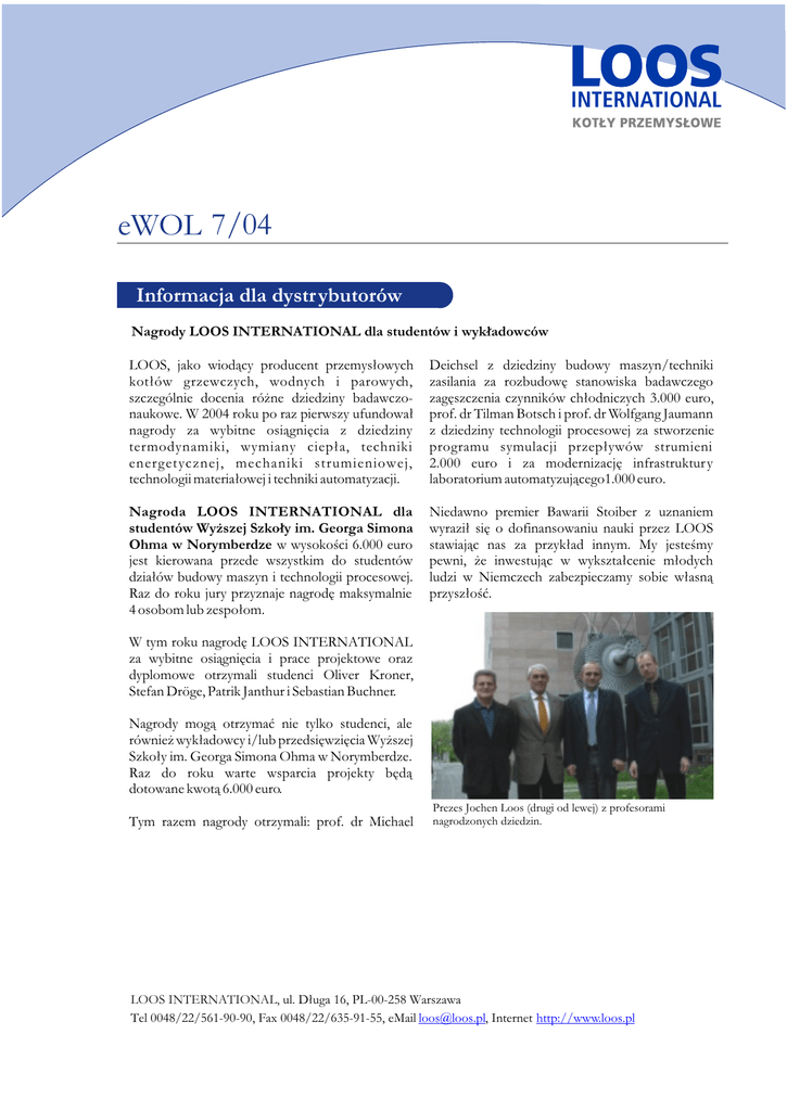 eWOL 7/04 Informacja dla dystrybutorów Nagrody LOOS INTERNATIONAL dla studentów i wyk³adowców LOOS, jako wiod¹cy producent przemys³owych kot³ów grzewczych, wodnych i parowych, szczególnie docenia ró¿ne dziedziny badawczonaukowe. W 2004 roku po raz pierwszy ufundowa³ nagrody za wybitne osi¹gniêcia z dziedziny termodynamiki, wymiany ciep³a, techniki energetycznej, mechaniki strumieniowej, technologii materia³owej i techniki automatyzacji. Deichsel z dziedziny budowy maszyn/techniki zasilania za rozbudowê stanowiska badawczego zagêszczenia czynników ch³odniczych 3.000 euro, prof. dr Tilman Botsch i prof. dr Wolfgang Jaumann z dziedziny technologii procesowej za stworzenie programu symulacji przep³ywów strumieni 2.000 euro i za modernizacjê infrastruktur y laboratorium automatyzuj¹cego1.000 euro. Nagroda LOOS INTERNATIONAL dla studentów Wy¿szej Szko³y im. Georga Simona Ohma w Norymberdze w wysokoœci 6.000 euro jest kierowana przede wszystkim do studentów dzia³ów budowy maszyn i technologii procesowej. Raz do roku jury przyznaje nagrodê maksymalnie 4 osobom lub zespo³om. Niedawno premier Bawarii Stoiber z uznaniem wyrazi³ siê o dofinansowaniu nauki przez LOOS stawiaj¹c nas za przyk³ad innym. My jesteœmy pewni, ¿e inwestuj¹c w wykszta³cenie m³odych ludzi w Niemczech zabezpieczamy sobie w³asn¹ przysz³oœæ. W tym roku nagrodê LOOS INTERNATIONAL za wybitne osi¹gniêcia i prace projektowe oraz dyplomowe otrzymali studenci Oliver Kroner, Stefan Dröge, Patrik Janthur i Sebastian Buchner. Nagrody mog¹ otrzymaæ nie tylko studenci, ale równie¿ wyk³adowcy i/lub przedsiêwziêcia Wy¿szej Szko³y im. Georga Simona Ohma w Norymberdze. Raz do roku warte wsparcia projekty bêd¹ dotowane kwot¹ 6.000 euro. Tym razem nagrody otrzymali: prof. dr Michael Prezes Jochen Loos (drugi od lewej) z profesorami nagrodzonych dziedzin. LOOS INTERNATIONAL, ul. D³uga 16, PL-00-258 Warszawa Tel 0048/22/561-90-90, Fax 0048/22/635-91-55, eMail [email protected], Internet http://www.loos.pl