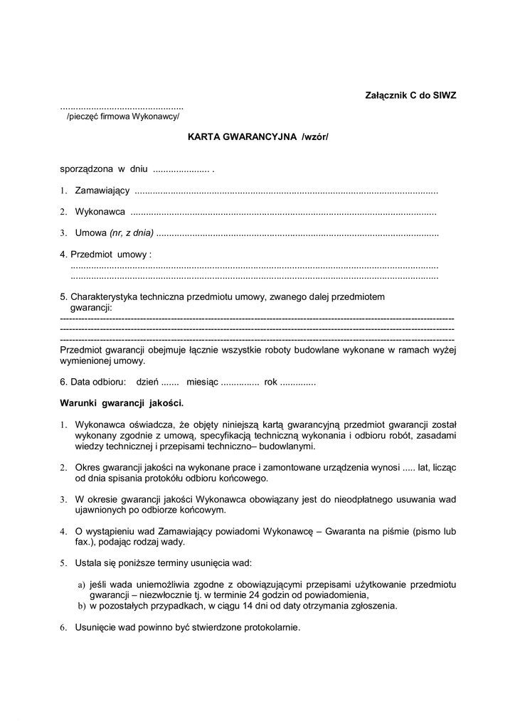Załącznik C do SIWZ ................................................ /pieczęć firmowa Wykonawcy/ KARTA GWARANCYJNA /wzór/ sporządzona w dniu ...................... . 1. Zamawiający ...................................................................................................................... 2. Wykonawca ....................................................................................................................... 3. Umowa (nr, z dnia) .............................................................................................................. 4. Przedmiot umowy : ............................................................................................................................................... ............................................................................................................................................... 5. Charakterystyka techniczna przedmiotu umowy, zwanego dalej przedmiotem gwarancji: ---------------------------------------------------------------------------------------------------------------------------------------------------------------------------------------------------------------------------------------------------------------------------------------------------------------------------------------------------------------------------------------------Przedmiot gwarancji obejmuje łącznie wszystkie roboty budowlane wykonane w ramach wyżej wymienionej umowy. 6. Data odbioru: dzień ....... miesiąc ............... rok .............. Warunki gwarancji jakości. 1. Wykonawca oświadcza, że objęty niniejszą kartą gwarancyjną przedmiot gwarancji został wykonany zgodnie z umową, specyfikacją techniczną wykonania i odbioru robót, zasadami wiedzy technicznej i przepisami techniczno– budowlanymi. 2. Okres gwarancji jakości na wykonane prace i zamontowane urządzenia wynosi ..... lat, licząc od dnia spisania protokółu odbioru końcowego. 3. W okresie gwarancji jakości Wykonawca obowiązany jest do nieodpłatnego usuwania wad ujawnionych po odbiorze końcowym. 4. O wystąpieniu wad Zamawiający powiadomi Wykonawcę – Gwaranta na piśmie (pismo lub fax.), podając rodzaj wady. 5. Ustala się poniższe terminy usunięcia wad: a) jeśli wada uniemożliwia zgodne z obowiązującymi przepisami użytkowanie przedmiotu gwarancji – niezwłocznie tj. w terminie 24 godzin od powiadomienia, b) w pozostałych przypadkach, w ciągu 14 dni od daty otrzymania zgłoszenia. 6. Usunięcie wad powinno być stwierdzone protokolarnie. 7. Jeżeli w wykonaniu swoich obowiązków gwarant dostarczył uprawnionemu z gwarancji zamiast rzeczy wadliwej rzecz wolną od wad albo istotnych napraw rzeczy objętej gwarancją, termin gwarancji biegnie na nowo od chwili dostarczenia rzeczy wolnej od wad lub zwrócenia rzeczy naprawionej. Jeżeli gwarant wymienił część rzeczy, powyższe stosuje się odpowiednio do części wymienionej. 8. W innych przypadkach termin gwarancji ulega przedłużeniu o czas w ciągu którego wskutek wady przedmiotu objętego gwarancją Zamawiający z przedmiotu gwarancji nie mógł korzystać. 9. Nie podlegają uprawnieniom z tytułu gwarancji jakości wady powstałe na skutek: a) siły wyższej pod pojęciem których strony utrzymują: stan wojny, stan klęski żywiołowej i strajk generalny, b) normalnego zużycia obiektu lub jego części, c) szkód wynikłych z winy Użytkownika, a szczególnie użytkowania przedmiotu gwarancji w sposób niezgodny z zasadami eksploatacji i użytkowania. 10. W celu umożliwienia kwalifikacji zgłoszonych wad, przyczyn ich powstania i sposobu usunięcia Zamawiający zobowiązuje się do przechowania otrzymanej w dniu odbioru dokumentacji powykonawczej i protokółu przekazania przedmiotu gwarancji do użytkowania. 11. Wykonawca jest odpowiedzialny za wszelkie szkody i straty, które spowodował w czasie prac nad usuwaniem wad. 12. Wykonawca, niezależnie od udzielonej gwarancji jakości, ponosi odpowiedzialność z tytułu rękojmi za wady przedmiotu gwarancji. 13. Zamawiający, po bezskutecznym upływie terminu na usunięcie wad, wyznaczonego w zawiadomieniu do Wykonawcy, może zlecić ich usunięcie na koszt i ryzyko Wykonawcy innemu podmiotowi. 14. W sprawach nie uregulowanych niniejszą kartą gwarancyjną zastosowanie mają przepisy Kodeksu Cywilnego, Prawa Budowlanego oraz inne obowiązujące przepisy prawa. 15. Karta gwarancyjna ważna jest tylko z umową na wykonanie przedmiotu zamówienia, podpisaną przez strony umowy. Warunki gwarancji podpisali: Udzielający gwarancji jakości : Przyjmujący gwarancję jakości : ................................................. .................................................