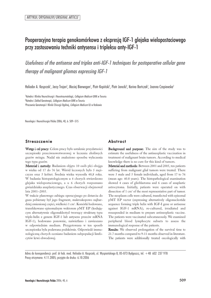 ARTYKU£ ORYGINALNY/ORIGINAL ARTICLE Pooperacyjna terapia genokomórkowa z ekspresj¹ IGF-1 glejaka wielopostaciowego przy zastosowaniu techniki antysensu i tripleksu anty-IGF-1 Usefulness of the antisense and triplex anti-IGF-1 techniques for postoperative cellular gene therapy of malignant gliomas expressing IGF-1 Heliodor A. Kasprzak1, Jerzy Trojan2, Maciej Bierwagen1, Piotr Kopiñski2, Piotr Jarocki3, Karina Bartczak2, Joanna Czapiewska2 1Katedra i Klinika Neurochirurgii i Neurotraumatologii, Collegium Medicum UMK w Toruniu 2Katedra i Zak³ad Genoterapii, Collegium Medicum UMK w Toruniu 3Pracownia Genoterapii I Kliniki Chirurgii Ogólnej, Collegium Medicum UJ w Krakowie Neurologia i Neurochirurgia Polska 2006; 40, 6: 509–515 Streszczenie Abstract Wstêp i cel pracy: Celem pracy by³o ustalenie przydatnoœci szczepionki przeciwnowotworowej w leczeniu z³oœliwych guzów mózgu. Nadal nie znaleziono sposobu wyleczenia tego typu guzów. Materia³ i metody: Badaniem objêto 10 osób p³ci obojga w wieku od 17 do 76 lat. Wœród leczonych by³o 5 mê¿czyzn oraz 5 kobiet. Œrednia wieku wynosi³a 40,8 roku. W badaniu histopatologicznym u 4 chorych stwierdzono glejaka wielopostaciowego, a u 6 chorych rozpoznano gwiaŸdziaka anaplastycznego. Czas obserwacji obejmowa³ lata 2001–2005. W trakcie planowego zabiegu operacyjnego po dotarciu do guza pobierany by³ jego fragment, makroskopowo najbardziej zmienionej czêœci, wielkoœci 1 cm3. Komórki hodowano, transfekowano episomalnym wektorem pMT EP (koduj¹cym alternatywnie oligonukleotyd tworz¹cy strukturê typu triple-helix z genem IGF-1 lub antysens przeciw mRNA IGF-1), hodowano ponownie, naœwietlano i zawieszano w odpowiednim medium. Przygotowana w ten sposób szczepionka by³a podawana podskórnie. OdpowiedŸ immunologiczn¹ chorych oceniano badaniem subpopulacji limfocytów krwi obwodowej. Background and purpose: The aim of the study was to estimate the usefulness of the antineoplastic vaccination in treatment of malignant brain tumors. According to medical knowledge there is no cure for this kind of tumors. Material and methods: Between 2001 and 2005, ten patients suffering from malignant glial tumors were treated. There were 5 male and 5 female individuals, aged from 17 to 76 (mean age: 40.8 years). The histopathological examination showed 4 cases of glioblastoma and 6 cases of anaplastic astrocytoma. Initially, patients were operated on with dissection of 1 cm3 of the most representative part of tumor. The neoplasm cells were cultured, transfected with episomal pMT EP vector (expressing alternatively oligonucleotide sequence forming triple helix with IGF-I gene or antisense against IGF-1 mRNA), re-cultured, irradiated and resuspended in medium to prepare antineoplastic vaccine. The patients were vaccinated subcutaneously. We examined peripheral blood lymphocyte subsets to assess the immunological response of the patients. Results: We observed prolongation of the survival time to 21.7 months compared to 9-11 months observed in literature. The patients were additionally treated oncologically with Adres do korespondencji: prof. dr hab. med. Heliodor A. Kasprzak, ul. Wyspiañskiego 8, 85-073 Bydgoszcz, tel. +48 602 237 978 Pracê otrzymano: 4.11.2005; przyjêto do druku: 6.10.2006 Neurologia i Neurochirurgia Polska 2006; 40, 6 509 Heliodor A. Kasprzak, Jerzy Trojan, Maciej Bierwagen, Piotr Kopiñski, Piotr Jarocki, Karina Bartczak, Joanna Czapiewska Wyniki: U chorych stwierdzono wyd³u¿enie œredniej prze¿ycia do 21,7 mies., w porównaniu z dotychczas obserwowan¹ œredni¹ 9–11 mies. Chorzy oprócz leczenia operacyjnego i genoterapii poddani byli tak¿e wszystkim dostêpnym i racjonalnie uzasadnionym metodom leczenia onkologicznego obejmuj¹cego przede wszystkim radioterapiê i chemoterapiê (temozolomid). Z tego powodu niemo¿liwa jest pe³na ocena tej metody jako uzupe³niaj¹cej monoterapii onkologicznej. Wnioski: Zastosowana metoda wyd³u¿a czas ¿ycia chorych z nisko zró¿nicowanymi guzami glejowymi oœrodkowego uk³adu nerwowego. Zastosowanie jej jako onkologicznej monoterapii uzupe³niaj¹cej wymaga dalszych badañ. radiotherapy and chemotherapy (temozolomide) according to the reasonable indications. Therefore, the comprehensive assessment of the genotherapy as the supplemental monotherapy was impossible. Conclusions: The method of treatment used in this study prolongs the survival time of patients with high-grade gliomas of the central nervous system. This gene therapy needs further investigations as a method of oncological monotherapy of brain malignant gliomas. Key words: glioblastoma, gene therapy, IGF-1. S³owa kluczowe: glejak niedojrza³y wielopostaciowy, genoterapia, IGF-1. Wstêp i cel pracy Dotychczasowe wyniki leczenia guzów oœrodkowego uk³adu nerwowego pochodzenia glejowego s¹ nadal wysoce niezadowalaj¹ce i koñcz¹ siê niepomyœlnie. Szczególnie guzy nisko zró¿nicowane, a wœród nich glejaki wielopostaciowe i gwiaŸdziaki III stopnia wg skali WHO wymagaj¹ nadal badañ, których celem musi byæ poprawienie wyników ich leczenia. Obecnie dostêpne metody leczenia, takie jak próba ca³kowitego b¹dŸ czêœciowego chirurgicznego usuniêcia guza, naœwietlanie oraz chemioterapia zmuszaj¹ nas do poszukiwania innych sposobów wspomagaj¹cych dotychczas stosowane terapie. Czas prze¿ycia chorego z glejakiem wielopostaciowym waha siê od 6 do 11 mies. i jest nadal, poza nielicznymi wyj¹tkami, smutn¹ rzeczywistoœci¹. Radykalne chirurgiczne usuniêcie guza pozwala na spowolnienie ekspansji procesu nowotworowego oraz wdro¿enie w tym okresie uzupe³niaj¹cych metod w postaci radioterapii klasycznej lub stereotaktycznej oraz na wdro¿enie chemioterapii, w miarê mo¿liwoœci temozolomidem. Obecnie istnieje tendencja do ustalania rozpoznania histopatologicznego guza za pomoc¹ biopsji stereotaktycznej i na jej podstawie kwalifikowania lub dyskwalifikowania od dalszego leczenia uzupe³niaj¹cego, w zale