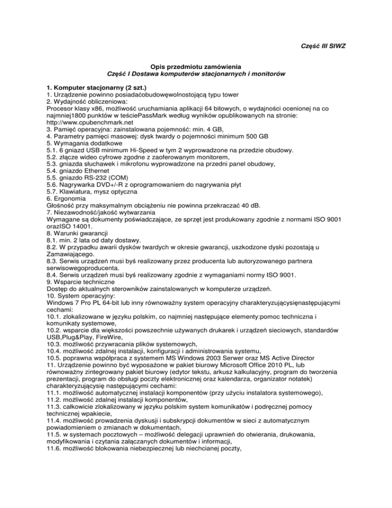 Część III SIWZ Opis przedmiotu zamówienia Część I Dostawa komputerów stacjonarnych i monitorów 1. Komputer stacjonarny (2 szt.) 1. Urządzenie powinno posiadaćobudowęwolnostojącą typu tower 2. Wydajność obliczeniowa: Procesor klasy x86, możliwość uruchamiania aplikacji 64 bitowych, o wydajności ocenionej na co najmniej1800 punktów w teściePassMark według wyników opublikowanych na stronie: http://www.cpubenchmark.net 3. Pamięć operacyjna: zainstalowana pojemność: min. 4 GB, 4. Parametry pamięci masowej: dysk twardy o pojemności minimum 500 GB 5. Wymagania dodatkowe 5.1. 6 gniazd USB minimum Hi-Speed w tym 2 wyprowadzone na przedzie obudowy. 5.2. złącze wideo cyfrowe zgodne z zaoferowanym monitorem, 5.3. gniazda słuchawek i mikrofonu wyprowadzone na przedni panel obudowy, 5.4. gniazdo Ethernet 5.5. gniazdo RS-232 (COM) 5.6. Nagrywarka DVD+/-R z oprogramowaniem do nagrywania płyt 5.7. Klawiatura, mysz optyczna 6. Ergonomia Głośność przy maksymalnym obciążeniu nie powinna przekraczać 40 dB. 7. Niezawodność/jakość wytwarzania Wymagane są dokumenty poświadczające, ze sprzęt jest produkowany zgodnie z normami ISO 9001 orazISO 14001. 8. Warunki gwarancji 8.1. min. 2 lata od daty dostawy. 8.2. W przypadku awarii dysków twardych w okresie gwarancji, uszkodzone dyski pozostają u Zamawiającego. 8.3. Serwis urządzeń musi byś realizowany przez producenta lub autoryzowanego partnera serwisowegoproducenta. 8.4. Serwis urządzeń musi byś realizowany zgodnie z wymaganiami normy ISO 9001. 9. Wsparcie techniczne Dostęp do aktualnych sterowników zainstalowanych w komputerze urządzeń. 10. System operacyjny: Windows 7 Pro PL 64-bit lub inny równoważny system operacyjny charakteryzującysięnastępującymi cechami: 10.1. zlokalizowane w języku polskim, co najmniej następujące elementy:pomoc techniczna i komunikaty systemowe, 10.2. wsparcie dla większości powszechnie używanych drukarek i urządzeń sieciowych, standardów USB,Plug&Play, FireWire, 10.3. możliwość przywracania plików systemowych, 10.4. możliwość zdalnej instalacji, konfiguracji i administrowania systemu, 10.5. poprawna współpraca z systemem MS Windows 2003 Serwer oraz MS Active Director 11. Urządzenie powinno być wyposażone w pakiet biurowy Microsoft Office 2010 PL, lub równoważny zintegrowany pakiet biurowy (edytor tekstu, arkusz kalkulacyjny, program do tworzenia prezentacji, program do obsługi poczty elektronicznej oraz kalendarza, organizator notatek) charakteryzującysię następującymi cechami: 11.1. możliwość automatycznej instalacji komponentów (przy użyciu instalatora systemowego), 11.2. możliwość zdalnej instalacji komponentów, 11.3. całkowicie zlokalizowany w języku polskim system komunikatów i podręcznej pomocy technicznej wpakiecie, 11.4. możliwość prowadzenia dyskusji i subskrypcji dokumentów w sieci z automatycznym powiadomieniem o zmianach w dokumentach, 11.5. w systemach pocztowych – możliwość delegacji uprawnień do otwierania, drukowania, modyfikowania i czytania załączanych dokumentów i informacji, 11.6. możliwość blokowania niebezpiecznej lub niechcianej poczty, 11.7. współpraca z systemem MS Exchange, w tym odbiór poczty, możliwość udostępniania kalendarzadla innych użytkowników 11.8. wsparcie dla formatu XML w podstawowych aplikacjach, 11.9. możliwość nadawania uprawnień do modyfikacji i formatowania dokumentów lub ich fragmentów, 11.10. automatyczne przesyłanie poczty na podstawie reguł, automatyczne odpowiedzi, 11.11. automatyczne wypisywanie hyperlinków, 11.12. możliwość automatycznego odświeżania danych pochodzących z Internetu w arkuszach kalkulacyjnych, 11.13. możliwość dodawania do dokumentów i arkuszy kalkulacyjnych podpisów cyfrowych, pozwalającychna stwierdzenie czy dany dokument/arkusz pochodzi z bezpiecznego źródła i nie został w żadensposób zmieniony, 11.14. możliwość zaszyfrowania danych w dokumentach i arkuszach kalkulacyjnych zgodnie ze standardemCryptoAPI, 11.15. możliwość automatycznego odzyskiwania dokumentów i arkuszy kalkulacyjnych w wypadku odcięciadopływu prądu. 11.16. prawidłowe odczytywanie i zapisywanie danych w dokumentach w formatach: .DOC, .DOCX, XLS,.XLSX, PPS, PPSX, w tym obsługa formatowania, makr, formuł, formularzy w plikach wytworzonychw MS Office 2007, MS Office 2010 2. monitor LCD 21.5” (szt. 2) 1. Urządzenie powinno posiadaćwielkość ekranu o przekątnej minimum 21.5" 2. Urządzenie powinno posiadać rozdzielczość min. 1920x1080 3. Urządzenie powinno posiadać przynajmniej po jednym złączu sygnałowym DVI, D-Sub 15 pin, 4. Urządzenie powinno umożliwiać regulacje kata pochylenia, obrotu oraz regulacje wysokości 5. Urządzenie powinno umożliwiać regulacje koloru w zakresie : jasności, kontrastu, temperatury, gammy,nasycenia, odcieni, wzmocnienia 6. Urządzenie powinno posiadać przynajmniej dwa głośniki, wejście sygnałowe oraz wyjście słuchawkowe.