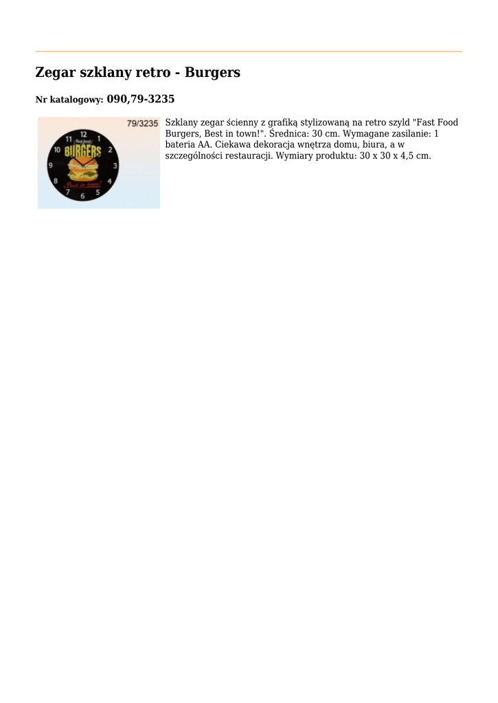 Zegar szklany retro - Burgers Nr katalogowy: 090,79-3235 Szklany zegar ścienny z grafiką stylizowaną na retro szyld "Fast Food Burgers, Best in town!". Średnica: 30 cm. Wymagane zasilanie: 1 bateria AA. Ciekawa dekoracja wnętrza domu, biura, a w szczególności restauracji. Wymiary produktu: 30 x 30 x 4,5 cm.
