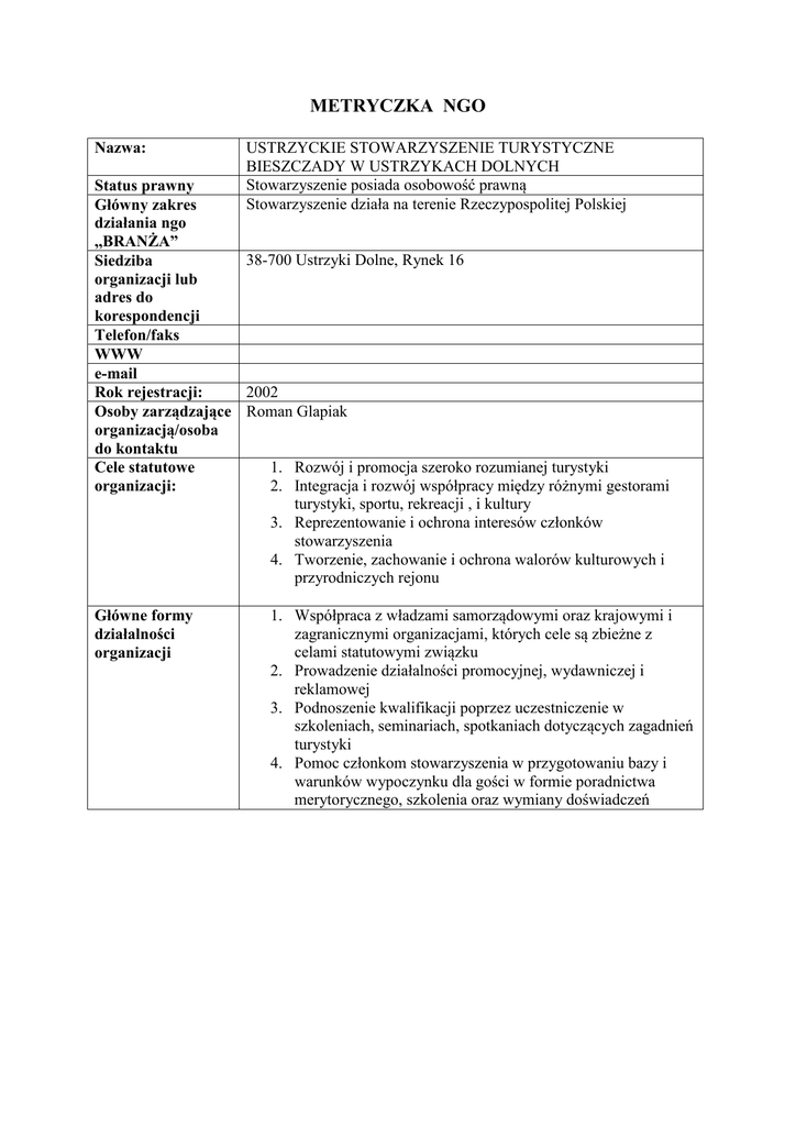 METRYCZKA NGO Nazwa: USTRZYCKIE STOWARZYSZENIE TURYSTYCZNE BIESZCZADY W USTRZYKACH DOLNYCH Stowarzyszenie posiada osobowość prawną Stowarzyszenie działa na terenie Rzeczypospolitej Polskiej Status prawny Główny zakres działania ngo ,,BRANŻA” 38-700 Ustrzyki Dolne, Rynek 16 Siedziba organizacji lub adres do korespondencji Telefon/faks WWW e-mail 2002 Rok rejestracji: Osoby zarządzające Roman Glapiak organizacją/osoba do kontaktu 1. Rozwój i promocja szeroko rozumianej turystyki Cele statutowe 2. Integracja i rozwój współpracy między różnymi gestorami organizacji: turystyki, sportu, rekreacji , i kultury 3. Reprezentowanie i ochrona interesów członków stowarzyszenia 4. Tworzenie, zachowanie i ochrona walorów kulturowych i przyrodniczych rejonu Główne formy działalności organizacji 1. Współpraca z władzami samorządowymi oraz krajowymi i zagranicznymi organizacjami, których cele są zbieżne z celami statutowymi związku 2. Prowadzenie działalności promocyjnej, wydawniczej i reklamowej 3. Podnoszenie kwalifikacji poprzez uczestniczenie w szkoleniach, seminariach, spotkaniach dotyczących zagadnień turystyki 4. Pomoc członkom stowarzyszenia w przygotowaniu bazy i warunków wypoczynku dla gości w formie poradnictwa merytorycznego, szkolenia oraz wymiany doświadczeń
