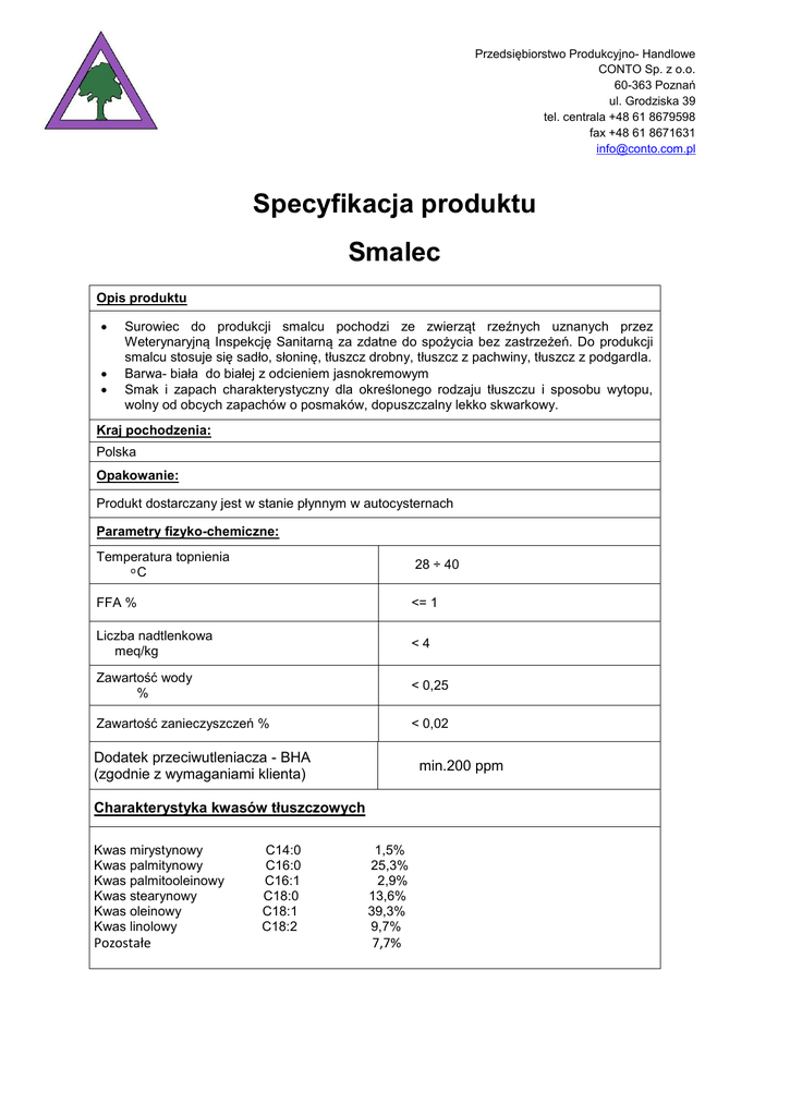 Przedsiębiorstwo Produkcyjno- Handlowe CONTO Sp. z o.o. 60-363 Poznań ul. Grodziska 39 tel. centrala +48 61 8679598 fax +48 61 8671631 [email protected] Specyfikacja produktu Smalec Opis produktu Surowiec do produkcji smalcu pochodzi ze zwierząt rzeźnych uznanych przez Weterynaryjną Inspekcję Sanitarną za zdatne do spożycia bez zastrzeżeń. Do produkcji smalcu stosuje się sadło, słoninę, tłuszcz drobny, tłuszcz z pachwiny, tłuszcz z podgardla. Barwa- biała do białej z odcieniem jasnokremowym Smak i zapach charakterystyczny dla określonego rodzaju tłuszczu i sposobu wytopu, wolny od obcych zapachów o posmaków, dopuszczalny lekko skwarkowy. Kraj pochodzenia: Polska Opakowanie: Produkt dostarczany jest w stanie płynnym w autocysternach Parametry fizyko-chemiczne: Temperatura topnienia ͦC 28 ÷ 40 FFA % <= 1 Liczba nadtlenkowa meq/kg <4 Zawartość wody % < 0,25 Zawartość zanieczyszczeń % < 0,02 Dodatek przeciwutleniacza - BHA (zgodnie z wymaganiami klienta) min.200 ppm Charakterystyka kwasów tłuszczowych Kwas mirystynowy Kwas palmitynowy Kwas palmitooleinowy Kwas stearynowy Kwas oleinowy Kwas linolowy Pozostałe C14:0 C16:0 C16:1 C18:0 C18:1 C18:2 1,5% 25,3% 2,9% 13,6% 39,3% 9,7% 7,7%