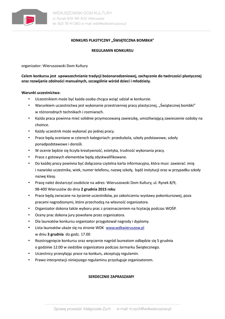 KONKURS PLASTYCZNY „ŚWIĄTECZNA BOMBKA” REGULAMIN KONKURSU organizator: Wieruszowski Dom Kultury Celem konkursu jest upowszechnianie tradycji bożonarodzeniowej, zachęcenie do twórczości plastycznej oraz rozwijanie zdolności manualnych, szczególnie wśród dzieci i młodzieży. Warunki uczestnictwa: • Uczestnikiem może być każda osoba chcąca wziąć udział w konkursie. • Warunkiem uczestnictwa jest wykonanie przestrzennej pracy plastycznej, „Świątecznej bombki” w różnorodnych technikach i rozmiarach. • Każda praca powinna mieć solidnie przymocowaną zawieszkę, umożliwiającą zawieszenie ozdoby na choince. • Każdy uczestnik może wykonać po jednej pracy. • Prace będą oceniane w czterech kategoriach: przedszkola, szkoły podstawowe, szkoły ponadpodstawowe i dorośli. • W ocenie będzie się liczyła kreatywność, estetyka, trudność wykonania pracy. • Prace z gotowych elementów będą zdyskwalifikowane. • Do każdej pracy powinna być dołączona czytelna karta informacyjna, która musi zawierać: imię i nazwisko uczestnika, wiek, numer telefonu, nazwę szkoły, bądź instytucji oraz w przypadku szkoły nazwę klasy. • Pracę należ dostarczyć osobiście na adres: Wieruszowski Dom Kultury, ul. Rynek 8/9, 98-400 Wieruszów do dnia 2 grudnia 2015 roku • Prace będą zwracane na życzenie uczestników, po zakończeniu wystawy pokonkursowej, poza pracami nagrodzonymi, które przechodzą na własność organizatora. • Organizator dokona także wyboru prac z przeznaczeniem na licytację podczas WOŚP. • Oceny prac dokona jury powołane przez organizatora. • Dla laureatów konkursu organizator przygotował nagrody i dyplomy. • Lista laureatów ukaże się na stronie WDK www.wdkwieruszow.pl w dniu 3 grudnia do godz. 17.00 • Rozstrzygnięcie konkursu oraz wręczenie nagród laureatom odbędzie się 5 grudnia o godzinie 12:00 w siedzibie organizatora podczas Jarmarku Świątecznego. • Uczestnicy przesyłając prace na konkurs, akceptują regulamin. • Prawo interpretacji niniejszego regulaminu przysługuje organizatorom. SERDECZNIE ZAPRASZAMY _______________________________________________________________________________________________________ Sprawę prowadzi: Małgorzata Zych e-mail: [email protected]