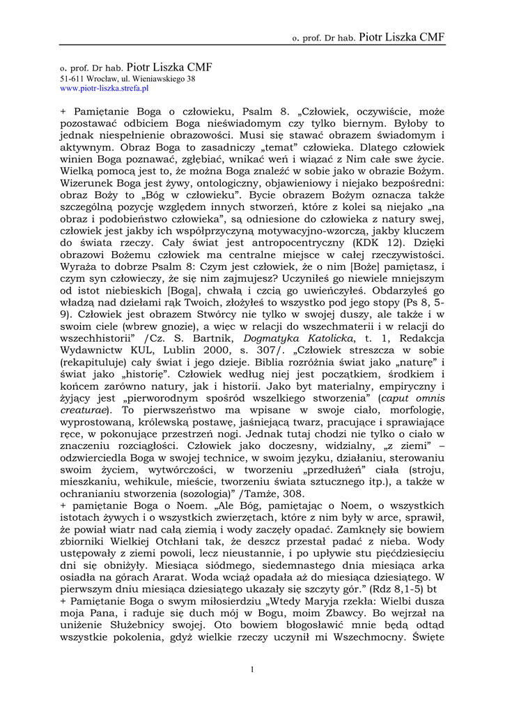 o. prof. Dr hab. Piotr Liszka CMF o. prof. Dr hab. Piotr Liszka CMF 51-611 Wrocław, ul. Wieniawskiego 38 www.piotr-liszka.strefa.pl + Pamiętanie Boga o człowieku, Psalm 8. „Człowiek, oczywiście, może pozostawać odbiciem Boga nieświadomym czy tylko biernym. Byłoby to jednak niespełnienie obrazowości. Musi się stawać obrazem świadomym i aktywnym. Obraz Boga to zasadniczy „temat” człowieka. Dlatego człowiek winien Boga poznawać, zgłębiać, wnikać weń i wiązać z Nim całe swe życie. Wielką pomocą jest to, że można Boga znaleźć w sobie jako w obrazie Bożym. Wizerunek Boga jest żywy, ontologiczny, objawieniowy i niejako bezpośredni: obraz Boży to „Bóg w człowieku”. Bycie obrazem Bożym oznacza także szczególną pozycję względem innych stworzeń, które z kolei są niejako „na obraz i podobieństwo człowieka”, są odniesione do człowieka z natury swej, człowiek jest jakby ich współprzyczyną motywacyjno-wzorczą, jakby kluczem do świata rzeczy. Cały świat jest antropocentryczny (KDK 12). Dzięki obrazowi Bożemu człowiek ma centralne miejsce w całej rzeczywistości. Wyraża to dobrze Psalm 8: Czym jest człowiek, że o nim [Boże] pamiętasz, i czym syn człowieczy, że się nim zajmujesz? Uczyniłeś go niewiele mniejszym od istot niebieskich [Boga], chwałą i czcią go uwieńczyłeś. Obdarzyłeś go władzą nad dziełami rąk Twoich, złożyłeś to wszystko pod jego stopy (Ps 8, 59). Człowiek jest obrazem Stwórcy nie tylko w swojej duszy, ale także i w swoim ciele (wbrew gnozie), a więc w relacji do wszechmaterii i w relacji do wszechhistorii” /Cz. S. Bartnik, Dogmatyka Katolicka, t. 1, Redakcja Wydawnictw KUL, Lublin 2000, s. 307/. „Człowiek streszcza w sobie (rekapituluje) cały świat i jego dzieje. Biblia rozróżnia świat jako „naturę” i świat jako „historię”. Człowiek według niej jest początkiem, środkiem i końcem zarówno natury, jak i historii. Jako byt materialny, empiryczny i żyjący jest „pierworodnym spośród wszelkiego stworzenia” (caput omnis creaturae). To pierwszeństwo ma wpisane w swoje ciało, morfologię, wyprostowaną, królewską postawę, jaśniejącą twarz, pracujące i sprawiające ręce, w pokonujące przestrzeń nogi. Jednak tutaj chodzi nie tylko o ciało w znaczeniu rozciągłości. Człowiek jako doczesny, widzialny, „z ziemi” – odzwierciedla Boga w swojej technice, w swoim języku, działaniu, sterowaniu swoim życiem, wytwórczości, w tworzeniu „przedłużeń” ciała (stroju, mieszkaniu, wehikule, mieście, tworzeniu świata sztucznego itp.), a także w ochranianiu stworzenia (sozologia)” /Tamże, 308. + pamiętanie Boga o Noem. „Ale Bóg, pamiętając o Noem, o wszystkich istotach żywych i o wszystkich zwierzętach, które z nim były w arce, sprawił, że powiał wiatr nad całą ziemią i wody zaczęły opadać. Zamknęły się bowiem zbiorniki Wielkiej Otchłani tak, że deszcz przestał padać z nieba. Wody ustępowały z ziemi powoli, lecz nieustannie, i po upływie stu pięćdziesięciu dni się obniżyły. Miesiąca siódmego, siedemnastego dnia miesiąca arka osiadła na górach Ararat. Woda wciąż opadała aż do miesiąca dziesiątego. W pierwszym dniu miesiąca dziesiątego ukazały się szczyty gór.” (Rdz 8,1-5) bt + Pamiętanie Boga o swym miłosierdziu „Wtedy Maryja rzekła: Wielbi dusza moja Pana, i raduje się duch mój w Bogu, moim Zbawcy. Bo wejrzał na uniżenie Służebnicy swojej. Oto bowiem błogosławić mnie będą odtąd wszystkie pokolenia, gdyż wielkie rzeczy uczynił mi Wszechmocny. Święte 1 o. prof. Dr hab. Piotr Liszka CMF jest Jego imię a swoje miłosierdzie na pokolenia i pokolenia [zachowuje] dla tych, co się Go boją. On przejawia moc ramienia swego, rozprasza [ludzi] pyszniących się zamysłami serc swoich. Strąca władców z tronu, a wywyższa pokornych. Głodnych nasyca dobrami, a bogatych z niczym odprawia. Ujął się za sługą swoim, Izraelem, pomny na miłosierdzie swoje - jak przyobiecał naszym ojcom - na rzecz Abrahama i jego potomstwa na wieki. Maryja pozostała u niej około trzech miesięcy; potem wróciła do domu” (Łk 1, 4556). + Pamiętanie człowieka po śmierci tylko do jakiegoś czasu. „Mylnie rozumując, mówili sobie: Nasze życie jest krótkie i smutne. Nie ma lekarstwa na śmierć człowieczą, nie znamy nikogo, kto by wrócił z Otchłani. Urodziliśmy się niespodzianie i potem będziemy, jakby nas nigdy nie było. Dech w nozdrzach naszych jak dym, myśl jak iskierka z uderzeń serca naszego: gdy ona zgaśnie, ciało obróci się w popiół, a duch się rozpłynie jak niestałe powietrze. Imię nasze pójdzie z czasem w niepamięć i nikt nie wspomni naszych poczynań. Przeminie życie nasze jakby ślad obłoku i rozwieje się jak mgła, ścigana promieniami słońca i żarem jego przybita. Czas nasz jak cień przemija, śmierć nasza nie zna odwrotu: pieczęć przyłożono, i nikt nie powraca. Nuże więc! Korzystajmy z tego, co dobre, skwapliwie używajmy świata w młodości! Upijmy się winem wybornym i wonnościami i niech nam nie ujdą wiosenne kwiaty: uwijmy sobie wieniec z róż, zanim zwiędną. Nikogo z nas braknąć nie może w swawoli, wszędzie zostawmy ślady uciechy: bo to nasz dział, nasze dziedzictwo! Udręczmy sprawiedliwego biedaka, nie oszczędźmy wdowy ani wiekowej siwizny starca nie uczcijmy! Nasza siła będzie nam prawem sprawiedliwości, bo to, co słabe, gani się jako nieprzydatne. Zróbmy zasadzkę na sprawiedliwego, bo nam niewygodny: sprzeciwia się naszym sprawom, zarzuca nam łamanie prawa, wypomina nam błędy naszych obyczajów. Chełpi się, że zna Boga, zwie siebie dzieckiem Pańskim. Jest potępieniem naszych zamysłów, sam widok jego jest dla nas przykry, bo życie jego niepodobne do innych i drogi jego odmienne. Uznał nas za coś fałszywego i stroni od dróg naszych jak od nieczystości. Kres sprawiedliwych ogłasza za szcz