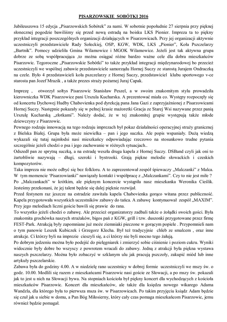 PISARZOWSKIE SOBÓTKI 2016 Jubileuszowa 15 edycja „Pisarzowskich Sobótek” za nami. W sobotnie popołudnie 27 sierpnia przy pięknej słonecznej pogodzie bawiliśmy się przed nową estradą na boisku LKS Pionier. Impreza ta to piękny przykład integracji poszczególnych organizacji działających w Pisarzowicach. Przy jej organizacji aktywnie uczestniczyli przedstawiciele Rady Sołeckiej, OSP, KGW, WDK, LKS „Pionier”, Koła Pszczelarzy „Bartnik”. Pomocy udzieliła Gmina Wilamowice i MGOK Wilamowice. Jeżeli jest tak aktywna grupa dobrze ze sobą współpracująca ,to można osiągać różne bardzo ważne cele dla dobra mieszkańców Pisarzowic. Tegoroczne „Pisarzowskie Sobótki” to także przykład integracji międzynarodowej bo przecież uczestniczyli we wspólnej zabawie przedstawiciele samorządu Hornej Suczy ze starostą Jurajem Ondraczką na czele. Było 4 przedstawicieli koła pszczelarzy z Hornej Suczy, przedstawiciel klubu sportowego v-ce starosta pan Jozef Mrazik , a także prezes straży pożarnej Juraj Capak. Imprezę , otworzył sołtys Pisarzowic Stanisław Peszel, a w swoim znakomitym stylu prowadziła kierowniczka WDK Pisarzowice pani Urszula Kucharska. A prezentować miała co. Występy rozpoczęły się od koncertu Dychowej Hudby Chabovienka pod dyrekcją pana Jana Gazi z zaprzyjaźnionej z Pisarzowicami Hornej Suczy. Następnie pokazały się w pełnej krasie mażoretki Gracja ze Starej Wsi nazywane przez panią Urszulę Kucharską „złotkami”. Należy dodać, że w tej znakomitej grupie występują także młode dziewczyny z Pisarzowic. Pewnego rodzaju innowacją na tego rodzaju imprezach był pokaz działalności operacyjnej straży granicznej z Bielska Białej. Grupa była może niewielka – pan i jego suczka. Ale popis wspaniały. Dużą wiedzą wykazali się tutaj najmłodsi nasi mieszkańcy odpowiadając rzeczowo na stosunkowo trudne pytania szczególnie jeżeli chodzi o psa i jego zachowanie w różnych sytuacjach.. Odszedł pan ze sprytną suczką, a na estradę weszła druga kapela z Hornej Suczy. DSBand czyli jak oni to żartobliwie nazywają – długi, szeroki i bystrooki. Grają piękne melodie słowackich i czeskich kompozytorów. Taka impreza nie może odbyć się bez folkloru. A to zaprezentował zespół śpiewaczy „Malczanki” z Malca. W tym momencie ‘Pisarzowianki” nawiązały kontakt i współpracę z „Malczankami”. Czy to nie jest miłe ? Po „Malczankach” w krótkim, ale pięknym koncercie wystąpiła nasz mieszkanka Weronika Cieślik. Jesteśmy przekonani, że jej talent będzie się dalej pięknie rozwijał. Przed festynem raz jeszcze na estradzie zawitała kapela Chabovienka gorąco witana przez publiczność. Kapela przygotowała wszystkich uczestników zabawy do tańca. A zabawę kontynuował zespół „MAXIM”. Przy jego melodiach liczni goście bawili się prawie do rana. To wszystko jeżeli chodzi o zabawę. Ale przecież organizatorzy zadbali także o żołądki swoich gości. Była znakomita grochówka naszych strażaków, bigos pań z KGW, grill i tzw. duszonki przygotowane przez firmę FEST-Park. Atrakcją były zapomniane już może ziemniaki pieczone w gorącym popiele . Przypomnieli nam o tym panowie Leszek Kubiczek i Grzegorz Klecha. Był też tradycyjnie chleb ze smalcem , oraz inne atrakcje. Ci którzy byli na imprezie cieszyli się, a ci którzy nie byli mocno tego żałują. Po dobrym jedzeniu można było podejść do pielęgniarek i zmierzyć sobie ciśnienie i poziom cukru. Wyniki widocznie były dobre bo wszyscy z powrotem wracali do zabawy. Jedną z atrakcji była piękna wystawa naszych pszczelarzy. Można było zobaczyć w szklanym ulu jak pracują pszczoły, zakupić miód lub inne artykuły pszczelarskie. Zabawa była do godziny 4.00. A w niedzielę rano uczestnicy w dobrej formie uczestniczyli we mszy św. o godz. 10.00. Modlili się razem z mieszkańcami Pisarzowic nasi goście ze Słowacji, a po mszy św. pokazali jak to jest u nich na Słowacji bywa. Na stopniach kościoła był piękny koncert dla wychodzących z kościoła mieszkańców Pisarzowic. Koncert dla mieszkańców, ale także dla księdza nowego wikarego Adama Wandzla, dla którego była to pierwsza msza św. w Pisarzowicach. Po takim przyjęciu ksiądz Adam będzie się czuł jak u siebie w domu, a Pan Bóg Miłosierny, który cały czas pomaga mieszkańcom Pisarzowic, jemu również będzie pomagał. Księże Adamie Szczęść Boże i obfitości jego łask w tej posłudze kapłańskiej. A po mszy św. i wspólnym obiedzie pozostało nam tylko serdecznie podziękować naszym słowackim przyjaciołom i powiedzieć do zobaczenia. I drodzy państwo trudno pominąć milczeniem podziękowanie jakie otrzymaliśmy od władz samorządowych Hornej Suczy, a są one w języku oryginalnym. Pan Stanislav PESZEL . Ďakujeme vám veľmi pekne za krasne stráveny pobyt u Vas w Pisarzowicach. Bolo nám super, ste mili ludia a radi ku Vam chodime. Ďakujemy za všetko, za pohostinnosť. Ďakujem ešte raz, už teraz sa tešime o rok. ĎAKUJEME - ste super ĽUDIA. Czy nie jest to wspaniałe jak otrzymuje się takie podziękowanie. ? Oceńcie Państwo sami. Sołtys Pisarzowic Stanisław PESZEL Przewodnicząca KGW Cecylia PUZOŃ