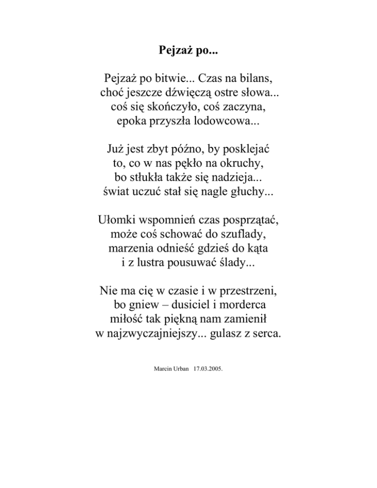 Pejzaż po... Pejzaż po bitwie... Czas na bilans, choć jeszcze dźwięczą ostre słowa... coś się skończyło, coś zaczyna, epoka przyszła lodowcowa... Już jest zbyt późno, by posklejać to, co w nas pękło na okruchy, bo stłukła także się nadzieja... świat uczuć stał się nagle głuchy... Ułomki wspomnień czas posprzątać, może coś schować do szuflady, marzenia odnieść gdzieś do kąta i z lustra pousuwać ślady... Nie ma cię w czasie i w przestrzeni, bo gniew – dusiciel i morderca miłość tak piękną nam zamienił w najzwyczajniejszy... gulasz z serca. Marcin Urban 17.03.2005.