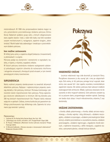 niesteroidowych. W 1990 roku przeprowadzono badania mające na celu potwierdzenie przeciwbólowego działania pokrzywy (Urtica Doica). Badaniom poddano grupę osób, u których zdiagnozowano stany zapalne stawów i kości, a także bóle dysku oraz bóle wywołane urazami mechanicznymi tj. naciągnięcie, zapalenie ścięgien, „łokieć tenisisty”. Wyniki badań były zadawalające i świadczące o przeciwbólowym działaniu pokrzywy. Pokrzywa Inne możliwe zastosowania W infekcji jamy ustnej, w zapaleniu dziąseł (zwłaszcza z krwawieniami), w pleśniawkach i w anginie. Pokrzywę podaje się zewnętrznie i wewnętrznie w wypryskach, trądziku, w łupieżu, w łojotoku, wypadaniu włosów. W liściach pokrzywy stwierdzono niedawno występowanie substancji pobudzającej organizm człowieka do wytwarzania interferonu i antygenów wirusowych, chroniących przed wirusami, w tym również powodującymi zmiany nowotworowe. SUPLEMENTACJA Należy wybierać preparaty standaryzowane na zawartość aktywnych składników pokrzywy. Najlepsze i najskuteczniejsze preparaty zawierają ekstrakty z liści pokrzywy, minimum 1% kwasu krzemowego i jednocześnie świeże nieprzetworzone liście pokrzywy. Porcja zapewniająca skuteczne oddziaływanie to minimum 250 mg ekstraktu plus 200 mg świeżych nieprzetworzonych liści. Preparat należy nabywać wyłącznie w aptekach. Szklana, ciemna buteleczka jest gwarantem stabilnego przechowywania tego delikatnego zioła. Zapewnia też utrzymanie jego świeżości i potencji. Piśmiennictwo: 1. Castleman M, The Healing Herbs, Bantam Books, New York, 1991. 2. „Uzdrawiająca moc witamin, minerałów i ziół”, Przegląd Reader’s Digest 2000. 3. M. Pieszak, P. Mikołajczak „Właściwości lecznicze pokrzywy zwyczajnej”. Postępy Fitoterapii 4/2010. 4. H. Milczarek-Szałkowska „Pokrzywa zwyczajna o niezwyczajnych właściwościach” Wiadomości Zielarskie 6/1999. WIADOMOŚCI OGÓLNE Lecznicze właściwości tego zioła doceniali już starożytni Grecy. Początkowo stosowano je aby usunąć jad z rany po ukąszeniach węża. Dziś wiemy, że liść pokrzywy pomaga leczyć wypryski, katar sienny oraz usuwać ból i stan zapalny wywołany reumatoidalnym zapaleniem stawów. Od wieków pokrzywa była ludowym środkiem zwalczającym bóle artretyczne. Okłady z pokrzywy stosowano też do usuwania ze skóry trujących substancji. Liście pokrzywy uważane są też za pożywne danie, przypominające smakiem szpinak. Zawierają one bardzo dużo żelaza i innych mikroelementów, witaminę C oraz karotenoidy. MOŻLIWE ZASTOSOWANIA: choroby układu pokarmowego, choroby układu sercowo-naczyniowego, choroby wątroby i dróg żółciowych, działanie moczopędne, działanie oczyszczające, działanie przeciwalergiczne (katar sienny), działnie przeciwbólowe w zwyrodnieniu stawów, działanie przeciwzapalne, działanie regenerujące, łagodzenie chorób skórnych, nadmierne krwawienia, obfite miesiączki, zapalenie stawów, zatrzymanie płynów, obrzęki kończyn dolnych. DZIAŁANIE OGÓLNE Pokrzywa działa na cały organizm odżywczo, witaminizująco, mineralizująco, wzmacniająco, stymulująco, regulująco, regenerująco i oczyszczająco. Pokrzywa działa korzystnie na przemianę materii, wykazuje działanie oczyszczające krew, które wynika ze stymulacji krążenia, działa lekko moczopędnie, a dzięki hamowaniu resorbcji zwrotnej wyraźnie zwiększa eliminację chlorków, mocznika i innych szkodliwych produktów przemiany materii. Pokrzywa dostarcza dużo różnorodnych pierwiastków śladowych, które są składnikami enzymów i hormonów, odpowiadających za prawidłowy przebieg procesów fizjologicznych w organizmie. Choroby krwi i układu krążenia Przede wszystkim liście pokrzywy są stosowane w chorobach krwi i w niedokrwistości, w blednicy, w białaczce, w krwawieniach wszelkiego rodzaju, zbyt obfitych krwawieniach miesiączkowych, w krwawieniach z żołądka, jelit, nosa. W problemach z ciśnieniem krwi, w przypadku zwężenia naczyń krwionośnych, również wieńcowych, w miażdżycy, w niewydolności serca. Działanie moczopędne Pokrzywa jest środkiem moczopędnym, czyli pomaga organizmowi pozbyć się zbędnych płynów. U osób cierpiących na infekcję dróg moczowych wzmaga oddawanie moczu, co sprzyja wypłukiwaniu z organizmu bakterii wywołujących infekcje. Pewną ulgę po zażyciu preparatów z pokrzywy odczuwają kobiety cierpiące na wzdęcia tuz przed miesiączką. Działanie oczyszczające Pokrzywę stosuje się jako środek oczyszczający w złej przemianie materii, w zakwaszeniu krwi, w alergii, w nieprawidłowym funkcjonowaniu nerek, zapaleniu dróg moczowych, w niedostatecznym wydalaniu moczu, w kamnicy moczowej i skazie moczanowej. Działanie ogólno wzmacniające Pokrzywę stosuje się jako środek wzmacniający w przypadku: wyczerpania, znużenia, uporczywych bóli głowy, łatwego męczenia się związanego z przepracowaniem, w okresie rekonwalescencji w związku z przebytymi chorobami, w przypadku osłabienia organizmu, spadku odporności i częstych infekcjach wszelkiego rodzaju. Choroby przewodu pokarmowego Pomaga w chorobach przewodu pokarmowego: nieżytach, stanach zapalnych, biegunkach, w skurczach brzucha, w zwyrodnieniu błony śluzowej żołądka, we wrzodach żołądka i jelit (szczególnie krwawiących), w chorobach wątroby i dróg żółciowych oraz chorobach śledziony. Katar sienny Liście pokrzywy posiadają dowiedzione i wypróbowane właściwości łagodzenia objawów kataru siennego. Kiedy organizm zostaje podrażniony pyłkami i innymi alergenami zaczyna wytwarzać histaminę, która wywołuje stan zapalny objawiający się silnym katarem i łzawieniem oczu. Pokrzywa jest doskonałym źródłem kwercetyny- flawonoidu, który hamuje działanie histaminy. W badaniach dotyczących tego wpływu stwierdzono, iż ponad 50% pacjentów uznała, że pokrzywa średnio lub bardzo skutecznie łagodzi objawy alergic