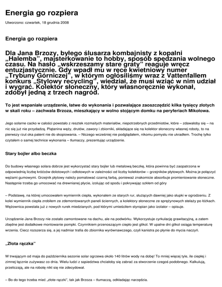 Energia go rozpiera Utworzono: czwartek, 18 grudnia 2008 Energia go rozpiera Dla Jana Brzozy, byłego ślusarza kombajnisty z kopalni „Halemba”, majsterkowanie to hobby, sposób spędzania wolnego czasu. Na hasło „wskrzeszamy stare graty” reaguje wręcz entuzjastycznie. Gdy wpadł mu w ręce kwietniowy numer „Trybuny Górniczej”, w którym ogłosiliśmy wraz z Vattenfallem konkurs „Stylowy recycling”, wiedział, że musi wziąć w nim udział i wygrać. Kolektor słoneczny, który własnoręcznie wykonał, zdobył jedną z trzech nagród. To jest wspaniałe urządzenie, łatwe do wykonania i pozwalające zaoszczędzić kilka tysięcy złotych w skali roku – zachwala Brzoza, mieszkający w wolno stojącym domku na peryferiach Mikołowa. Jego solarne cacko w całości powstało z resztek rozmaitych materiałów, niepotrzebnych przedmiotów, które – zdawałoby się – na nic się już nie przydadzą. Plątanina węży, drutów, zawory i zbiorniki, składające się na kolektor słoneczny własnej roboty, to na pierwszy rzut oka patent nie do skopiowania. – Niczego wcześniej nie podglądałem, nikomu pomysłu nie ukradłem. Trochę tylko czytałem o samej technice wykonania – tłumaczy, prezentując urządzenie. Stary bojler albo beczka Do budowy własnego solara dobrze jest wykorzystać stary bojler lub metalową beczkę, która powinna być zaopatrzona w odpowiednią liczbę króćców dolotowych i odlotowych w zależności od liczby kolektorów – grzejników płytowych. Można je połączyć wężami gumowymi. Grzejnik płytowy należy pomalować czarną farbą, ponieważ znakomicie absorbuje promieniowanie słoneczne. Następnie trzeba go umocować na drewnianej płycie, izolując od spodu i pokrywając szkłem od góry – Podstawę, na której umocowałem wymiennik ciepła, wykonałem ze starych rur, służących dawniej jako słupki w ogrodzeniu. Z kolei wymiennik ciepła zrobiłem ze zdemontowanych paneli ściennych, a kolektory słoneczne ze sprężynowych stelaży po łóżkach. Wężownica powstała już z nowych rurek miedzianych, pod którymi umieściłem styropian jako izolator – opisuje. Urządzenie Jana Brzozy nie zostało zamontowane na dachu, ale na podwórku. Wykorzystuje cyrkulację grawitacyjną, a zatem zbędne jest dodatkowe montowanie pompki. Czynnikiem przenoszącym ciepło jest glikol. W upalne dni glikol osiąga temperaturę wrzenia. Ciecz rozszerza się, a jej nadmiar trafia do zbiornika wyrównawczego, czyli kanistra po płynie do mycia naczyń. „Złota rączka” W trwającym od maja do października sezonie solar ogrzewa około 140 litrów wody na dobę! To mniej więcej tyle, ile ciepłej i zimnej łącznie zużywasz co dnia. Wielu ludzi z sąsiedztwa chciałoby się zabrać za stworzenie czegoś podobnego. Kalkulują, przeliczają, ale na robotę nikt się nie zdecydował. – Bo do tego trzeba mieć „złote rączki”, tak jak Brzoza – tłumaczą, odkładając narzędzia. I pewnie jest w tym dużo racji. Solar nie jest bowiem pierwszym urządzeniem jakie skonstruował były ślusarz z „Halemby”. Jego główną specjalnością są pompy odwadniające wykonane z garnków. – Marzy mi się dom samowystarczalny energetycznie. To kwestia kilku najbliższych lat. Trzeba tylko zebrać odpowiednie materiały, dużo czytać i projektować. Nie ma rzeczy nie do zrobienia – zapewnia. W najbliższym czasie zamierza skonstruować kolejną pompę, tym razem ciepła. Z czego? Ze starej lodówki, ma się rozumieć... Kajetan Berezowski
