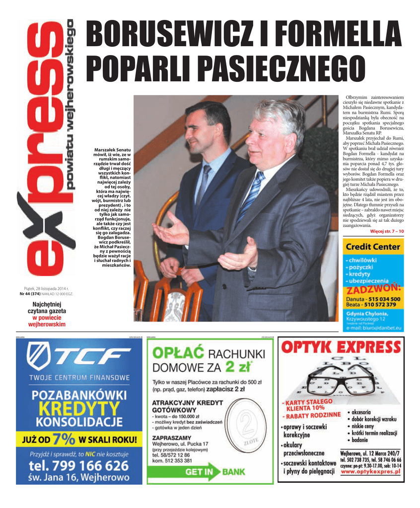 BORUSEWICZ I FORMELLA POPARLI PASIECZNEGO Marszałek Senatu mówił, iż wie, ze w rumskim samorządzie trwał dość długi i męczący wszystkich konflikt, natomiast najwięcej zależy od tej osoby, która ma najwięcej władzy (czyt. wójt, burmistrz lub prezydent) , i to od niej zależy nie tylko jak samorząd funkcjonuje, ale także czy jest konflikt, czy raczej się go załagadza. Bogdan Borusewicz podkreślił, że Michał Pasieczny z pewnością będzie ważył racje i słuchał radnych i mieszkańców. Piątek, 28 listopada 2014 r. Nr 44 (374) NAKŁAD 12 000 EGZ. Najchętniej czytana gazeta w powiecie wejherowskim Olbrzymim zainteresowaniem cieszyło się niedawne spotkanie z Michałem Pasiecznym, kandydatem na burmistrza Rumi. Sporą niespodzianką była obecność na początku spotkania specjalnego gościa Bogdana Borusewicza, Marszałka Senatu RP. Marszałek przyjechał do Rumi, aby poprzeć Michała Pasiecznego. W spotkaniu brał udział również Bogdan Formella - kandydat na burmistrza, który mimo uzyskania poparcia ponad 4,7 tys. głosów nie dostał się do drugiej tury wyborów. Bogdan Formella oraz jego komitet także popiera w drugiej turze Michała Pasiecznego. Mieszkańcy udowodnili, że to, kto będzie rządził miastem przez najbliższe 4 lata, nie jest im obojętne. Dlatego tłumnie przyszli na spotkanie – zabrakło nawet miejsc siedzących, gdyż organizatorzy nie spodziewali się aż tak dużego zaangażowania. Więcej str. 7 – 10 pogod� Jakub W. PIĄTEK 5°C 2°C SOBOTA 6°C 3°C dzwoń: pn.-pt., 1000-1600 606 112 745 Nasz reporter czeka na Państwa zgłoszenia! 5°C 2°C PONIEDZIAŁEK 5°C 2°C WTOREK 4°C 1°C ŚRODA 3°C -2°C CZWARTEK 5°C -1°C Gratuluję Dziś o zwycięzcach. Rada Miasta Mojego Ukochanego składa się z 10 nowych (w tym trzej „recydywiści”) i 11 starych radnych. W pierwszej kolejności złożę najlepsze życzenia dobrych rządów tym, którzy już nie jedną kadencję zasiadają w ławach ratuszowych. Pan Wojciech Kozłowski – niegdyś wieloletni wiceprezio, ostatnio wice Glaza. Został sam, bo pan przewodniczący przegrał wybory. W śródmieściu pan Kozłowski wygrał, ale mocno po piętach deptał mu konkurent, pan Marcin Skowronek. Pan Bogdan Tokłowicz – od zawsze wiceprezio od spraw szkolnictwa, zdrowia, szczęścia i pomyślności. Wygrał fuksem, bo konkurentce, pani Katarzynie Potrykus zabrakło do zwycięstwa ledwie kilkanaście głosów. Tokłowicz to „recydywista”, bo przed laty radnym już był. Pan Paweł Formela – od dziecka niemalże radnym jest. Jeśli tak dalej pójdzie, to za czterdzieści lat zostanie mistrzem świata w tej konkurencji. Drugi był pan Mariusz Krawiec i bardzo mu gratuluję. Pan Henryk Kanczkowski – ma tyle lat, ile Formela będzie miał za czterdzieści właśnie. Niezatapialny. Pokonał młodego gniewnego, czyli pana Dawida Kilińskiego. Pan Henryk Jarosz – charakterystyczna postać Rady Miasta od wielu kadencji. Fachowiec od ogródków działkowych i emeryt stoczniowy. Deptał mu po piętach pan Artur Aderek. Pan Krzysztof Gajewski – syn swojego ojca. Mało na sesjach się odzywa, ale to jedna z szarych eminencji prezia. Mocno mu zagroził pan Maciej Szymański. Dotychczas wymienieni należą do Wolę Dyżur reportera NIEDZIELA Wejherowo, ci którzy w okręgach zajęli drugie miejsca, byli kandydatami Komitetu Wyborczego Platformy Obywatelskiej. Pan Czesław Kukowski – stworzył własny komitet i wprowadził z niego jednego radnego… Właśnie siebie. To też „recydywista”, bo zasiadał w Radzie dwie kadencje temu. Przegrał z nim nieznacznie pan Bartłomiej Woźniak, oczywiście z KW PO RP. Pan Marek Budnik – radny z wieloletnim doświadczeniem. Wygrywa zawsze pewnie. Tym razem wysłał na „emeryturę” pana Mieczysława Makurata z WW. Pan Jacek Gafka – lider ekipy PO, również kandydat na prezydenta. Niewiele brakowało a doszłoby do drugiej tury wyborów prezydenckich w najbliższą niedzielę. Gonił go w okręgu pan Artur Cierzniewski, ale nie dał rady. Pan Arkadiusz Szczygieł – bardzo dobry wynik w sposób całkowicie zasłużony. Jeden z najbardziej pracowitych i zawsze przygotowanych radnych. Zostawił w pobitym polu pana Andrzeja Sikorę. Pan Bartłomiej Czyżewski - ciężko pracował i został pierwszy raz w życiu radnym. Brawo, tu idzie młodość. Nie dał szans panu Wojciechowi Wasiakowskiemu. Pan Mateusz Schmidt – młody, ambitny, pracowity i chyba już dobrze przygotowany do roli radnego. Wygrał z synkiem wiceprezia Bochińskiego, panem Leszkiem. Dynastii nie będzie. Pan Tomasz Groth – największa sensacja tych wyborów. Ten młody człowiek wygrał bowiem z panią Teresą Patsidis. Pan Maciej Łukowicz – niegdyś kandydat na prezia, ostatnio wiceprzewodniczący Rady Miasta. To on wysłał na „emeryturę” pana Leszka Glazę. Pan Ryszard Kandzora – „recydywista” sprzed lat. Harcerz, działacz społeczny. Rada z pewnością będzie miała z niego pożytek. Wygrał zdecydowanie z panem Mirosławem Lademannem, który miał poparcie PIS-u i samego prezia Hildebrandta. Nie pomogło. Rafał Szlas – przedsiębiorca, niezwykle popularny i skuteczny prezes wejherow- skiego „Gryfa”. Zostawił za sobą panią Bożenę Szczypior. Ostatnia dziewiątka to kandydaci z KW PO RP. Dariusz Kreft – mocno się wystraszył konkurencji i stanął na głowie, aby wygrać. Radny z WW. Drugie miejsce zajął pan Waldemar Gafka z KW PO RP. Pan Mariusz Łupina – jedyny zupełnie nowy radny z Wolę Wejherowo. Głosowali na niego wyborcy z Fenikowskiego. Bardzo dobry wynik uzyskała tam pani Angelika Durajewska. Pan Marcin Drewa – radny z PIS-u. Mocno popierały go środowiska kościelne. Wygrał nieznacznie z kandydatem KW PO RP, panem Erwinem Hierasimczykiem. Na koniec ciekawostka. Mama i syn zostali radnymi. Pani Teresa Skowrońska z WW, a jej syn Grzegorz z PIS-u. Czyli jednak dynastia powstanie? Pani Teresa pokonała pana Piotra 