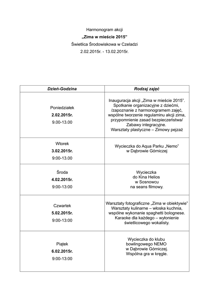 Harmonogram akcji „Zima w mieście 2015” Świetlica Środowiskowa w Czeladzi 2.02.2015r. - 13.02.2015r. Dzień-Godzina Poniedziałek 2.02.2015r. 9.00-13.00 Wtorek 3.02.2015r. Rodzaj zajęć Inauguracja akcji „Zima w mieście 2015”. Spotkanie organizacyjne z dziećmi, /zapoznanie z harmonogramem zajęć, wspólne tworzenie regulaminu akcji zima, przypomnienie zasad bezpieczeństwa/ Zabawy integracyjne. Warsztaty plastyczne – Zimowy pejzaż Wycieczka do Aqua Parku „Nemo” w Dąbrowie Górniczej 9:00-13.00 Środa 4.02.2015r. 9:00-13:00 Czwartek 5.02.2015r. 9:00-13:00 Piątek 6.02.2015r. 9:00-13:00 Wycieczka do Kina Helios w Sosnowcu na seans filmowy. Warsztaty fotograficzne „Zima w obiektywie” Warsztaty kulinarne – włoska kuchnia, wspólne wykonanie spaghetti bolognese. Karaoke dla każdego – wyłonienie świetlicowego wokalisty. Wycieczka do klubu bowlingowego NEMO w Dąbrowie Górniczej. Wspólna gra w kręgle. Poniedziałek 9.02.2015r. 9:00-13:00 Wtorek 10.02.2015r. 9:00-13:00 Środa 11.02.2015r. 9:00-13:00 Czwartek 12.02.2015r. 9:00-13:00 Piątek 13.02.2015r. 9:00-13:00 Zajęcia rytmiczno – muzyczne Ruchy Maluchy! Warsztaty wokalne – wyrażanie emocji śpiewem. Zabawy ruchowe na dworze. Origami płaskie Gry i zabawy terenowe Zajęcia relaksacyjne przy muzyce. Turniej gry w piłkarzyki. Teatromania – poznajemy tajniki sztuki aktorskiej. Akademia brudnych łapek – ugniatamy, lepimy, malujemy. Zabawy ruchowe na dworze. Warsztaty wokalno - instrumentalne Zajęcia kulinarne – zimowe kanapki Klub Malucha - projekcja filmu animowanego. Ekologiczny pokaz mody oraz fryzur karnawałowych. Malowanie twarzy. Bal karnawałowy. Akcja „Zima w mieście 2015” organizowana jest dla 25 dzieci zapisanych do Świetlicy Środowiskowej w Czeladzi. Uczestnictwo w zajęciach i wycieczkach jest bezpłatne. Dzieci mają zapewnione drugie śniadanie oraz suchy prowiant podczas wycieczek. Patrycja Kozieł - Pilarek