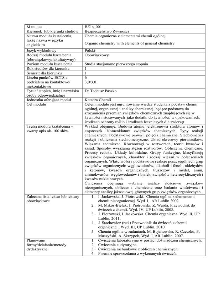 M uu_uu Kierunek lub kierunki studiów Nazwa modułu kształcenia, także nazwa w języku angielskim BZ1s_001 Bezpieczeństwo Żywności Chemia organiczna z elementami chemii ogólnej Język wykładowy Rodzaj modułu kształcenia (obowiązkowy/fakultatywny) Poziom modułu kształcenia Rok studiów dla kierunku Semestr dla kierunku Liczba punktów ECTS z podziałem na kontaktowe/ niekontaktowe Tytuł / stopień, imię i nazwisko osoby odpowiedzialnej Jednostka oferująca moduł Cel modułu Polski Obowiązkowy Treści modułu kształcenia – zwarty opis ok. 100 słów. Zalecana lista lektur lub lektury obowiązkowe Planowane formy/działania/metody dydaktyczne Organic chemistry with elements of general chemistry Studia stacjonarne pierwszego stopnia 1 1 6 3,0/3,0 Dr Tadeusz Paszko Katedra Chemii Celem modułu jest ugruntowanie wiedzy studenta z podstaw chemii ogólnej, organicznej i analizy chemicznej, będące podstawą do zrozumienia przemian związków chemicznych znajdujących się w żywności i stosowanych jako dodatki do żywności, w opakowaniach, środkach ochrony roślin i środkach leczniczych dla zwierząt. Wykład obejmuje: Budowa atomu: elektronowa struktura atomów i cząsteczek. Nomenklatura związków chemicznych. Typy reakcji chemicznych. Podstawowe prawa i pojęcia chemiczne. Stechiometria reakcji i obliczenia stechiometryczne. Układ okresowy pierwiastków. Wiązania chemiczne. Równowagi w roztworach, teorie kwasów i zasad. Sposoby wyrażania stężeń roztworów. Obliczenia chemiczne. Procesy redoks. Układy koloidalne. Grupy funkcyjne, klasyfikację związków organicznych, charakter i rodzaj wiązań w połączeniach organicznych. Właściwości i podstawowe reakcje poszczególnych grup związków organicznych: węglowodorów, alkoholi i fenoli, aldehydów i ketonów, kwasów organicznych, tłuszczów i mydeł, amin, aminokwasów, węglowodanów i białek, związków heterocyklicznych i kwasów nukleinowych. Ćwiczenia obejmują wybrane analizy ilościowe związków nieorganicznych, obliczenia chemiczne oraz badanie właściwości i elementy analizy jakościowej głównych grup związków organicznych. 1. I. Jackowska, J. Piotrowski. Chemia ogólna z elementami chemii nieorganicznej. Wyd. I, AR Lublin 2002. 2. M. Mikos-Bielak, J. Piotrowski, Z. Warda. Przewodnik do ćwiczeń z chemii. Wyd. IV, UP Lublin, 2008. 3. J. Piotrowski, I. Jackowska. Chemia organiczna. Wyd. II, UP Lublin, 2011. 4. J. Stachowicz (red.) Przewodnik do ćwiczeń z chemii organicznej., Wyd. III, UP Lublin, 2010. 5. Chemia ogólna w zadaniach. M. Bojanowska, R. Czeczko, P. Muszyński, A. Skrzypek, Wyd. I, AR Lublin, 2007. 1. Ćwiczenia laboratoryjne w postaci doświadczeń chemicznych. 2. Ćwiczenia audytoryjne. 3. Ćwiczenia rachunkowe z obliczeń chemicznych. 4. Pisemne sprawozdania z wykonanych ćwiczeń.