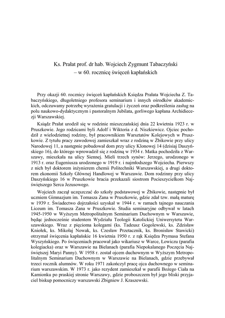 Ks. Prałat prof. dr hab. Wojciech Zygmunt Tabaczyński – w 60. rocznicę święceń kapłańskich Przy okazji 60. rocznicy święceń kapłańskich Księdza Prałata Wojciecha Z. Tabaczyńskiego, długoletniego profesora seminarium i innych ośrodków akademickich, odczuwamy potrzebę wyraŜenia gratulacji i Ŝyczeń oraz podkreślenia zasług na polu naukowo-dydaktycznym i pastoralnym Jubilata, gorliwego kapłana Archidiecezji Warszawskiej. Ksiądz Prałat urodził się w rodzinie mieszczańskiej dnia 22 kwietnia 1923 r. w Pruszkowie. Jego rodzicami byli Adolf i Wiktoria z d. Niszkiewicz. Ojciec pochodził z wielodzietnej rodziny, był pracownikiem Warsztatów Kolejowych w Pruszkowie. Z tytułu pracy zawodowej zamieszkał wraz z rodziną w śbikowie przy ulicy Narodowej 11, a następnie pobudował dom przy ulicy Klonowej 14 (dzisiaj Daszyńskiego 16), do którego wprowadził się z rodziną w 1934 r. Matka pochodziła z Warszawy, mieszkała na ulicy Siennej. Mieli trzech synów: Jerzego, urodzonego w 1913 r. oraz Eugeniusza urodzonego w 1919 r. i najmłodszego Wojciecha. Pierwszy z nich był doktorem inŜynierem chemii Politechniki Warszawskiej, a drugi doktorem ekonomii Szkoły Głównej Handlowej w Warszawie. Dom rodzinny przy ulicy Daszyńskiego 16 w Pruszkowie bracia przekazali siostrom Pocieszycielkom Najświętszego Serca Jezusowego. Wojciech zaczął uczęszczać do szkoły podstawowej w śbikowie, następnie był uczniem Gimnazjum im. Tomasza Zana w Pruszkowie, gdzie zdał tzw. małą maturę w 1939 r. Świadectwo dojrzałości uzyskał w 1944 r. w ramach tajnego nauczania Liceum im. Tomasza Zana w Pruszkowie. Studia seminaryjne odbywał w latach 1945-1950 w WyŜszym Metropolitalnym Seminarium Duchownym w Warszawie, będąc jednocześnie studentem Wydziału Teologii Katolickiej Uniwersytetu Warszawskiego. Wraz z pięcioma kolegami (ks. Tadeusz Gogolewski, ks. Zdzisław Kniołek, ks. Mikołaj Nowak, ks. Czesław Przetacznik, ks. Bronisław Stawicki) otrzymał święcenia kapłańskie 16 kwietnia 1950 r. z rąk Księdza Prymasa Stefana Wyszyńskiego. Po święceniach pracował jako wikariusz w Warce, Łowiczu (parafia kolegiacka) oraz w Warszawie na Bielanach (parafia Niepokalanego Poczęcia Najświętszej Maryi Panny). W 1958 r. został ojcem duchownym w WyŜszym Metropolitalnym Seminarium Duchownym w Warszawie na Bielanach, gdzie przebywał trzeci rocznik alumnów. W roku 1971 zakończył pracę ojca duchownego w seminarium warszawskim. W 1973 r. jako rezydent zamieszkał w parafii BoŜego Ciała na Kamionku po praskiej stronie Warszawy, gdzie proboszczem był jego bliski przyjaciel biskup pomocniczy warszawski Zbigniew J. Kraszewski. 8 JUBILEUSZ KAPŁAŃSTWA Magisterium z teologii w zakresie apologetyki uzyskał na Uniwersytecie Warszawskim 15 stycznia 1952 r. na podstawie pracy: Tekst obietnicy prymatu (Mt 16, 18ns) w świetle problematyki tomistycznej i historyczno-morfologicznej – napisanej pod kierunkiem ks. prof. dr hab. Wincentego Kwiatkowskiego. Doktorat teologii w zakresie teologii fundamentalnej – apologetyki uzyskał w Akademii Teologii Katolickiej w Warszawie 17 marca 1965 r. na podstawie rozprawy: Wpływ przeŜycia religijnego na formalną strukturę osobowości w świetle teorii warstw psychicznych H. Rempleina i eksperymentalnej psychologii religii W. Gruehna – przygotowanej równieŜ pod kierunkiem ks. prof. dr hab. Wincentego Kwiatkowskiego (wydana drukiem w 1982 r.). W roku 1967 odbył kilkumiesięczną podróŜ zagraniczną do Włoch, Francji i Belgii w celach naukowych. W następnych latach odbywał takŜe podróŜe naukowe do Hiszpanii, Anglii, Szwecji i Stanów Zjednoczonych. Stopień doktora habilitowanego w zakresie teologii fundamentalnej – apologetyki uzyskał w Akademii Teologii Katolickiej 12 maja 1975 r. na podstawie monografii: Geneza mariofanii z Lourdes w świetle źródeł historycznych. Próba oceny hipotezy psychogennej (wydana drukiem w 1984 r.). Habilitacja została zatwierdzona przez Centralną Komisję Kwalifikacyjną do spraw kadr naukowych 5 lipca 1976 r. Nominację na stanowisko docenta Akademickiego Studium Teologii Katolickiej otrzymał od Kardynała Stefana Wyszyńskiego 30 czerwca 1976 r., a następnie w Akademii Teologii Katolickiej ze strony Ministerstwa Nauki, Szkolnictwa WyŜszego i Techniki 1 października 1981 r. Mianowanie na stanowisko profesora nadzwyczajnego Papieskiego Wydziału Teologicznego w Warszawie otrzymał 24 lutego 1990 r. decyzją Wielkiego Kanclerza Kardynała Józefa Glempa. Pozostaje wciąŜ członkiem Rady tegoŜ Wydziału. Poza literaturą specjalistyczną lubi czytać powieści Bolesława Prusa i Henryka Sienkiewicza. Całą swoją działalność dydaktyczną związał z WyŜszym Metropolitalnym Seminarium Duchownym w Warszawie. Od roku 1959 do 1976 prowadził dla alumnów Seminarium wykłady z liturgiki, a następnie w latach 1976-2000 z apologetyki w ramach Akademickiego Studium Teologii Katolickiej – Papieskiego Wydziału Teologicznego w Warszawie. Od 1977 r. podejmował wykłady z teologii fundamentalnej i eklezjologii Vaticanum II oraz prowadził seminaria naukowe na Akademii Teologii Katolickiej w Zakładzie Teologii Praktycznej oraz w Instytucie Studiów nad Rodziną w Łomiankach (1981-1993). Od przeszło 30 lat zajmuje się organizacją Unii Apostolskiej Kapłanów Najświętszego Serca Jezusa. Jest członkiem Krajowej Rady tejŜe Unii oraz Dyrektorem Diecezjalnym w Archidiecezji Warszawskiej i diecezji Warszawsko-Praskiej, a takŜe członkiem międzynarodowej Unii. Z działalności Unii Apostolskiej Kapłanów w Warszawie przedstawiał coroczne sprawozdania publikowane w Notitiae Unionis Apostolicae. Celem jego działalności w ramach Unii Apostolskiej Kapłanów była troska o świętość i duchowość kapłanów. Organizował spotkanie kwartalne kapłanów połączone z adoracją Najświętszego Sakramentu, modlitwą wspólnotową i konferencją teologiczną lub ascetyczną. Za zas