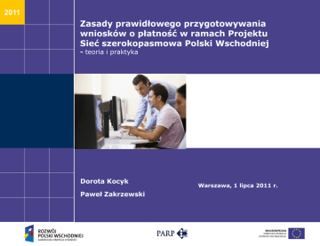 2011 Zasady prawidłowego przygotowywania wniosków o płatność w ramach Projektu Sieć szerokopasmowa Polski Wschodniej - teoria i praktyka Dorota Kocyk Paweł Zakrzewski Warszawa, 1 lipca 2011 r. Warszawa, 1 lipca 2011 r. Plan prezentacji 1) Wybrane podstawy prawne 2) Funkcje i struktura wniosku o płatność, w tym rozliczenie i wydatkowanie transzy zaliczki 3) Dokumentowanie wydatków kwalifikowalnych 4) Najczęściej popełniane błędy – ocena formalna 5) Najczęściej popełniane błędy – ocena merytoryczna 6) Pozostałe uchybienia 7) Opis dowodów księgowych 8) Oświadczenie o kwalifikowalności VAT 9) Wniosek w wersji elektronicznej w formacie excel (np. na CD) 10) Załączniki do wniosku Warszawa, 1 lipca 2011 r. Wybrane podstawy prawne 1) Rozporządzenie Ministra Rozwoju Regionalnego z dnia 8 października 2008 r. w sprawie udzielania przez Polską Agencję Rozwoju Przedsiębiorczości pomocy finansowej w ramach Programu Operacyjnego Rozwój Polski Wschodniej 2007-2013; 2) Umowa o dofinansowanie Projektu spełniającego kryteria, o których mowa w art. 39 rozporządzenia Rady (WE) nr 1083/2006 w ramach PO RPW 2007-2013; § 14 ust 17 „Ponoszenie wydatków”; (ze wskazaniem obowiązujących dokumentów oraz aktów prawa wspólnotowego i krajowego); 3) Wytyczne Ministra Rozwoju Regionalnego w zakresie kwalifikowania wydatków w ramach Programu Operacyjnego Rozwój Polski Wschodniej 2007-2013 (ze wskazaniem aktów prawnych i dokumentów regulujących zagadnienie kwalifikowalności); 4) Instrukcja do wniosku Beneficjenta o płatność dla projektu finansowanego w ramach Programu Operacyjnego Rozwój Polski Wschodniej 2007-2013; Warszawa, 1 lipca 2011 r. Funkcje i struktura wniosku o płatność - informacje ogólne Zgodnie z § 14, ust. 8 Umowy o dofinansowanie Beneficjent składa wniosek nie rzadziej niż raz na 3 miesiące, w formie pisemnej i w wersji elektronicznej. Rozliczenie przyznanego Beneficjentowi dofinansowania następuje przez złożenie wniosku o płatność i wypełnienie odpowiedniej jego części, służącej rozliczeniu dofinansowania. W przypadku, gdy Beneficjent nie rozliczył przekazanych w postaci zaliczki środków zgodnie z harmonogramem przekazywania dofinansowania w ramach umowy, IP PO RPW od środków pozostałych do rozliczenia nalicza odsetki jak dla zaległości podatkowych, liczone od dnia przekazania środków na rachunek bankowy Beneficjenta do dnia złożenia wniosku o płatność. Odsetki naliczane są proporcjonalnie dla części, w jakiej nierozliczone środki pochodzą z płatności oraz dotacji celowej. Warszawa, 1 lipca 2011 r. Termin wydatkowania i rozliczenia transzy zaliczki W kontekście zapisów § 14 Umowy o dofinansowanie – terminem wydatkowania i rozliczenia transzy zaliczki jest okres czasu liczony od dnia przekazania transzy zaliczki do ostatniego dnia kwartału następującego po kwartale, w którym zaliczka została przekazana na rachunek bankowy Beneficjenta. Jednocześnie należy mieć na uwadze obowiązujące przepisy ustawy o finansach publicznych (Dz. U. Nr 157 poz. 1240 z późn. zm.), nakładające na jednostki sektora finansów publicznych obowiązek zgłoszenia/rozliczenia wydatku nie później niż w okresie 3 miesięcy od daty jego poniesienia. Warszawa, 1 lipca 2011 r. Rozliczenie zaliczki Rozliczenie zaliczki następuje poprzez przedłożenie (tj. faktyczny wpływ do IP PO RPW) w powyższym terminie: 1) wniosku (albo wniosków) o płatność rozliczającego narastająco w danym okresie co najmniej 70% dotychczas otrzymanej zaliczki, lub 2) wykazanie mniejszego poziomu wydatkowania środków i zwrot niewykorzystanej części zaliczki. Jeżeli przedkładane wnioski zawierają mniejsze wydatki kwalifikowalne (np. 60% zaliczki), to różnica do 70% powinna być zwrócona w ww. dacie przekazanego dofinansowania – w przeciwnym wypadku od środków pozostałych do rozliczenia IP PO RPW naliczy odsetki jak dla zaległości podatkowych. Warszawa, 1 lipca 2011 r. Rozliczenie zaliczki Jeżeli w wyniku weryfikacji złożonego w ww. terminie wniosku o płatność (rozliczającego przekazaną transzę zaliczki) okaże się, że część lub wszystkie wykazane wydatki są niekwalifikowalne, co spowoduje, że nie zostanie osiągnięty poziom wydatkowania co najmniej 70% dotychczas otrzymanej zaliczki – Beneficjent zostanie wezwany do zwrotu kwoty stanowiącej różnicę pomiędzy wartością wydatków uznanych za kwalifikowalne a kwotą stanowiącą równowartość 70% wydatkowania przekazanej transzy z odsetkami naliczonymi jak dla zaległości podatkowych. zaliczki wraz Warszawa, 1 lipca 2011 r. Środki europejskie na przełomie lat budżetowych - stanowisko Ministerstwa Finansów Obecnie obowiązująca ustawa z dnia 27 sierpnia 2009 roku o finansach publicznych (Dz. U. Nr 157, poz. 1240, z późn. zm.) nie przewiduje konieczności zwrotu środków europejskich (z EFRR) przekazywanych na przełomie lat budżetowych na rachunek Beneficjenta. Wskazują na to przepisy Rozdziału 6 ww. ustawy – Wykonywanie budżetu środków europejskich podkreślające odmienny charakter tych środków; potwierdza to również brzmienie art. 184 ust. 2 ww. ustawy, zgodnie z którym zasady rozliczania określone dla dotacji z budżetu państwa nie dotyczą środków europejskich. Warszawa, 1 lipca 2011 r. Środki europejskie na przełomie lat budżetowych - stanowisko Ministerstwa Finansów Z kolei przepis art. 263 ww. ustawy określa w ust 1 generalną zasadę, iż niezrealizowane kwoty wydatków budżety jednostki samorządu terytorialnego wygasają z upływem roku budżetowego i przewiduje się od tej zasady w ust. 3 jedynie 2 odstępstwa. Chodzi tu o możliwość ustalenia wykazu wydatków niewygasających, w których organ stanowiący JST może ująć wydatki związane z realizacją umów: 1) w sprawie zamówienia publicznego; 2) które zostaną zawarte w wyniku zakończonego postępowania o udzielenie zamówienia publicznego, w