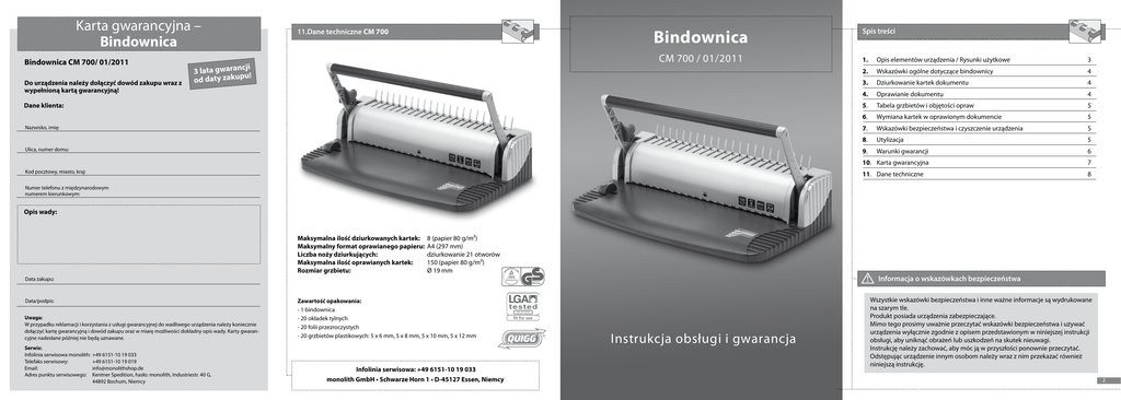 Karta gwarancyjna – Bindownica Bindownica CM 700/ 01/2011 Do urządzenia należy dołączyć dowód zakupu wraz z wypełnioną kartą gwarancyjną! Bindownica 11.Dane techniczne CM 700 CM 700 / 01/2011 cji 3 lata gwaran ! u od daty zakup Dane klienta: Nazwisko, imię: Ulica, numer domu: Kod pocztowy, miasto, kraj: Spis treści 1. Opis elementów urządzenia / Rysunki użytkowe 3 2. Wskazówki ogólne dotyczące bindownicy 4 3. Dziurkowanie kartek dokumentu 4 4. Oprawianie dokumentu 4 5. Tabela grzbietów i objętości opraw 5 6. Wymiana kartek w oprawionym dokumencie 5 7. Wskazówki bezpieczeństwa i czyszczenie urządzenia 5 8. Utylizacja 5 9. Warunki gwarancji 6 10. Karta gwarancyjna 7 11. Dane techniczne 8 Numer telefonu z międzynarodowym numerem kierunkowym: Opis wady: Maksymalna ilość dziurkowanych kartek: 8 (papier 80 g/m²) Maksymalny format oprawianego papieru: A4 (297 mm) Liczba noży dziurkujących: dziurkowanie 21 otworów Maksymalna ilość oprawianych kartek: 150 (papier 80 g/m²) Rozmiar grzbietu: Ø 19 mm ! Data zakupu: Data/podpis: Uwaga: W przypadku reklamacji i korzystania z usługi gwarancyjnej do wadliwego urządzenia należy koniecznie dołączyć kartę gwarancyjną i dowód zakupu oraz w miarę możliwości dokładny opis wady. Karty gwarancyjne nadesłane później nie będą uznawane. Serwis: Infolinia serwisowa monolith: +49 6151-10 19 033 Telefaks serwisowy: +49 6151-10 19 019 Email: [email protected] Adres punktu serwisowego: Kentner Spedition, hasło: monolith, Industriestr. 40 G, 44892 Bochum, Niemcy Zawartość opakowania: - 1 bindownica - 20 okładek tylnych - 20 folii przezroczystych - 20 grzbietów plastikowych: 5 x 6 mm, 5 x 8 mm, 5 x 10 mm, 5 x 12 mm Infolinia serwisowa: +49 6151-10 19 033 monolith GmbH • Schwarze Horn 1 • D-45127 Essen, Niemcy 66 34 065 Instrukcja obsługi i gwarancja Informacja o wskazówkach bezpieczeństwa Wszystkie wskazówki bezpieczeństwa i inne ważne informacje są wydrukowane na szarym tle. Produkt posiada urządzenia zabezpieczające. Mimo tego prosimy uważnie przeczytać wskazówki bezpieczeństwa i używać urządzenia wyłącznie zgodnie z opisem przedstawionym w niniejszej instrukcji obsługi, aby uniknąć obrażeń lub uszkodzeń na skutek nieuwagi. Instrukcję należy zachować, aby móc ją w przyszłości ponownie przeczytać. Odstępując urządzenie innym osobom należy wraz z nim przekazać również niniejszą instrukcję. 2 1. Opis elementów urządzenia CM 700 / Rysunki użytkowe 5 ! 4 1 6 2 Szczelina dziurkująca 3 Dźwignia dziurkująca Rys. 1 Ø grzbietu spiralnego 6 mm 8 mm 10 mm 12 mm 5 Dźwignia blokująca 6 Wysuwany pojemnik na ścinki Rys. 2 Rys. 3 3 14 mm 16 mm 19 mm !WAŻNY DOKUMENT GWARANCYJNY – PRZECHOWYWAĆ W BEZPIECZNYM MIEJSCU! Objętość dokumentu (80g/m²) 75-115 kartek 100-130 kartek 120-150 kartek Bindownica CM 700/ 01/2011 Warunki gwarancji Szanowna Klientko, Szanowny Kliencie, produkty marki monolith podlegają surowej kontroli jakości. Jeżeli wbrew oczekiwaniom urządzenie nie działa bez zastrzeżeń prosimy o skontaktowanie się z naszą infolinią serwisową pod numerem: +49 6151-10 19 033 Godziny otwarcia serwisu: Pn.-cz. 8:00-17:00, pt. 8:00-15:00 Aby reklamacja była ważna – bez ograniczenia ustawowych praw konsumenta – muszą być spełnione następujące warunki: 1. Gwarancji udziela się na okres maks. 3 lat od daty zakupu. Świadczenie gwarancyjne ograniczone są do usunięcia wad materiałowych oraz wad produkcyjnych lub wymiany urządzenia. Nasze świadczenia gwarancyjne są bezpłatne. 2. Reklamacje należy zgłaszać natychmiast po stwierdzeniu wady urządzenia. Reklamacja zgłoszona po upływie czasu gwarancji jest nieważna, chyba że zostanie ona zgłoszona w przeciągu dwóch tygodni od upływu czasu gwarancji. 3. Wadliwe urządzenie należy odesłać przesyłką wolną od opłaty pocztowej wraz z kartą gwarancyjną oraz paragonem na adres serwisu. Jezeli usterka objęta jest gwarancją, klient otrzyma naprawione lub nowe urządzenie. Dokonana naprawa lub wymiana urządzenia nie oznacza rozpoczęcia nowego okresu gwarancyjnego. Okres gwarancji wynosi w dalszym ciągu 3 lata od daty zakupu. Obowiązuje to również w przypadku naprawy serwisowej u klienta. ! 7. Wskazówki bezpieczeństwa i czyszczenie urządzenia 7.1. Folie i kartony zawsze należy dziurkować pojedynczo. 7.2. Urządzenia należy używać wyłącznie do dziurkowania papieru, kartonu i folii okładkowych. 7.3. Należy regularnie opróżniać wysuwany pojemnik na ścinki 6 . 7.4. Spiralnych grzbietów nie należy pozostawiać zbyt długo otwartych, gdyż może to uszkodzić ich przydatność i uniemożliwić zamknięcie grzbietu. 7.5. Urządzenie należy czyścić wyłącznie przy pomocy wilgotnej ściereczki. 7.6. Plastikowe woreczki mogą stanowić niebezpieczeństwo. Aby uniknąć ryzyka uduszenia, woreczek należy przechowywać poza zasięgiem niemowląt i małych dzieci. 4. Oprawianie dokumentu (Rys. 2) 4.1. Dobrać grzbiet spiralny odpowiadający rozmiarem ilości kartek (patrz tabela po prawej stronie). 4.2. Grzbiet spiralny nałożyć na metalowy grzebień 4 tak, aby otwarcie grzbietu było skierowane ku górze i zaczepić grzbiet poprzez lekkie przesunięcie w lewo. 4.3. Po wciśnięciu w dół dźwigni dziurkującej, metalowe haczyki grzebienia otwierają pierścienie grzbietu. Gdy grzbiet jest już dostatecznie rozwarty, należy zablokować takie położenie poprzez wciśnięcie dźwigni blokującej 5 . 4.4. Przedziurkowane kartki wraz z folią na okładkę przednią i tylną okładką kartonową umieścić w grzbiecie drukiem do góry (kartki należy przy tym wprowadzać pod dźwignią dziurkującą w kierunku metalowego grzebienia). Zwalniając dźwignię blokującą (przytrzymując równocześnie dźwignię dziurkującą) zamknąć grzbiet. Przesuwając lekko w prawo można wyjąć oprawiony dokument. 2-20 kartek 20-40 kartek 30-60 kartek 50-85 kartek Ø grzbietu spiralne