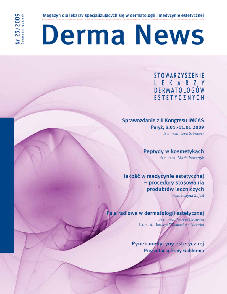 Dwumiesi´cznik Nr 23/2009 Magazyn dla lekarzy specjalizujàcych si´ w dermatologii i medycynie estetycznej Derma News Sprawozdanie z II Kongresu IMCAS Pary˝, 8.01.-11.01.2009 dr n. med. Ewa Szpringer Peptydy w kosmetykach dr n. med. Maria Noszczyk JakoÊç w medycynie estetycznej – procedury stosowania produktów leczniczych mec. Justyna Zajdel Fale radiowe w dermatologii estetycznej dr n. med. Joanna Czuwara lek. med. Barbara Walkiewicz-Cyraƒska Rynek medycyny estetycznej Prezentacja firmy Galderma Barbara Walkiewicz-Cyraƒska Prezes Stowarzyszenia Lekarzy Dermatologów Estetycznych Derma News Kole˝anki i Koledzy! Nr23/2009/Dwumiesi´cznik WYDAWCA: ul. Domaniewska 47, 02-672 Warszawa tel. (0 22) 853 39 70, fax: (0 22) 847 69 33 tel. 0 605 332 776 e-mail: [email protected] www.dermatologia-estetyczna.pl Redakcja i Dzia∏ Reklamy: tel. (022) 498 35 30, (022) 853 39 70 fax: (022) 408 91 54 tel. 0 607 338 827, 0 608 388 412 e-mail: [email protected] Magazyn dla klientów gabinetów dermatologii i medycyny estetycznej, chirurgii plastycznej, wellness i beauty spa Gdy ten numer Derma Newsa trafia do Paƒstwa ràk, trwa w∏aÊnie kolejny Kongres Stowarzyszenia Lekarzy Dermatologów Estetycznych. W tym roku jest dla nas wydarzeniem szczególnym – Êwi´tujemy 10 rocznic´ powstania SLDE. Przypomn´, ˝e zaczynaliÊmy jako niespe∏na 40-osobowa grupka dermatologów zainteresowanych problemami estetycznymi skóry, teraz jest nas ponad 400. To nasz wspólny sukces, ˝e dermatologia estetyczna ugruntowa∏a swojà pozycj´ wÊród innych dziedzin medycyny. A co najwa˝niejsze, poprzez szerokà dzia∏alnoÊç edukacyjnà – z du˝à pomocà mediów – uda∏o nam si´ przekonaç wiele osób w Polsce, ˝e troska o ∏adny wyglàd to nie tylko sposób na zachowanie m∏odoÊci, ale te˝ zdrowia i dobrej kondycji na d∏ugie lata. Chcia∏abym w tym miejscu podzi´kowaç wszystkim, którzy na co dzieƒ wspierajà dzia∏alnoÊç naszego Stowarzyszenia i aktywnie uczestniczà w jego pracach (w organizowaniu sympozjów i praktycznych warsztatów), a tak˝e goràco zach´cam do w∏àczenia si´ tych lekarzy, którzy jeszcze stojà nieco z boku. Tradycyjnie zapraszam do lektury wydawanego od 5 lat przez SLDE Derma Newsa. Znajdà w nim Paƒstwo m.in. sprawozdanie z kongresu IMCAS w Pary˝u, artyku∏ o zastosowaniu peptydów w kosmetykach oraz ciekawe informacje prawne na temat konsekwencji braku stosowania odpowiednich procedur wobec produktów leczniczych. AUTOR: dr n. med. Ewa Szpringer 11th Annual Meeting International Master Course on Aging Skin Sprawozdanie z 11 kongresu IMCAS 08.01.-11.01.2009, Pary˝ W dniach od 8 do 11 stycznia 2009 roku Palais des Congres de Paris by∏ miejscem jedenastego spotkania IMCAS (11th Annual Meeting International Master Course on Aging Skin). 4 W tym roku po∏o˝ono szczególny nacisk tematyczny na: regeneracj´ tkanek komórkami macierzystymi, nowe techniki implantacji wype∏niaczy oraz nieinwazyjne i chirurgiczne techniki modelowania cia∏a. medycyny estetycznej, terapiom laserowym, zw∏aszcza w technologii frakcyjnego dostarczania impulsów. Du˝ym powodzeniem cieszy∏a si´ sesja poÊwi´cona modelowaniu tkanek oko∏ooczodo∏owych. Metody in˝ynierii tkankowej, które pozwala∏yby na implantowanie multipotencjalnych komórek pnia (stem cells) oraz zastosowanie – zarówno w leczeniu wielu chorób, jak w i medycynie przeciwstarzeniowej – cytokin, czyli czynników wzrostu (growth factors), wydajà si´ byç prawdziwym prze∏omem. Âwiatowi liderzy: J.Carraway, B. Ascher, S. Liew, R. Malhorta mówili o destrukcji koÊci, skóry, tkanki podskórnej, aparatu mi´Êniowo-wi´zad∏owego okolicy oczodo∏owej w przebiegu starzenia i mo˝liwoÊciach naprawy (reshapingu) z u˝yciem wype∏niaczy, g∏ównie stabilizowanego kwasu hialuronowego. Ponadto sesje naukowe i kursy kszta∏càce poÊwi´cone by∏y, jak zazwyczaj, implantologii kwasem hialuronowym, kolagenem i materia∏ami trwa∏ymi oraz w∏asnym t∏uszczem, mo˝liwoÊciom leczenia neurotoksynà w zakresie Sesja i kurs poÊwi´cone modelowaniu atrakcyjnych ust, równie˝ zgromadzi∏y pe∏nà sal´ s∏uchaczy. Mauricio de Maio kolejny raz przedstawi∏ filozofi´ pracy z neurotoksynà botulinowà, zwracajàc uwag´ na konie- Derma News cznoÊç dok∏adnej analizy wektorów skurczu leczonych mi´Êni, a zw∏aszcza wektora wypadkowego. Lifting twarzy botulinà, to tak˝e ciekawa, choç znana ju˝ propozycja. Podczas sesji chirurgii plastycznej omawiano techniki wype∏niania, przede wszystkim w∏asnym t∏uszczem, techniki faceliftingu, rhinoplastyk´, plastyk´ piersi, tak˝e z u˝yciem stabilizowanego kwasu hialuronowego. Jak zwykle, wiele ciekawych sesji toczy∏o si´ równolegle i wybór, w której uczestniczyç, by∏ niejednokrotnie trudny, tym bardziej, ˝e poziom naukowy wi´kszoÊci wyk∏adów by∏ dobry. Kongresowi towarzyszy∏o wielu wystawców leków, dermokosmetyków i sprz´tu medycznego z ca∏ego Êwiata. AUTOR: dr n. med. Maria Noszczyk Peptydy – zastosowanie w kosmetykach Peptydy stanowià cz´sty sk∏adnik aktywny wielu kosmetyków przeznaczonych do piel´gnacji skóry dojrza∏ej. Peptydami nazywa si´ krótkie ∏aƒcuchy sekwencji aminokwasów. Aminokwasy to sk∏adowe budujàce bia∏ka. Technologia bioaktywnych peptydów zosta∏a rozwini´ta dzi´ki badaniom nad gojeniem ran. Obecnie, bardzo cz´sto wykorzystuje si´ ró˝ne rodzaje peptydów w kosmetykach przeciwzmarszczkowych. Wiele publikacji porównuje ich dzia∏anie do retinoidów, podkreÊlajàc w przypadku peptydów efektywne dzia∏anie pozbawione reakcji podra˝nieniowych stwierdzanych po retinoidach. PEPTYDY WYKORZYSTYWANE W KOSMETYCE DZIELI SI¢ NA: 1. Stymulujàce syntez´ bia∏ek skóry – signal peptides, peptydy sygnalizacyjne 2. Hamujàce uwalnianie neurotransmiterów 3. Niektóre z wykorzystywanych w kosmetologii peptydów pe∏nià podwójnà rol´ czynników noÊnikowych (wià˝