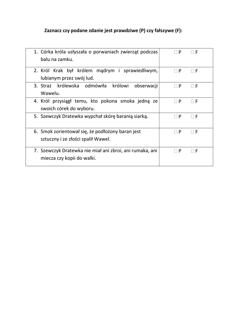Zaznacz czy podane zdanie jest prawdziwe (P) czy fałszywe (F): 1. Córka króla usłyszała o porwaniach zwierząt podczas balu na zamku. P F 2. Król Krak był królem mądrym i sprawiedliwym, lubianym przez swój lud. 3. Straż królewska odmówiła królowi obserwacji Wawelu. 4. Król przysiągł temu, kto pokona smoka jedną ze swoich córek do wyboru. 5. Szewczyk Dratewka wypchał skórę baranią siarką. P F P F P F P F 6. Smok zorientował się, że podłożony baran jest sztuczny i ze złości spalił Wawel. P F 7. Szewczyk Dratewka nie miał ani zbroi, ani rumaka, ani miecza czy kopii do walki. P F