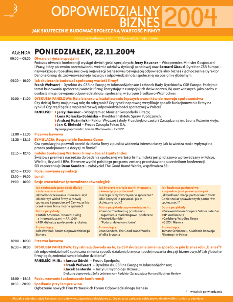 ODPOWIEDZIALNY BIZNES JAK SKUTECZNIE BUDOWAå SPO¸ECZNÑ WARTOÂå FIRMY? 2004 Doroczna konferencja Forum Odpowiedzialnego Biznesu AGENDA PONIEDZIA¸EK, 22.11.2004 09:00 – 09:30 Otwarcie i goÊcie specjalni Podczas otwarcia konferencji wystàpi dwóch goÊci specjalnych: Jerzy Hausner – Wicepremier, Minister Gospodarki i Pracy, który po swoim przemówieniu weêmie udzia∏ w dyskusji panelowej oraz Bernard Giraud, Dyrektor CSR Europe – najwi´kszej europejskiej sieciowej organizacji biznesowej rozwijajàcej odpowiedzialny biznes i jednoczeÊnie Dyrektor Danone Group ds. zrównowa˝onego rozwoju i odpowiedzialnoÊci spo∏ecznej na poziomie globalnym. 09:30 – 10:00 Jak skutecznie budowaç spo∏ecznà wartoÊç firmy? Frank Welvaert – Dyrektor ds. CSR na Europ´ w Johnson&Johnson i cz∏onek Rady Dyrektorów CSR Europe. Podejmie temat budowania spo∏ecznej wartoÊci firmy, korzystajàc z europejskich doÊwiadczeƒ J&J oraz w∏asnych, jako osoby z osobistà misjà rozwijania odpowiedzialnoÊci spo∏ecznej w Europie Ârodkowo-Wschodniej. 10:00 – 11:00 DYSKUSJA PANELOWA: Rola biznesu w kszta∏towaniu lepszych warunków do rozwoju spo∏eczeƒstwa Czy dzisiaj firmy majà nowà rol´ do odegrania? Czy rynek naprawd´ weryfikuje sposób funkcjonowania firmy na rynku? Czy rzàd b´dzie wspiera∏ rozwój odpowiedzialnoÊci spo∏ecznej w Polsce? PANELIÂCI: ◗ Jerzy Hausner – Wicepremier, Minister Gospodarki i Pracy; ◗ Lena Kolarska-Bobiƒska – Dyrektor Instytutu Spraw Publicznych; ◗ Andrzej Koêmiƒski - Rektor Wy˝szej Szko∏y Przedsi´biorczoÊci i Zarzàdzania im. Leona Koêmiƒskiego; ◗ Jan K. Bielecki – Prezes Zarzàdu Pekao S.A. Dyskusj´ poprowadzi: Roman M∏odkowski – TVN24* 11:00 – 11:30 Przerwa kawowa 11:30 – 12:15 SYMULACJA: Responsible Business Game Gra symulacyjna pozwoli oceniç dzia∏ania firmy z punktu widzenia interesariuszy. Jak ta wiedza mo˝e wp∏ynàç na proces podejmowania decyzji w firmie? 12:15 – 12:45 Indeks Spo∏ecznej WartoÊci Firmy – Social Equity Index Âwiatowa premiera narz´dzia do badania spo∏ecznej wartoÊci firmy. Indeks jest pilota˝owo wprowadzany w Polsce, Wielkiej Brytanii i RPA. Pierwsze wyniki polskiego programu zostanà przedstawione uczestnikom konferencji. SEI zaprezentuje Dean Sanders – za∏o˝yciel The Good Brand Works, wspó∏twórca SEI. 12:45 – 13:00 Podsumowanie symulacji 13:00 – 14:00 Lunch 14:00 – 16:00 Sesje warsztatowe (prowadzone równolegle): Jak skutecznie prowadziç dialog z interesariuszami? Jak badaç oczekiwania interesariuszy? Jak mierzyç wk∏ad firmy w rozwój spo∏eczny i gospodarczy? Czy wszystkie oczekiwania firmy mo˝na spe∏niaç? Dobre przyk∏ady: ◗ British American Tobacco: dialog z interesariuszami – AA 1000 ◗ ABB: dialog ze spo∏ecznoÊcià lokalnà Prowadzàcy: Boles∏aw Rok, Forum Odpowiedzialnego Biznesu Jak tworzyç wartoÊç marki w oparciu o inwestycje spo∏eczne? Dlaczego firmy tworzà marki spo∏eczne? Jakie korzyÊci to przynosi i jak to skutecznie robiç? Dobre przyk∏ady zaprezentujà m.in.: ◗ Danone: “Podziel si´ posi∏kiem”– zagadnienia marketingowe i spo∏eczne ◗ Procter&Gamble*: “Podaruj dzieciom s∏oƒce” Prowadzàcy: Dean Sanders, The Good Brand Works, Wielka Brytania Jak budowaç partnerstwo z organizacjami pozarzàdowymi Jak budowaç relacje partnerskie z NGO? Gdzie szukaç sprawdzonych partnerów spo∏ecznych? Dobre przyk∏ady: ◗ PricewaterhouseCoopers: Szko∏a Liderów ◗ BP: Autokreacja ◗ Carlsberg: Wspólna Droga ◗ GEXSI: Niemcy Prowadzàcy: Tomasz Schimanek, Akademia Rozwoju Filantropii w Polsce 16:00 – 16:30 Przerwa kawowa 16:30 – 18:00 DYSKUSJA PANELOWA: Czy istniejà dowody na to, ˝e CSR skutecznie zmienia sposób, w jaki biznes robi „biznes”? Jak odpowiedzialnoÊç spo∏eczna zmienia sposób dzia∏ania biznesu i podejmowania decyzji biznesowych? Jak globalne firmy b´dà zmieniaç swoje lokalne dzia∏ania? PANELIÂCI M.IN.: ◗ Janusz Górski – Prezes Spedpolu; ◗ Frank Welvaert – Dyrektor ds. CSR na Europ´ w Johnson&Johnson; ◗ Jacek Santorski – Instytut Psychologii Biznesu; Dyskusj´ poprowadzi: Zofia LeÊniewska – Redaktor Zarzàdzajàcy Harvard Business Review 18:00 – 18:15 Podsumowanie i zakoƒczenie konferencji 18:30 – 20:00 Spotkanie przy lampce wina Og∏oszenie nowych Firm Partnerskich Forum Odpowiedzialnego Biznesu * – w trakcie potwierdzania Aktualnà agend´ znajdà Paƒstwo na stronie www.odpowiedzialnybiznes.pl. Organizator zastrzega sobie prawo do niewielkich zmian w agendzie. ODPOWIEDZIALNY BIZNES JAK SKUTECZNIE BUDOWAå SPO¸ECZNÑ WARTOÂå FIRMY? 2004 Doroczna konferencja Forum Odpowiedzialnego Biznesu AGENDA WTOREK, 23.11.2004 AKADEMIA ODPOWIEDZIALNEGO BIZNESU Akademia Odpowiedzialnego Biznesu powsta∏a z myÊlà o osobach, które czujà g∏ód wiedzy o odpowiedzialnym biznesie i szukajà konkretnych rozwiàzaƒ i dobrych przyk∏adów wprowadzania strategii i programów CSR do firmy. Te warsztaty przeznaczone sà dla tych wszystkich, którzy pracujà w obszarze Human Resources i Public Relations, którzy wiedzà, ˝e chcà wdra˝aç CSR w swoich firmach, ale nie wiedzà jak. Podczas dwóch warsztatów praktycy odpowiedzialnego biznesu b´dà si´ dzieliç doÊwiadczeniami zarówno w∏asnymi jak i zaproszonych goÊci. Oprócz prezentacji dobrych przyk∏adów b´dzie równie˝ okazja do dyskusji z zaproszonymi goÊçmi oraz mo˝liwoÊç uzyskania obszernej wiedzy z konkretnego obszaru: PR i HR. Serdecznie zapraszamy! WTOREK, 23.11.2004, 09.00-13:00, warsztaty prowadzone równolegle: 1. Od PRu do CSRu, czyli jak uczyniç odpowiedzialnoÊç spo∏ecznà strategicznym elementem zarzàdzania firmà? Dzia∏alnoÊç spo∏eczna firm – bardziej PR czy CSR? Gdzie przebiega granica mi´dzy PRem a spo∏ecznà odpowiedzialnoÊcià biznesu? Kto tu rzàdzi – PR spo∏ecznà odpowiedzialnoÊcià, czy spo∏eczna odpowiedzialnoÊç PRem? Public relatio