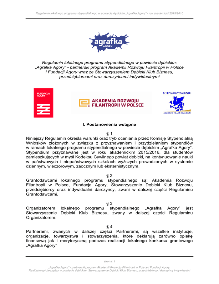 Regulamin lokalnego programu stypendialnego w powiecie dębickim „Agrafka Agory” - rok akademicki 2015/2016 Regulamin lokalnego programu stypendialnego w powiecie dębickim: „Agrafka Agory” - partnerski program Akademii Rozwoju Filantropii w Polsce i Fundacji Agory wraz ze Stowarzyszeniem Dębicki Klub Biznesu, przedsiębiorcami oraz darczyńcami indywidualnymi I. Postanowienia wstępne §1 Niniejszy Regulamin określa warunki oraz tryb oceniania przez Komisję Stypendialną Wniosków złożonych w związku z przyznawaniem i przydzielaniem stypendiów w ramach lokalnego programu stypendialnego w powiecie dębickim „Agrafka Agory”. Stypendium przyznawane jest w roku akademickim 2015/2016, dla studentów zamieszkujących w myśl Kodeksu Cywilnego powiat dębicki, na kontynuowanie nauki w państwowych i niepaństwowych szkołach wyższych prowadzonych w systemie dziennym, wieczorowym, zaocznym lub eksternistycznym. §2 Grantodawcami lokalnego programu stypendialnego są: Akademia Rozwoju Filantropii w Polsce, Fundacja Agory, Stowarzyszenie Dębicki Klub Biznesu, przedsiębiorcy oraz indywidualni darczyńcy, zwani w dalszej części Regulaminu Grantodawcami. §3 Organizatorem lokalnego programu stypendialnego „Agrafka Agory” jest Stowarzyszenie Dębicki Klub Biznesu, zwany w dalszej części Regulaminu Organizatorem. §4 Partnerami, zwanych w dalszej części Partnerami, są wszelkie instytucje, organizacje, towarzystwa i stowarzyszenia, które deklarują zarówno opiekę finansową jak i merytoryczną podczas realizacji lokalnego konkursu grantowego „Agrafka Agory” strona: 1 „Agrafka Agory” - partnerski program Akademii Rozwoju Filantropii w Polsce i Fundacji Agory. Realizatorzy/darczyńcy w powiecie dębickim: Stowarzyszenie Dębicki Klub Biznesu, przedsiębiorcy i darczyńcy indywidualni Regulamin lokalnego programu stypendialnego w powiecie dębickim „Agrafka Agory” - rok akademicki 2015/2016 II. Rodzaje i czas przyznawania stypendiów §5 W ramach lokalnego konkursu stypendialnego „Agrafka Agory”, określa się przyznanie stypendiów w następujących założeniach: 1. Założenia obligatoryjne: 3 stypendia naukowo-socjalne finansowane przez Akademię Rozwoju Filantropii w Polsce, Fundację Agory oraz Stowarzyszenie Dębicki Klub Biznesu, przedsiębiorców i darczyńców indywidualnych - w kwocie 380 zł miesięcznie przyznawane na okres 9 miesięcy tj. od października 2015 r. do czerwca 2016 r. 2. Założenia fakultatywne: 2 stypendia naukowo-socjalne dla studentów studiów technicznych, finansowane przez przedsiębiorców i darczyńców indywidualnych w kwocie 380 zł miesięcznie przyznawane na okres 9 miesięcy tj. od października 2015 r. do czerwca 2016 r. stypendia pomocowe w kwocie do 1.000 zł, określonej przez wnioskującego, finansowane przez Stowarzyszenie Dębicki Klub Biznesu, przedsiębiorców i darczyńców indywidualnych - przyznawane jednorazowo lub miesięcznie §6 Stypendia adresowane są do osób kontynuujących naukę w roku akademickim 2015/2016 - studenci od II do V roku studiów i muszą zostać przeznaczone na cele edukacyjno-oświatowe, związane ze zdobywaniem wiedzy przez stypendystę, np. na: opłatę mieszkania, dojazdów, wyżywienia, zakup książek, opłacenie dodatkowych kursów/szkoleń, etc. §7 Podczas wypełniania wniosku, należy wskazać, o jaki rodzaj stypendium się wnioskuje z założeniem, że można wnioskować zarówno o stypendium naukowosocjalne i stypendium pomocowe lub stypendium naukowo-socjalne dla studentów studiów technicznych i stypendium pomocowe. Na tej podstawie, w przypadku wyczerpania się puli środków na stypendia naukowo-socjalne, komisja będzie mogła wybrać wnioski dla stypendiów pomocowych - zatem, można jednocześnie zaznaczyć stypendium naukowo-socjalne jak i stypendium pomocowe. III. Warunki ubiegania się o przyznanie stypendium §8 Do ubiegania się o stypendium uprawnieni są studenci, którzy: 1) studiują w państwowych i niepaństwowych szkołach wyższych prowadzonych w systemie dziennym, wieczorowym, zaocznym oraz eksternistycznym na terenie Rzeczypospolitej Polskiej i w krajach Unii Europejskiej 2) posiadają stałe zameldowanie na obszarze powiatu dębickiego 3) w momencie składania wniosku nie przekraczają 26 lat 4) spełnili wszystkie wymagania formalne określone w regulaminie strona: 2 „Agrafka Agory” - partnerski program Akademii Rozwoju Filantropii w Polsce i Fundacji Agory. Realizatorzy/darczyńcy w powiecie dębickim: Stowarzyszenie Dębicki Klub Biznesu, przedsiębiorcy i darczyńcy indywidualni Regulamin lokalnego programu stypendialnego w powiecie dębickim „Agrafka Agory” - rok akademicki 2015/2016 IV. Zasady przyznawania stypendium §9 Ogłoszenie o terminie składania wniosków o przyznanie stypendium (zwane w dalszej części Wnioskami) jest zamieszczane na stronie internetowej Organizatora oraz za pomocą wszystkich możliwych kanałów medialnych takich jak lokalna i regionalna prasa, radio, TV itp. § 10 Rozpatrzeniu podlegają Wnioski, które zostały złożone w wersji papierowej i elektronicznej przed upływem terminu składania wniosków o przyznanie stypendium na specjalnie przygotowanym formularzu dostępnym na stronie internetowej Organizatora. Wypełnione wnioski należy złożyć do 30 września 2015 roku w wersji papierowej do biura Stowarzyszenia Dębicki Klub Biznesu pod adresem: Stowarzyszenie Dębicki Klub Biznesu, ul. Fabryczna 12, 39-200 Dębica, II piętro - jedną kopię, podpisaną własnoręcznie - decyduje data stempla pocztowego - oraz podesłać wersję elektroniczną wniosku na adres: [email protected] do godziny 14:00 - decyduje data wpływu (wersję elektroniczną również należy podesłać do dnia 30 września 2015 roku - UWAGA należy wysłać formularz z rozszerzeniem DOC, a nie skan podpisanego formularza). § 11 Złożone wnioski podlegają ocenie formalnej i merytorycznej przez Komisję Stypendialną. § 
