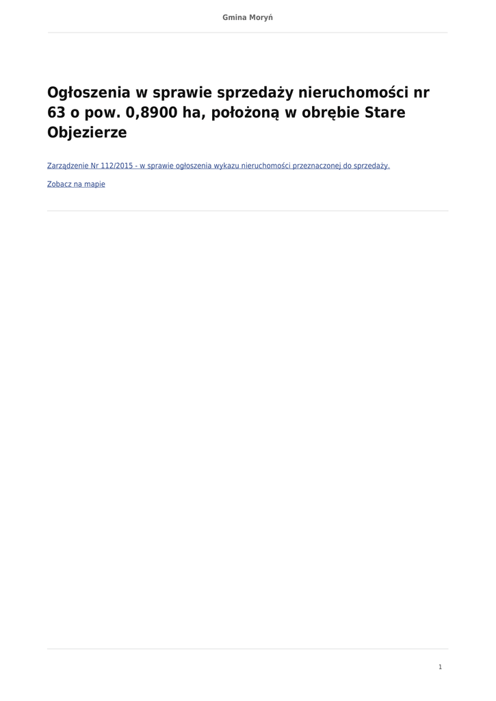 Gmina Moryń Ogłoszenia w sprawie sprzedaży nieruchomości nr 63 o pow. 0,8900 ha, położoną w obrębie Stare Objezierze Zarządzenie Nr 112/2015 - w sprawie ogłoszenia wykazu nieruchomości przeznaczonej do sprzedaży. Zobacz na mapie 1