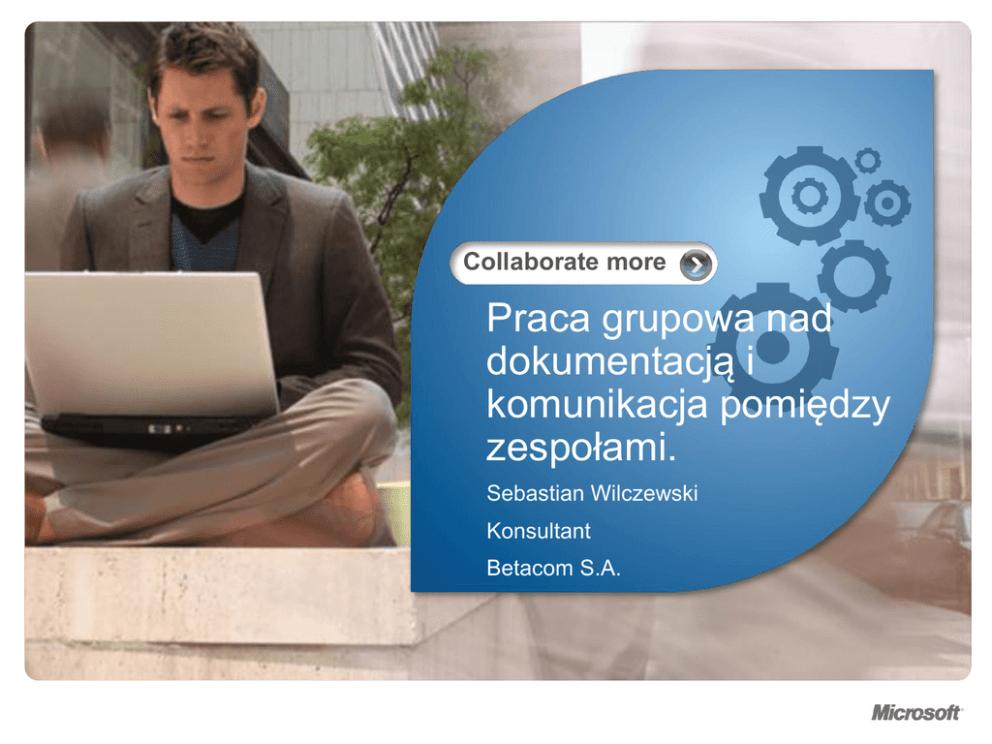 Collaborate more Praca grupowa nad dokumentacją i komunikacja pomiędzy zespołami. Sebastian Wilczewski Konsultant Betacom S.A. Praca grupowa nad dokumentacją i komunikacja pomiędzy zespołami. Rzecz o mobilnej pracy w administracji publicznej. Betacom S.A. – Kompetencje partnerskie • Status LAR (Large Account Reseller) • Identity and Security • Server Platform • Desktop • Learning Solution • Software Asset Management • Volume Licensing • Portals and Collaboration • Content Management • Data Platform • Unified Communications • Midmarket Solution Provider • Small Business Specialist Community Łączenie ludzi, informacji i procesów Portal Internetowy Obywatele Obywatele Portal urzędowy Personel Wydziały Zespoły Witryny osobiste XML Web Services Aplikacje biznesowe (SAP, ERP, inne...) Microsoft Office 2010 Pracujmy razem Urzeczywistniajmy pomysły Praca równoczesna nad dokumentami i informacją Szybsza i łatwiejsza praca Większa kontrola nad pocztą elektroniczną, spotkaniami Pomysły pokazane na rysunkach, wykresach i filmach Transmisja prezentacji Informacje na diagramach i szkicach Połączenie informacji, dokumentów, danych i ludzi Używajmy Office wszędzie Praktyczna platforma Praca skądkolwiek przez przeglądarkę Lepsze wykorzystanie sprzętu nowego i starego Wszystko pod ręką na stacji roboczej Lepsza ochrona na wielu płaszczyznach Praca przez telefon z Windows i na Nokiach Ułatwione połączenie z serwerami Zgodność z przepisami w dokumentach i mailach Infrastruktura dla pracowników merytorycznych Platforma dla pracowników merytorycznych Komunikacja Łatwe przyjęcie rozwiązania w organizacji, dzięki znanym narzędziom Analizy danych Zarządzanie treściami Współpraca Wykorzystanie danych w przygotowywaniu treści Wyszukiwanie Jednolity interfejs użytkownika obniża koszty Koordynacja pracy to duży wysiłek Przy opracowywaniu dokumentów w tradycyjny sposób traci się dużo czasu… … dlatego wprowadziliśmy równoczesną edycję dokumentu. Ciągle w podróży Podróże pożerają czas i pieniądze… … dlatego dzisiaj więcej można zrobić na odległość. Kto wie? Szacuje się, że 80% treści w organizacjach znajduje się na dyskach stacji roboczych… …dlatego wprowadziliśmy możliwość efektywnego zbierania treści i ich współdzielenia. Wyzwania • Wspólne miejsce pracy nad dokumentami • Jak scalać i porównywać wersję dokumentów? • Typowe wyzwania podczas pracy nad dokumentami • • • jednoczesna praca nad dokumentami przez wiele osób, wersjonowanie powiadamianie o zmianach • Praca off-line • • • Outlook 2010, SharePoint Workspace Formularze on-line, off-line. Wyzwania • Praca mobilna • Dostęp zdalny, • Dostęp z przeglądarki, • Dostęp z urządzeń mobilnych. • Zabezpieczanie danych • poufność, • aktualność Demo Pytania? Dziękuję za uwagę Sebastian Wilczewski Konsultant Betacom S.A. [email protected] Tel. 694-445-752 © 2008 Microsoft Corporation. All rights reserved. Microsoft, Windows, Windows Vista and other product names are or may be registered trademarks and/or trademarks in the U.S. and/or other countries. The information herein is for informational purposes only and represents the current view of Microsoft Corporation as of the date of this presentation. Because Microsoft must respond to changing market conditions, it should not be interpreted to be a commitment on the part of Microsoft, and Microsoft cannot guarantee the accuracy of any information provided after the date of this presentation. MICROSOFT MAKES NO WARRANTIES, EXPRESS, IMPLIED OR STATUTORY, AS TO THE INFORMATION IN THIS PRESENTATION.