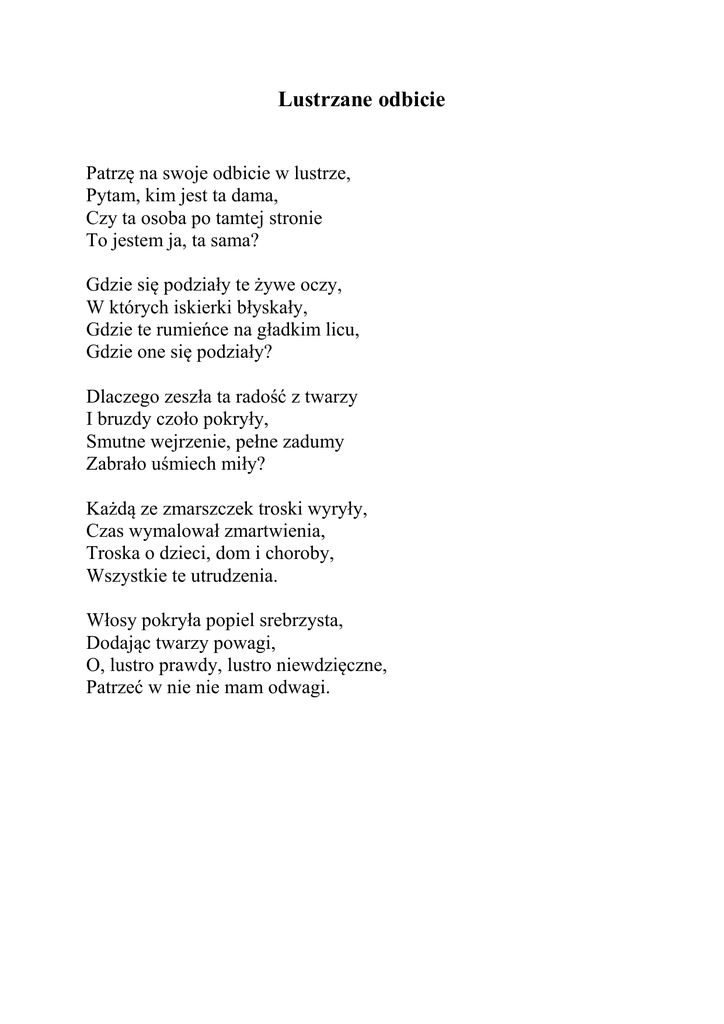 Lustrzane odbicie Patrzę na swoje odbicie w lustrze, Pytam, kim jest ta dama, Czy ta osoba po tamtej stronie To jestem ja, ta sama? Gdzie się podziały te żywe oczy, W których iskierki błyskały, Gdzie te rumieńce na gładkim licu, Gdzie one się podziały? Dlaczego zeszła ta radość z twarzy I bruzdy czoło pokryły, Smutne wejrzenie, pełne zadumy Zabrało uśmiech miły? Każdą ze zmarszczek troski wyryły, Czas wymalował zmartwienia, Troska o dzieci, dom i choroby, Wszystkie te utrudzenia. Włosy pokryła popiel srebrzysta, Dodając twarzy powagi, O, lustro prawdy, lustro niewdzięczne, Patrzeć w nie nie mam odwagi.