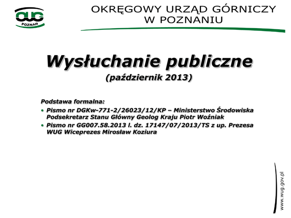 Wysłuchanie publiczne (październik 2013) Podstawa formalna: • Pismo nr DGKw-771-2/26023/12/KP – Ministerstwo Środowiska Podsekretarz Stanu Główny Geolog Kraju Piotr Woźniak • Pismo nr GG007.58.2013 l. dz. 17147/07/2013/TS z up. Prezesa WUG Wiceprezes Mirosław Koziura Wprowadzenie Złoża niekonwencjonalne gazu ziemnego Pod pojęciem „shale gas” rozumiemy gaz ziemny zawarty w silnie zdiagenezowanych skałach ilasto-mułowcowych o bardzo małej porowatości i bardzo niskiej przepuszczalności. Z kolei „tight gas” to gaz ziemny zamknięty (uwięziony) w izolowanych porach piaskowców, lub rzadziej utworów węglanowych, charakteryzujących się bardzo niskimi wartościami parametru przepuszczalności, przy najczęściej (chociaż niekoniecznie) niskich wartościach porowatości. Wspólną cechą „shale gas” i „tight gas”, a jednocześnie różniącą je od konwencjonalnych akumulacji gazu ziemnego, jest brak samoistnego przypływu gazu do odwierconego otworu w ilościach, w których eksploatacja metodami tradycyjnymi byłaby ekonomicznie uzasadniona. 2 3 Obszary występowania niekonwencjonalnych złóż gazu ziemnego i ropy naftowej w Polsce 4 Akty prawne – w szczególności 1. Ustawa z dnia 9 czerwca 2011 r. Prawo geologiczne i górnicze (Dz. U. Nr 163, poz. 981, z późn. zm.); 2. Rozporządzenie Ministra Gospodarki z dnia 28 czerwca 2002 r. w sprawie bezpieczeństwa i higieny pracy, prowadzenia ruchu oraz specjalistycznego zabezpieczenia przeciwpożarowego w zakładach górniczych wydobywających kopaliny otworami wiertniczymi (Dz. U. Nr 109, poz. 961 z późn. zm.); 3. Rozporządzenie Ministra Środowiska z dnia 16 lutego 2012 r. w sprawie planów ruchu zakładów górniczych (Dz. U. z 2012 r. poz. 372). 4. Ustawa z dnia 21 czerwca 2002 r. o materiałach wybuchowych przeznaczonych do użytku cywilnego (Dz. U. z 2012 r. poz. 1329 z późn. zm.). 5. Rozporządzenie Ministra Gospodarki, Pracy i Polityki Społecznej z dnia 1 kwietnia 2003 r. w sprawie przechowywania i używania środków strzałowych i sprzętu strzałowego w zakładach górniczych (Dz. U. Nr 72, poz. 655). 5 Zakres nadzoru i kontroli organów nadzoru górniczego Organy nadzoru górniczego nadzorują i kontrolują m.in.: • ruch zakładów górniczych, • wykonywanie robót geologicznych służących poszukiwaniu i rozpoznawaniu złóż kopalin. Organy nadzoru górniczego sprawują nadzór i kontrolę nad : 1. podmiotami zawodowo trudniącymi się ratownictwem górniczym, w zakresie przestrzegania przez nie przepisów dotyczących ratownictwa górniczego; 2. podmiotami wykonującymi w zakresie swej działalności zawodowej czynności powierzone im w ruchu zakładu górniczego. 3. wykonywaniem robót geologicznych, o których mowa w art. 86. 4. szkoleniem osób wykonujących czynności w ruchu zakładu górniczego lub wykonujących roboty geologiczne, o których mowa w art. 86. 6 Zakres nadzoru i kontroli organów nadzoru górniczego – przedmiot działalności Zakres nadzoru i kontroli obejmuje w szczególności sprawy: 1. bezpieczeństwa i higieny pracy; 2. bezpieczeństwa pożarowego; 3. ratownictwa górniczego; 4. gospodarki złożami kopalin w procesie ich wydobywania; 5. ochrony środowiska i gospodarki złożem, w tym według kryterium wykonywania przez przedsiębiorców obowiązków określonych w odrębnych przepisach lub na ich podstawie; 6. zapobiegania szkodom; 7. budowy i likwidacji zakładu górniczego, w tym rekultywacji gruntów po działalności górniczej. Organy nadzoru górniczego wykonują ponadto zadania z zakresu administracji architektoniczno-budowlanej i nadzoru budowlanego w zakresie projektowania i wykonywania robót budowlanych oraz utrzymania obiektów budowlanych zakładu górniczego. 7 Kompetencje Dyrektora OUG w Poznaniu • • • • • • • kierowanie Okręgowym Urzędem Górniczym w Poznaniu, przeprowadzanie kontroli w zakładach górniczych, w zakładach wykonujących roboty geologiczne lub prowadzących określone roboty podziemne z zastosowaniem techniki górniczej, przeprowadzanie kontroli podmiotów zawodowo trudniących się ratownictwem górniczym, w zakresie przestrzegania przez nie przepisów dotyczących ratownictwa górniczego, przeprowadzanie kontroli podmiotów wykonujących w zakresie swej działalności zawodowej czynności powierzone im w ruchu zakładu górniczego, przeprowadzanie kontroli jednostek organizacyjnych prowadzących działalność szkoleniową, nakazywanie usunięcia nieprawidłowości powstałych wskutek naruszenia przepisów stosowanych w ruchu zakładu górniczego lub warunków określonych w planie ruchu zakładu górniczego, a w przypadku działalności prowadzonej na podstawie koncesji udzielonej przez starostę – warunków dotyczących ruchu zakładu górniczego, określonych w tej koncesji, wstrzymywanie, w całości lub w części, ruchu zakładu górniczego lub jego urządzeń, z określeniem warunków wznowienia ruchu tego zakładu lub urządzeń, w przypadku bezpośredniego zagrożenia dla zakładu górniczego, jego pracowników, bezpieczeństwa powszechnego lub środowiska, 8 Kompetencje Dyrektora OUG w Poznaniu • • • • • • • • • nakazywanie podjęcia niezbędnych środków profilaktycznych, w tym skierowanie określonego zagadnienia do rozpatrzenia przez komisję, o której mowa w art. 166 ust. 1 pkt 2 ustawy – Prawo geologiczne i górnicze, nakazywanie dokonania określonych czynności, niezbędnych dla zapewnienia prawidłowego prowadzenia ruchu zakładu górniczego, innych niż środki profilaktyczne, badanie prawidłowości rozwiązań stosowanych lub przewidzianych przez przedsiębiorcę do stosowania, także przez skierowanie określonego zagadnienia do rozpatrzenia przez komisję, o której mowa w art. 166 ust. 1 pkt 2 ustawy – Prawo geologiczne i górnicze, ustalanie stanu faktycznego i przyczyn niebezpiecznego zdarzenia, wypadku lub zgonu naturalnego w ruchu zakładu górnicz