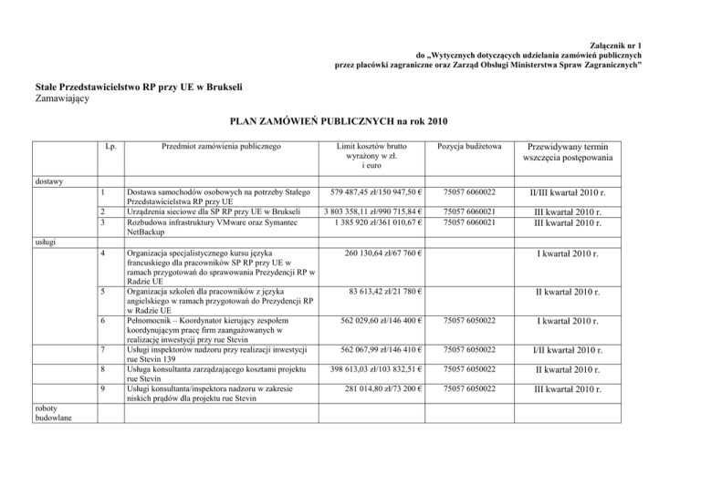 Załącznik nr 1 do „Wytycznych dotyczących udzielania zamówień publicznych przez placówki zagraniczne oraz Zarząd Obsługi Ministerstwa Spraw Zagranicznych” Stałe Przedstawicielstwo RP przy UE w Brukseli Zamawiający PLAN ZAMÓWIEŃ PUBLICZNYCH na rok 2010 Lp. Przedmiot zamówienia publicznego Limit kosztów brutto wyrażony w zł. i euro Pozycja budżetowa Przewidywany termin wszczęcia postępowania 579 487,45 zł/150 947,50 € 75057 6060022 II/III kwartał 2010 r. 3 803 358,11 zł/990 715,84 € 1 385 920 zł/361 010,67 € 75057 6060021 75057 6060021 III kwartał 2010 r. III kwartał 2010 r. dostawy 1 2 3 Dostawa samochodów osobowych na potrzeby Stałego Przedstawicielstwa RP przy UE Urządzenia sieciowe dla SP RP przy UE w Brukseli Rozbudowa infrastruktury VMware oraz Symantec NetBackup usługi 4 5 6 7 8 9 roboty budowlane Organizacja specjalistycznego kursu języka francuskiego dla pracowników SP RP przy UE w ramach przygotowań do sprawowania Prezydencji RP w Radzie UE Organizacja szkoleń dla pracowników z języka angielskiego w ramach przygotowań do Prezydencji RP w Radzie UE Pełnomocnik – Koordynator kierujący zespołem koordynującym pracę firm zaangażowanych w realizację inwestycji przy rue Stevin Usługi inspektorów nadzoru przy realizacji inwestycji rue Stevin 139 Usługa konsultanta zarządzającego kosztami projektu rue Stevin Usługi konsultanta/inspektora nadzoru w zakresie niskich prądów dla projektu rue Stevin 260 130,64 zł/67 760 € I kwartał 2010 r. 83 613,42 zł/21 780 € II kwartał 2010 r. 562 029,60 zł/146 400 € 75057 6050022 I kwartał 2010 r. 562 067,99 zł/146 410 € 75057 6050022 I/II kwartał 2010 r. 398 613,03 zł/103 832,51 € 75057 6050022 II kwartał 2010 r. 281 014,80 zł/73 200 € 75057 6050022 III kwartał 2010 r.