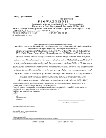 Nr rej.Upoważnień: .................../ ..............................dnia........................ (miejscowość) UPOWAŻNIENIE do działania w formie przedstawicielstwa 1. bezpośredniego Upoważniam Panią Teresę Olczak dow. osob. ATB 061490 i Panią Izabelę Raciborską-Jestadt dow.osob. APP375346 – pracowników Agencji Celnej „CELTEX” , ul. Przejazdowa 25, 05-800 Pruszków, REGON: 672733854-00029 NIP: 797-178-91-23 do podejmowania na rzecz: ( nazwa i siedziba osoby udzielającej upoważnienia) wszelkich czynności i formalności przed organami celnymi związanych z dokonywaniem obrotu towarowego z zagranicą i wewnątrz wspólnotowo: określonych przepisami WKC(Rozporz. Rady EWG nr 2913/92 z dn.12.10.1992)oraz ART. 75 i 78 Ustawy Prawo Celne (Dziennik Ustaw nr 68/2004 poz. 622),dokonywania zgłoszeń celnych,odbioru decyzji Naczelnika Urzędu Celnego, odbioru wszelkich pism, odbioru wszelkich dokumentów odprawy celnej,rejestracji w PDR i EORI, przedkładania i podpisywania dokumentów niezbędnych do wystawiania świadectw EUR1, ATR, świadectw pochodzenia, dokumentów tranzytowych, poświadczania statusu towarów oraz podpisywania i składania wszelkich wniosków, również dot. spraw podatkowych, reprezentowania przed organami celnymi również przy zgłoszeniach wewnątrz wspólnotowych, podpisywania tych zgłoszeń, saldowania zabezpieczeń,składania deklaracji i rozliczania podatku akcyzowego,nadawania i odbierania przesyłek pocztowych,zgłoszeń INTRASTAT. Jednocześnie wyrażam/ nie wyrażam zgody1 na udzielenie dalszego upoważnienia stosownie do art.77 Ustawy Prawo Celne ( Dziennik Ustaw nr 68/2004 poz.622) Prawo do wykonywania działań objętych pełnomocnictwem przynależy do wszystkich agentów celnych pracujących w tej agencji celnej „bez względu na rotacje kadrowe” Niniejsze upoważnienie ma charakter:* ogólny:* - stały terminowy do dnia................................. jednorazowy ---------------------------------------------------------( podpis upoważniającego) Potwierdzenie przyjęcia upoważnienia: --------------------------------------------------(data i podpis agenta celnego działającego w imieniu agencji celnej) *Niepotrzebne skreślić Uwaga: Przy składaniu niniejszego upoważnienia należy uiścić opłatę skarbową NIP 797-178-91-23 REGON 672733854-00029