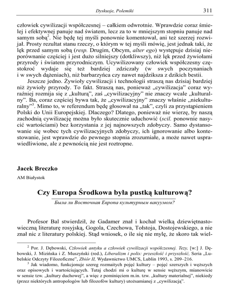 Dyskusje, Polemiki 311 człowiek cywilizacji współczesnej – całkiem odwrotnie. Wprawdzie coraz śmielej i efektywnej panuje nad światem, lecz za to w mniejszym stopniu panuje nad samym sobą2. Nie będę tej myśli ponownie komentował, ani teŜ szerzej rozwijał. Prosty rezultat stanu rzeczy, o którym w tej myśli mówię, jest jednak taki, Ŝe lęk przed samym sobą (resp. Drugim, Obcym, alter ego) występuje dzisiaj nieporównanie częściej i jest duŜo silniejszy (dotkliwszy), niŜ lęk przed Ŝywiołami przyrody i światem przyrodniczym. Ucywilizowany człowiek współczesny częstokroć wydaje się teŜ bardziej zdziczały (w swych poczynaniach i w swych dąŜeniach), niŜ barbarzyńca czy nawet najdziksza z dzikich bestii. Jeszcze jedno. śywioły cywilizacji i technologii straszą nas dzisiaj bardziej niŜ Ŝywioły przyrody. To fakt. Straszą nas, poniewaŜ „cywilizacja” coraz wyraźniej rozmija się z „kulturą”, zaś „cywilizacyjny” nie znaczy wcale „kulturalny”. Ba, coraz częściej bywa tak, Ŝe „cywilizacyjny” znaczy właśnie „niekulturalny”3. Mimo to, w referendum będę głosował na „tak”, czyli za przystąpieniem Polski do Unii Europejskiej. Dlaczego? Dlatego, poniewaŜ nie wierzę, by naszą zachodnią cywilizację moŜna było skutecznie uduchowić (scil. ponownie nasycić wartościami) bez korzystania z jej najnowszych zdobyczy. Samo dystansowanie się wobec tych cywilizacyjnych zdobyczy, ich ignorowanie albo kontestowanie, jest wprawdzie do pewnego stopnia zrozumiałe, a moŜe nawet usprawiedliwione, ale z pewnością nie jest roztropne. Jacek Breczko AM Białystok Czy Europa Środkowa była pustką kulturową? Была ли Восточная Европа культурным вакуумом? Profesor Bal stwierdził, Ŝe Gadamer znał i kochał wielką dziewiętnastowieczną literaturę rosyjską, Gogola, Czechowa, Tołstoja, Dostojewskiego, a nie znał nic z literatury polskiej. Stąd wniosek, o ile się nie mylę, Ŝe skoro tak wiel2 Por. J. Dębowski, Człowiek antyku a człowiek cywilizacji współczesnej. Tezy, [w:] J. Dębowski, J. Mizińska i Z. Muszyński (red.), Liberalizm i polis: przeszłość i przyszłość, Seria „Lubelskie Odczyty Filozoficzne”, Zbiór II, Wydawnictwo UMCS, Lublin 1993, s. 209–216. 3 Jak wiadomo, funkcjonuje szereg rozmaitych pojęć kultury – pojęć szerszych i węŜszych oraz opisowych i wartościujących. Tutaj chodzi mi o kulturę w sensie węŜszym, mianowicie w sensie tzw. „kultury duchowej”, a więc z pominięciem m.in. tzw. „kultury materialnej”, niekiedy (przez niektórych antropologów lub filozofów kultury) utoŜsamianej z „cywilizacją”. 312 Дискусси, Полемики ki myśliciel nie dostrzegał naszej kultury, to nie ma co z wielkością tej kultury przesadzać. Ten typ samokrytycyzmu nie jest mi obcy. Zmieniłem jednak zdanie. Jest tutaj ciekawa koncepcja Miłosza. Taka mianowicie, Ŝe elity intelektualne zachodu (Gadamer to elita elity) traktowały Europę Środkową jak białą plamę na mapie. Na kulturowej mapie Europy była wyraźnie odznaczona Francja, Włochy, Anglia, Niemcy, potem długo, długo nic, i następnie Rosja. Elity zachodnie nie znały więc Europy Środkowej i czuły respekt, szacunek wobec Rosji. I stąd być moŜe, jak twierdzi Miłosz, Jałta. Byliśmy do zbycia. Jedna potęga kulturowa podarowała dzikie obszary innej potędze. Niech je po swojemu cywilizuje, „ukulturalnia”. Czy jednak Europa Środkowa była rzeczywiście pustką kulturową? OtóŜ, nie. Nie tylko nie była pustką, ale była krainą głęboko kulturowo unerwioną. Rosja miała jednak szczęście, urodziło się tam kilku pisarzy – geniuszy. Zaś realistyczna literatura w dziewiętnastym wieku, z braku kamer i mikrofonów, była medium najsilniej oddziałującym. Przez literaturę poznawało się kulturę. Nie wiem, na ile dywizji przeliczyć pisarstwo Dostojewskiego, byłoby chyba jednak tych dywizji niemało. W Polsce urodził się jeden geniusz – Mickiewicz; był on jednak prawie nieprzekładalny. Ów pech literacko-historyczny miał powaŜne konsekwencje. Nie powstały w języku polskim dzieła, które mogłyby konkurować z wielką literaturą rosyjską. Być moŜe takie dzieła mógłby stworzyć Stanisław Brzozowski, ale umarł młodo. [Tutaj głos z sali, profesora Symotiuka: „A Witkacy i Gombrowicz?”] Witkacy i Gombrowicz to inna faza. To juŜ nie jest wielka literatura realistyczna. To literatura indywidualistyczna, egotyczna, świadomie deformująca. Wielka jako składnik kultury, ale nienadzwyczajna jako reflektor oświetlający kulturę. Idźmy jednak dalej. Wejście Polski, a szerzej, Europy Środkowej do Unii to szansa na zainteresowanie elit Zachodu ową białą plamą na mapie. „Skoro ta część jest nasza, to przyjrzyjmy się jej bliŜej”. I tutaj spotkają się, mam nadzieje, dwie tendencje, popyt i podaŜ. Popyt to ciekawość intelektualistów, głód odkrywania w labiryncie kultury niespenetrowanych jeszcze komnat, podaŜ to to, Ŝe ów labirynt w środkowej Europie jest naprawdę ciekawy, bogaty. Pojawią się więc zapewne „ochy” i „achy”. Najwyraźniej, jak sądzę, owo bogactwo, choć tylko z jednej strony, od strony własnej nacji, pokazał Isaac Bashevis Singer. Wzorując się na XIX-wiecznych realistach uratował fragment nieistniejącego juŜ świata; miasteczka Ŝydowskie, dwory chasydzkie, Ŝydowskie dzielnice w większych miastach. Trzeba jednak mieć świadomość, Ŝe obok tętniło inne Ŝycie – chłopskie, szlacheckie, magnackie; do tego w wielu formach religijnych i narodowych. A trochę niŜej na mapie podobna gęstość kulturowa, podobne unerwienie – kraina Habsburgów: Słowacy, Czesi, Węgrzy, Austriacy, Chorwaci, Serbowie, Słoweńcy, śydzi. Chciałbym teraz odnieść się do wypowiedzi profesora Symotiuka. Mówił pan o kryzysie utopii. W istocie, Platon sformułował pewien schemat ul