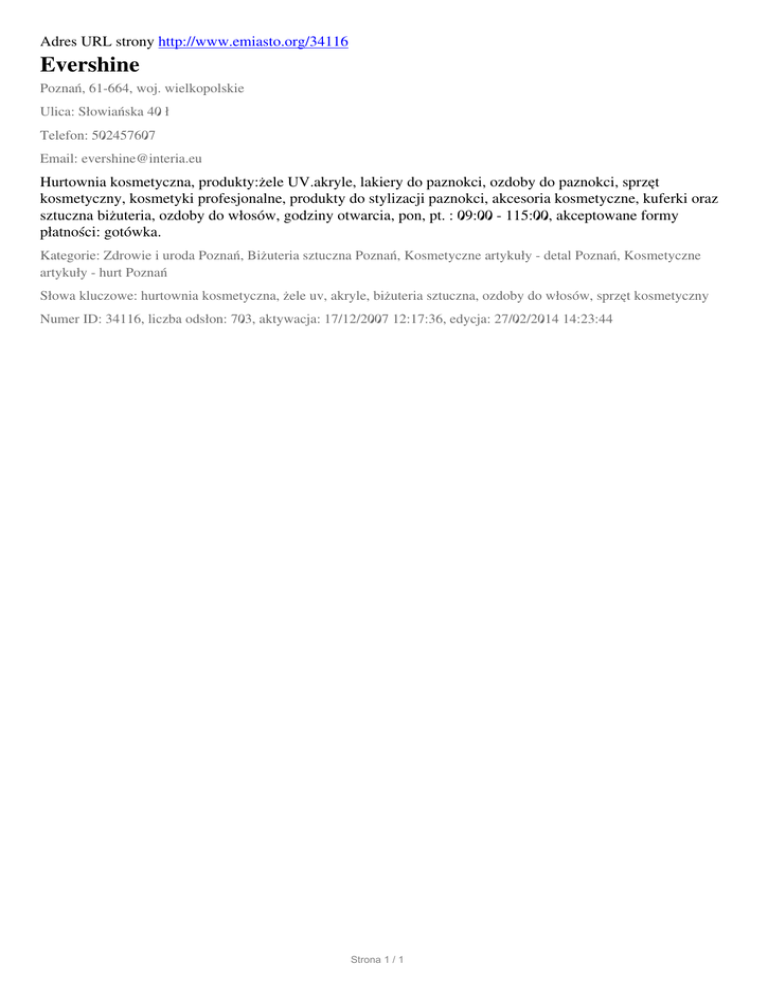Adres URL strony http://www.emiasto.org/34116 Evershine Poznań, 61-664, woj. wielkopolskie Ulica: Słowiańska 40 ł Telefon: 502457607 Email: [email protected] Hurtownia kosmetyczna, produkty:żele UV.akryle, lakiery do paznokci, ozdoby do paznokci, sprzęt kosmetyczny, kosmetyki profesjonalne, produkty do stylizacji paznokci, akcesoria kosmetyczne, kuferki oraz sztuczna biżuteria, ozdoby do włosów, godziny otwarcia, pon, pt. : 09:00 - 115:00, akceptowane formy płatności: gotówka. Kategorie: Zdrowie i uroda Poznań, Biżuteria sztuczna Poznań, Kosmetyczne artykuły - detal Poznań, Kosmetyczne artykuły - hurt Poznań Słowa kluczowe: hurtownia kosmetyczna, żele uv, akryle, biżuteria sztuczna, ozdoby do włosów, sprzęt kosmetyczny Numer ID: 34116, liczba odsłon: 703, aktywacja: 17/12/2007 12:17:36, edycja: 27/02/2014 14:23:44 Strona 1 / 1