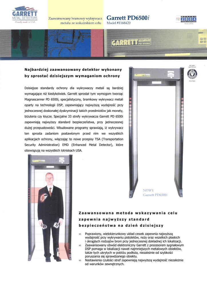 Najb ardzi ej za awans owany de tektor wyko nany b y s pros tać dzi s i ejs zym wymagani om och rony Dzisiejsze standardy ochrony dla wykrywaczy metali są bardziej wymagające niż kiedykolwiek. Garrett sprostał tym wymogom tworząc Magnascanner PD 6500i, specjalistyczny, bramkowy wykrywacz metali oparty na technologii DSP, zapewniający najwyższą wydajność przy jednoczesnej doskonałej dyskryminacji takich przedmiotów jak monety, biżuteria czy klucze. Specjalne 33 strefy wykrywacza Garrett PD 6500i zapewniają najwyższy standard bezpieczeństwa, przy jednoczesnej dużej przepustowości. Wbudowane programy sprawiają, iż wykrywacz ten sprosta zadaniom postawionym przed nim we wszystkich aplikacjach ochrony, włączając to nowe przepisy TSA (Transportation Security Administration) EMD (Enhanced Metal Detector), które obowiązują na wszystkich lotniskach USA. Zaawansowana metoda wskazywania celu zapewnia najwyższy standard bezpieczeństwa na dzień dzisiejszy • • • Poprawiony, wielokierunkowy układ cewek zapewnia najwyższą wydajność przy wykrywaniu pistoletów, noży oraz wszelkich płaskich i okrągłych rodzajów broni przy jednoczesnej dokładnej ich lokalizacji. Zaawansowany obwód elektroniczny Garrett z procesorem sygnałowym DSP pomaga w lokalizacji nawet najmniejszych metalowych obiektów, także tych ukrytych w pobliżu podłoża, niezależnie od szybkości poruszania się sprawdzanego obiektu. Nastawienia czułości stref zapewniają najwyższą wydajność niezależnie od warunków zewnętrznych. Znakomite cechy operacyjne zapewniają dużą przepustowość • • • • Opracowany przez Garrett wielostrefowy wskaźnik celu z 33 strefami precyzyjnej detekcji wskazuje (18 stref podstawowych oraz 15 stref pomocniczych) położenie celu z prawej, lewej i na środku obiektu oraz od głowy aż po stopy. Czytelne światła informujące o możliwości przejścia przez detektor z oznaczeniami „stój” ( ) i „idź”( ) Łatwa obsługa dzięki wyświetlaczom LED i LCD, pozwalającym na ciągłą, nieprzerwaną pracę z równoczesnym monitorowaniem pracy detektora. Przejrzysty panel kontrolny oraz łatwe w obsłudze menu pozwalające na szybką zmianę ustawień. Garrett PD 6500i jest opracowany z myślą o wszelkich możliwych aplikacjach: • Lotniska • Porty morskie • Sądy • Zakłady przemysłowe • Budynki prywatne i publiczne • Obiekty sportowe i stadiony • Imprezy masowe • Elektrownie atomowe • Terminale transportowe • Systemy przeciwkradzieżowe • Obiekty wojskowe i specjalne Szkoły i uczelnie wyższe • Dystrybucja w Polsce: 30-624 Kraków; ul. Alfreda Dauna 70 tel. 0-12 655-85-85, fax 0-12 425-63-68, kom. 0 501 704 101, e-mail: [email protected] ; http://www.talcomp.pl Garrett PD 6500i zaawansowany bramowy detektor metali ze wskaźnikiem celu. Model 1168410 Opis techniczny Specyfikacja Temperatura pracy: -20°C do 70°C Wilgotność: Do 95% nieskroplona Zasilanie: W pełni automatyczne od 100- 240 VDC, 50 lub 60 Hz, 5 W nie wymaga przestawiania czy regulacji, zasilanie spełnia wymogi UL, CSA, TUV oraz VDE. Możliwość podłączenia zasilania z prawej lub lewej strony i od góry. Odporność na warunki atmosferyczne/ wpływ obiektów zewnętrznych: Spełnia standard IP54 IEC. „Degrees of Protection Provided by Enclosures,” CEI529. Odporność przed niepowołaną zmianą ustawień: Wszystkie ustawienia zabezpieczone przy użyciu klucza oraz dwóch poziomów dostępowych blokowanych hasłem. Dodatkowo elektronika zabezpieczona w zamykanej kluczem obudowie. Konstrukcja: Odporna na zadrapania obudowa wysokiej jakości wykonana z laminatu, obudowa elektroniki z bardzo wytrzymałego aluminium. Modułowa budowa detektora, układ elektroniczny zintegrowany z detektorem. Wyjścia kontrolne: Wytrzymałe wtyczki do współpracy z zewnętrznymi urządzeniami kontrolnymi lub sygnalizatorami. Licznik przejść: Zlicza ilość przejść, ilość alarmów i wylicza procentowy stosunek alarmów do ilości przejść. Synchronizacja: Dwa kanały oraz układ DSP pozwalają na równoczesną pracę do 16 sztuk PD 6500i w pobliżu siebie. Odporność na zakłócenia: Wbudowany dedykowany układ DSP z funkcją samodiagnostyki eliminuje wpływ urządzeń rentgenowskich i innych potencjalnych elektronicznych źródeł zakłóceń. Kalibracja: Piętnaście (15) niezależnych programów opracowanych z myślą o specyficznych zastosowaniach detektora, włączając w to wymogi TSA Enhanced Metal Detector system obowiązujący na lotniskach USA i w lotach transatlantyckich. Regulacja czułości (1-200 ) dla każdego programu. Alarmy: Sygnał dźwiękowy o regulowanej wysokości i głośności. System czerwonych diod LED. Światła wskazujące cel: Trzydzieści trzy (33) strefy detekcji przedstawione za pomocą 2 niezależnych linii diodowych. Światła sygnalizacji przejścia: Międzynarodowe symbole „stój”( umieszczone są po stronie wejściowej detektora. ) i „idź” ( ) Dystrybucja w Polsce: 30-624 Kraków; ul. Alfreda Dauna 70 tel. 0-12 655-85-85, fax 0-12 425-63-68, kom. 0 501 704 101, e-mail: [email protected] ; http://www.talcomp.pl Wydajność produktu oraz zgodności ze standardami PD 6500i zostało zakwalifikowane przez TSA (Transportation Security Administration) jako zgodne z najnowszymi wymogami EMD (Enhanced Metal Detector), dla bramowych wykrywaczy metali. Ponadto, PD 6500i zostało przetestowane i uznane za zgodne z wymogami standardu NIJ 0601.02 dla bramowych wykrywaczy metali do wykorzystania przy detekcji broni czy przemytu. Spełnia także wymagania testu 3-Gun FAA (Federal Aviation Administration). Informacje dodatkowe PD 6500i spełnia wszystkie wymogi bezpieczeństwa przemysłowego oraz elektromagnetycznego (EMC), spełnia także między narodowe dyrektywy (certyfikaty , CSA, TEC, CB). PD 6500i jest bezpieczne dla użytkowników rozruszników serca, kobiet w ciąży oraz magnetycznych nośników danych. • International