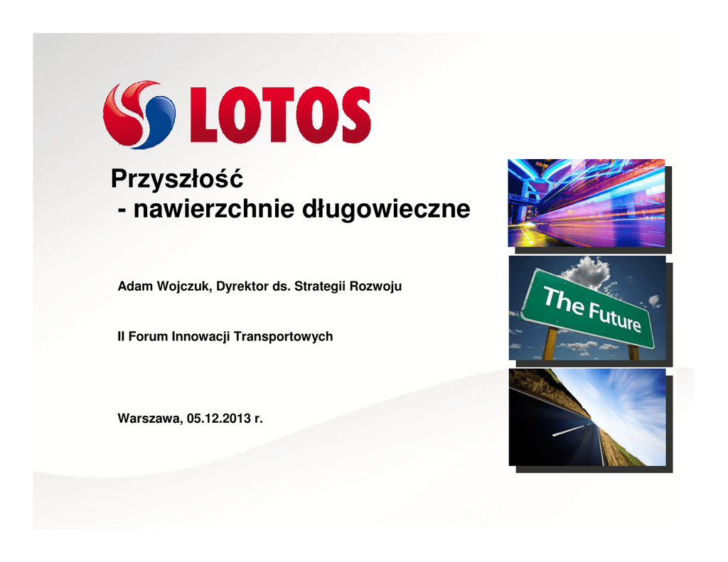 Przyszłość - nawierzchnie długowieczne Adam Wojczuk, Dyrektor ds. Strategii Rozwoju II Forum Innowacji Transportowych Warszawa, 05.12.2013 r. LOTOS Asfalt Sp. z o.o. Plan prezentacji Nawierzchnie długowieczne - drogami przyszłości Oczekiwania użytkowników i zarządców wobec dróg Koncepcja nawierzchni długowiecznej Technologie i materiały do nawierzchni długowiecznych Innowacyjny produkt LOTOS Asfalt do długowiecznych technologii Wnioski Adam Wojczuk, Dyrektor ds. Strategii Rozwoju II Forum Innowacji Transportowych 2/15 Warszawa, 05.12.2013 r. LOTOS Asfalt Sp. z o.o. Dlaczego potrzebujemy dróg długowiecznych? Wzrost obciążenia pojazdów Ciągły wzrost natężenia ruchu Ograniczona częstotliwość remontów z powodu zbyt małej sieci dróg Szybsza degradacja nawierzchni spowodowana większą jej eksploatacją Adam Wojczuk, Dyrektor ds. Strategii Rozwoju II Forum Innowacji Transportowych 3/15 Warszawa, 05.12.2013 r. LOTOS Asfalt Sp. z o.o. Dlaczego potrzebujemy dróg długowiecznych? Adam Wojczuk, Dyrektor ds. Strategii Rozwoju II Forum Innowacji Transportowych 4/15 Warszawa, 05.12.2013 r. LOTOS Asfalt Sp. z o.o. Dzisiejsze oczekiwania użytkownika wobec dróg… Adam Wojczuk, Dyrektor ds. Strategii Rozwoju II Forum Innowacji Transportowych komfort bezpieczeństwo szybkie przemieszczanie się oszczędne zużycie paliwa 5/15 Warszawa, 05.12.2013 r. LOTOS Asfalt Sp. z o.o. Dzisiejsze oczekiwania użytkownika wobec dróg Funkcjonalność Równa Cicha Odporna na koleinowanie Odporna na spękania Szorstka = bezpieczna Ekonomiczne i ekologiczne Efektywna w produkcji i wykonaniu Umożliwiająca szybkie wznowienie ruchu Nadająca się w pełni do recyklingu Łatwa w remoncie Adam Wojczuk, Dyrektor ds. Strategii Rozwoju II Forum Innowacji Transportowych 6/15 Warszawa, 05.12.2013 r. LOTOS Asfalt Sp. z o.o. Nawierzchnie długowieczne - definicja Nawierzchnie długowieczne są nawierzchniami asfaltowymi zaprojektowanymi i zbudowanymi aby trwać dłużej niż 50 lat bez konieczności przeprowadzenia poważnych napraw konstrukcji. W nawierzchniach tego typu potrzebne jest jedynie okresowe odnowienie powierzchni związane z uszkodzeniami Podobna koncepcja nawierzchni asfaltowych o przedłużonej trwałości pojawiła się również w USA. górnej warstwy. Trwałość 50 lat ! (ASPHALT PAVEMENT ALLIANCE·IM-40) Adam Wojczuk, Dyrektor ds. Strategii Rozwoju II Forum Innowacji Transportowych 7/15 Warszawa, 05.12.2013 r. LOTOS Asfalt Sp. z o.o. Koncepcja nawierzchni długowiecznych Funkcje poszczególnych warstw nawierzchni: Warstwa ścieralna Odnawialna warstwa (SMA,BBTM,PA) – cicha, szorstka i odporna na spękania niskotemperaturowe Warstwa wiążąca Warstwa o zwiększonej grubości z mieszanek odpornych na koleinowanie, o wysokim module sztywności Warstwa podbudowy Mieszanka elastyczna o zwiększonej odporności na zmęczenie (warstwa przeciwspękaniowa) Adam Wojczuk, Dyrektor ds. Strategii Rozwoju II Forum Innowacji Transportowych 8/15 Warszawa, 05.12.2013 r. LOTOS Asfalt Sp. z o.o. Koncepcja nawierzchni długowiecznych MODBIT 45/80-55 , MODBIT 45/80-65, lub MODBIT 45/80-55 CR MODBIT 25/55-60 MODBIT 25/55-60 CR UNIBIT 35/50 MODBIT 45/80-65 MODBIT 45/80-65 CR Trwałość osiągnięto przez ograniczenie odkształceń rozciągających na spodzie warstw asfaltowych: Zwiększenie grubości pakietu warstw asfaltowych Zastosowanie materiałów wyższej jakości Adam Wojczuk, Dyrektor ds. Strategii Rozwoju II Forum Innowacji Transportowych 9/15 Warszawa, 05.12.2013 r. LOTOS Asfalt Sp. z o.o. Technologie i materiały do nawierzchni długowiecznych Lepiszcza asfaltowe do zastosowania w polskim klimacie (o szerokim zakresie lepkosprężystym): Asfalty modyfikowane z dodatkiem miału gumowego MODBIT CR Asfalty średnio i wysokomodyfikowane MODBIT Asfalty wielorodzajowe - UNIBIT Mieszanki mineralno-asfaltowe o zwiększonej odporności na deformacje trwałe typu AC WMS Adam Wojczuk, Dyrektor ds. Strategii Rozwoju II Forum Innowacji Transportowych 10/15 Warszawa, 05.12.2013 r. LOTOS Asfalt Sp. z o.o. Innowacyjny asfalt MODBIT 25/55-60 CR do technologii długowiecznych Modyfikato r polimer Lepiszcze asfaltowe Dodatek guma Adam Wojczuk, Dyrektor ds. Strategii Rozwoju II Forum Innowacji Transportowych Asfalt modyfikowany z dodatkiem gumy 11/15 Warszawa, 05.12.2013 r. LOTOS Asfalt Sp. z o.o. Zalecenie stosowania MODBITU 25/55-60 CR do warstw wiążących i podbudów typu AC WMS Rekomenduje się zastosowanie asfaltu MODBIT 25/55-60 do AC WMS do nawierzchni długowiecznych ze względu na: Wysoką odporność na starzenie Wysoką odporność na zmęczenie Odporność na niskie temperatury Ekologię Do produkcji asfaltu przeznaczonego na 1 km warstwy wiążącej do nawierzchni długowiecznych zużywa się około 2000 opon samochodowych ! Adam Wojczuk, Dyrektor ds. Strategii Rozwoju II Forum Innowacji Transportowych 12/15 Warszawa, 05.12.2013 r. LOTOS Asfalt Sp. z o.o. Nawierzchnie długowieczne w przepisach krajowych GDDKiA zleciła wykonanie „Katalogu typowych konstrukcji nawierzchni podatnych i półsztywnych” z uwzględnieniem nawierzchni o zwiększonej trwałości obliczeniowej - tzw. nawierzchni długowiecznych. Adam Wojczuk, Dyrektor ds. Strategii Rozwoju II Forum Innowacji Transportowych 13/15 Warszawa, 05.12.2013 r. LOTOS Asfalt Sp. z o.o. Przyszłość - wnioski: Dzisiejsze technologie pozwalają na budowę długowiecznych nawierzchni asfaltowych o trwałości nawet 40-50 lat! Na rynku polskim dostępne są nowoczesne lepiszcza o bardzo dobrych właściwościach zbliżonych do asfaltu „idealnego” charakteryzujące się odpornością na odkształcenia trwałe oraz na spękania niskotemperaturowe. Jedną z propozycji lepiszcza do nawierzchni długowiecznych jest MODBIT 25/55-60 CR produkowany przez LOTOS Asfalt, który oprócz doskonałych właściwości funkcjonalnych wychodzi naprzeciw nowoczesnym wymaganiom w zakresie ochrony środowiska. Adam Wojczuk, Dyrektor ds. Strategii Rozwoju II 
