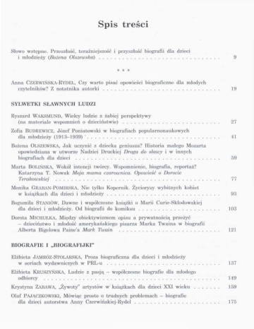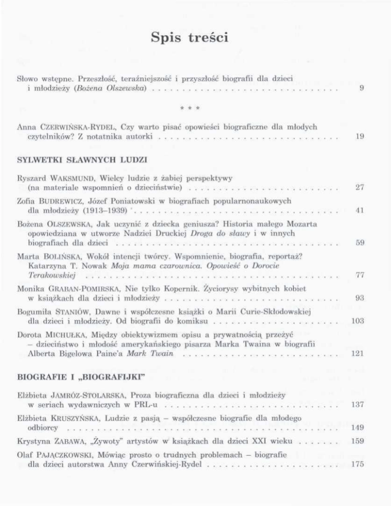 Spis treści Słowo wstępne. Przeszłość, teraźniejszość i przyszłość biografii dla dzieci i młodzieży (Bożena Olszewska) 9 * ** Anna CZERWIŃSKA-RYDEL, Czy warto pisać opowieści biograficzne dla młodych czytelników? Z notatnika autorki SYLWETKI SŁAWNYCH 19 LUDZI Ryszard WAKSMUND, Wielcy ludzie z żabiej perspektywy (na materiale wspomnień o dzieciństwie) 27 Zofia BUDREWICZ, Józef Poniatowski w biografiach popularnonaukowych dla młodzieży (1913-1939) ' 41 Bożena OLSZEWSKA, Jak uczynić z dziecka geniusza? Historia małego Mozarta opowiedziana w utworze Nadziei Druckiej Droga do stawy i w innych biografiach dla dzieci 59 Marta BOUŃSKA, Wokół intencji twórcy. Wspomnienie, biografia, reportaż? Katarzyna T. Nowak Moja mama czarownica. Opowieść o Dorocie Terakowskiej 77 Monika GRABAN-POMIRSKA, Nie tylko Kopernik. Życiorysy wybitnych kobiet w książkach dla dzieci i młodzieży 93 Bogumiła STANIÓW, Dawne i współczesne książki o Marii Curie-Skłodowskiej dla dzieci i młodzieży. Od biografii do komiksu 103 Dorota MlCIIUŁKA, Między obiektywizmem opisu a prywatnością przeżyć — dzieciństwo i młodość amerykańskiego pisarza Marka Twaina w biografii Alberta Bigelowa Paine'a Mark Twain 121 BIOGRAFIE I „BIOGRAFIJKI" Elżbieta JAMRÓZ-STOLARSKA, Proza biograficzna dla dzieci i młodzieży w seriach wydawniczych w PRL-u 137 Elżbieta KRUSZYŃSKA, Ludzie z pasją - współczesne biografie dla młodego odbiorcy 149 Krystyna ZABAWA, „Żywoty" artystów w książkach dla dzieci XXI wieku 159 Olaf PAJĄCZKOWSKI, Mówiąc prosto o trudnych problemach — biografie dla dzieci autorstwa Anny Czerwińskiej-Rydel 175 BIOGRAFIE W TEKSTACH KULTURY Danuta KRZYŻYK, Helena SYNOWIEC, Teksty hagiograficzne w „Małym Gościu Niedzielnym" - wybrane problemy badawcze 187 Katarzyna TAŁUĆ, Biografia w komiksie 203 Małgorzata WÓJCIK-DUDEK, Miedzy taktyką a strategią - o wybranych biografiach Janusza Korczaka kierowanych do młodego odbiorcy 217 Małgorzata KUCHARSKA, Biografie sławnych podróżników w świetle „Płomyka" (1917-1939) 229 Agnieszka KARCZEWSKA, „Rycerze Wolności". Analiza sylwetek Teodora Herzla i Józefa Trumpeldora w „Chwilce Dzieci i Młodzieży" (1925-1937) 243 MODELE, WZORCE WYCHOWAWCZE I FUNKCJE BIOGRAFII Franciszek ROSIŃSKI, Wzorce tradycyjne i nowoczesne do naśladowania dla młodzieży nowogwinejskiej 261 Jolanta ŁUGOWSKA, Opowieść biograficzna i jej funkcje w twórczości Janusza Korczaka (na przykładzie utworów o Ludwiku Pasteurze) 283 Maciej WKÓBLEWSKI, Biografia jako strategia budowania wiedzy dziecka na temat nauki na przykładzie prozy Juliusza Jerzego Herlingera 295 Elżbieta KUR, Rycerze sztuki. Fascynujące opowieści o malarzach Amy Steedman - popularyzacja sztuki włoskiej wśród młodych czytelników poprzez biografie artystów 307 GENOLOGIA Alicja BALUCH, Obraz lalki w dziecięcej biografistyce - „miejsca wspólne" 321 Zofia OŻÓG-WlNIARSKA, Biografie historyczno-narodowe w liryce dla dzieci i młodzieży u zarania niepodległości Polski. Wokół „śpiewów historycznych" Michaliny Chełmońskiej-Szczepankowskiej 331 Grażyna I.ASOŃ-KOCHAŃSKA, „Ta wstrętna Ania". O bohaterce Lucy Maud Montgomery w kontekście autogynografii 345 W KRĘGU TEORII Katarzyna WAUOLNY-TATAR, (Re)konstrukcja osoby. Chopin Anny Czerwińskiej-Rydel i Korczak Beaty Ostrowickiej 359 Irena JOKIEL, „...dawno, dawno temu...", czyli Patricka Siiskinda opowieść 0 dzieciństwie 373 Katarzyna SljANY, O zależnościach między autobiograficznymi narracjami Roalda Dahla a jego pajdokratyczną powieścią dla dzieci i młodzieży 381 Lidia URBAŃCZYK, Między autobiografią a autofikcją - twórczość Ulfa Starka 1 Neila Gaimana 397 BIOGRAFIE W EDUKACJI SZKOLNEJ I POZASZKOLNEJ Zofia Agnieszka KŁAKÓWNA, Biografia w szkole 413 Ewa OGŁ.OZA, O Isaacu Newtonie i Williamie Blake'u na lekcjach języka polskiego 429 Leszek JAZOWNIK, Teksty biograficzne jako narzędzia terapeutycznych oddziaływań na dzieci i młodzież (wybrana problematyka) 445 Małgorzata GAJAK-TOCZKK, Konopnicka w teatrze życia codziennego - studentów polonistyki próba szkicu biografii niebanalnej 459 Ewelina KONIECZNA, Biografie „zwykłych ludzi". Konteksty pedagogiczne 475 Maria KULIK, Odkrywanie i przybliżanie. Współczesne utwory biograficzne dla młodego czytelnika 491 Indeks osób 497