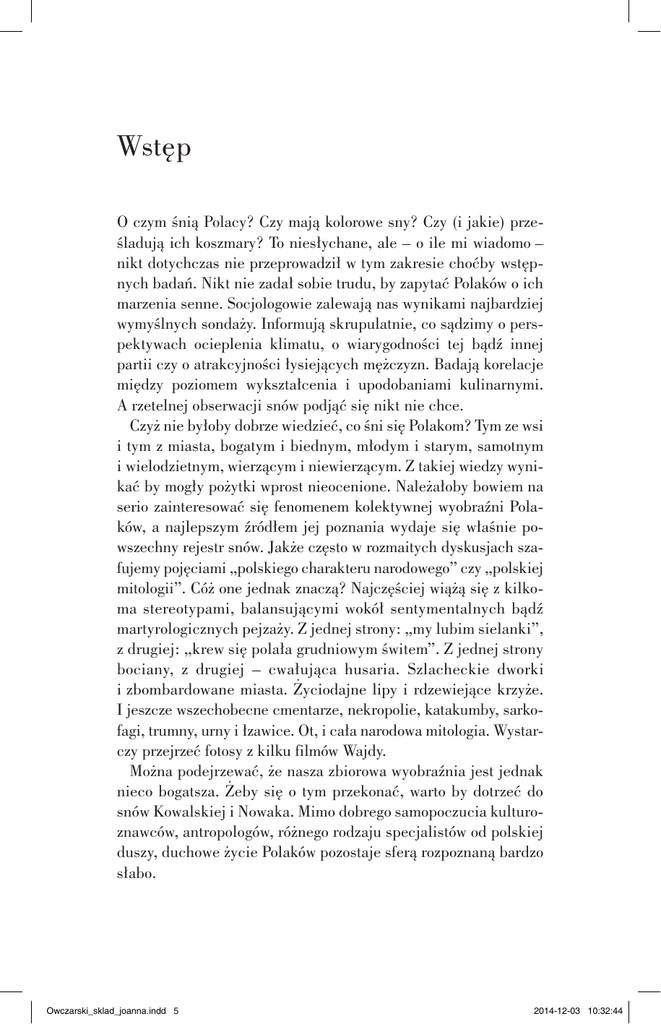 Wstęp O czym śnią Polacy? Czy mają kolorowe sny? Czy (i jakie) prze śladują ich koszmary? To niesłychane, ale – o ile mi wiadomo – nikt dotychczas nie przeprowadził w tym zakresie choćby wstęp nych badań. Nikt nie zadał sobie trudu, by zapytać Polaków o ich marzenia senne. Socjologowie zalewają nas wynikami najbardziej wymyślnych sondaży. Informują skrupulatnie, co sądzimy o pers pektywach ocieplenia klimatu, o wiarygodności tej bądź innej partii czy o atrakcyjności łysiejących mężczyzn. Badają korelacje między poziomem wykształcenia i upodobaniami kulinarnymi. A rzetelnej obserwacji snów podjąć się nikt nie chce. Czyż nie byłoby dobrze wiedzieć, co śni się Polakom? Tym ze wsi i tym z miasta, bogatym i biednym, młodym i starym, samotnym i wielodzietnym, wierzącym i niewierzącym. Z takiej wiedzy wyni kać by mogły pożytki wprost nieocenione. Należałoby bowiem na serio zainteresować się fenomenem kolektywnej wyobraźni Pola ków, a najlepszym źródłem jej poznania wydaje się właśnie po wszechny rejestr snów. Jakże często w rozmaitych dyskusjach sza fujemy pojęciami „polskiego charakteru narodowego” czy „polskiej mitologii”. Cóż one jednak znaczą? Najczęściej wiążą się z kilko ma stereotypami, balansującymi wokół sentymentalnych bądź martyrologicznych pejzaży. Z jednej strony: „my lubim sielanki”, z drugiej: „krew się polała grudniowym świtem”. Z jednej strony bociany, z drugiej – cwałująca husaria. Szlacheckie dworki i zbombardowane miasta. Życiodajne lipy i rdzewiejące krzyże. I jeszcze wszechobecne cmentarze, nekropolie, katakumby, sarko fagi, trumny, urny i łzawice. Ot, i cała narodowa mitologia. Wystar czy przejrzeć fotosy z kilku filmów Wajdy. Można podejrzewać, że nasza zbiorowa wyobraźnia jest jednak nieco bogatsza. Żeby się o tym przekonać, warto by dotrzeć do snów Kowalskiej i Nowaka. Mimo dobrego samopoczucia kulturo znawców, antropologów, różnego rodzaju specjalistów od polskiej duszy, duchowe życie Polaków pozostaje sferą rozpoznaną bardzo słabo. Owczarski_sklad_joanna.indd 5 2014-12-03 10:32:44 6 | SENNIK POLSKI Być może nie najmniej istotną tego przyczyną jest – powszechny w Polsce – stan permanentnego niewyspania… Od roku 1989, kie dy to złapaliśmy wreszcie wiatr w skrzydła, pozostajemy w nieustan nym biegu, w pogoni za straconym cywilizacyjnie czasem. Nie sprzyja to, rzecz jasna, trosce o wypoczynek. Śpimy krótko i nerwo wo, coraz częściej zarywamy noce i walczymy z sennością wszelkimi możliwymi używkami. A gdy organizm w końcu odmówi posłuszeń stwa, zapadamy się w otchłań kamiennego letargu, w którym z re guły nic nam się nie śni. Po czym wyrywa nas z niego dynamiczna melodia budzika w nieodłącznej komórce. Cierpimy więc nie tylko na brak snu, ale i na chroniczny niedobór marzeń sennych. A, jak wiadomo, dla życia duchowego oznaczać to może katastrofę. Na domiar złego pozbawieni jesteśmy naturalnych procesów zasypiania i budzenia się, kiedy to związek z rzeczywistością stopniowo się rozluźnia i można się delektować powolnym przechodzeniem do innej formy istnienia lub gdy powraca się, równie powoli, do stanu zwanego jawą. To właśnie te procesy – czego postaram się dowieść – odgrywają ważną rolę w kształtowaniu się tożsamości, to one mają niemały wpływ na to, czy wiemy, kim jesteśmy. Nonszalancja Polaków wobec snu, szczególnie widoczna ostat nio, w czasach wzorowanego na kulturze zachodniej wyścigu szczu rów, ma jednak swoje głębsze, historyczne korzenie. Generalny ton polskiej kulturze od dawna nadawał imperatyw heroicznego czy nu, dokonywanego na jawie, w pełnej mobilizacji świadomych władz umysłu. Na dowód takiego stanu rzeczy dałoby się ułożyć pokaźną antologię literackich wypisów – od romantyzmu do dziś. „Albowiem starsi między Wami nie są ci, którzy najspokojniej na starszeństwie zasypiają i z urzędu swego bogacą się. Ale ci, którzy najwięcej troszczą się i najmniej śpią” – pouczał wieszcz w Księgach pielgrzymstwa polskiego1. […] będęż spokojnie drzemał, aż Niemcy napadną I sennego związawszy, w ręce katowskie oddadzą? – czytaliśmy od dziecka w Konradzie Wallenrodzie2. Obfitująca w nieszczęścia Historia wymagała od nas nieprzerwa nego niemal stanu czuwania. „Do broni! Do broni! / Pókiż będzie Owczarski_sklad_joanna.indd 6 2014-12-03 10:32:44 WSTĘP | 7 cie spać w podłej niewoli?!” – wzywała Nike Napoleonidów w Nocy listopadowej3. Mocnym snem cieszyć się mogli pozbawieni sumie nia konformiści lub, w najlepszym wypadku, bezmyślni maminsyn kowie: „Od dnia ślubu mojego spałem snem odrętwiałych, snem żarłoków, snem fabrykanta Niemca przy żonie Niemce – świat cały jakoś zasnął wokoło mnie na podobieństwo moje – jeździłem po krewnych, po doktorach, po sklepach, a że dziecię ma się mi na rodzić, myślałem o mamce”4. Prawdziwi Polacy nie spali, spiskując albo cierpiąc męczarnie. W dobrym tonie była bezsenność, bladość, podkrążone oczy i wczesna śmierć – najlepiej z ręki wroga albo ostatecznie na su choty. Rumiane, gładkie lica wyspanych lekkoduchów budziły zazwyczaj obrzydzenie. Od spokojnego „snu sprawiedliwych” za wsze wyżej ceniliśmy „długie nocne rodaków rozmowy”. Z tych właśnie powodów nigdy nie rozwinęła się na dobre noc na strona polskiej kultury. Mimo zafascynowania polskich roman tyków nocą, „imaginacją” i zwłaszcza marzeniem sennym, mimo późniejszych kontynuacji tychże zainteresowań (szczególnie w do bie modernizmu) – nie byliśmy w stanie naprawdę docenić korzy ści, które niesie dobrowolne i bezinteresowne zanurzenie się w świecie onirycznej wyobraźni. Noc kojarzy się Polakom nie odmiennie z czasem złowrogim i ponurym, z okresem, który trze ba za wszelką cenę czymś wypełnić, jakoś przeczekać, 