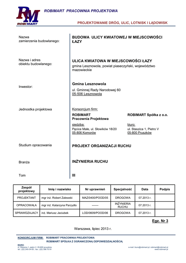 ROBIMART PRACOWNIA PROJEKTOWA PROJEKTOWANIE DRÓG, ULIC, LOTNISK I LĄDOWISK Nazwa zamierzenia budowlanego: BUDOWA ULICY KWIATOWEJ W MIEJSCOWOŚCI ŁAZY Nazwa i adres obiektu budowlanego: ULICA KWIATOWA W MIEJSCOWOŚCI ŁAZY gmina Lesznowola, powiat piaseczyński, województwo mazowieckie Gmina Lesznowola Inwestor: ul. Gminnej Rady Narodowej 60 05-506 Lesznowola Jednostka projektowa Konsorcjum firm: ROBIMART Pracownia Projektowa ROBIMART Spółka z o.o. siedziba: Pęcice Małe, ul. Słowików 18/20 05-806 Komorów biuro: ul. Staszica 1, Pietro V 05-800 Pruszków Studium opracowania PROJEKT ORGANIZACJI RUCHU Branża INŻYNIERIA RUCHU Tom III Zespół projektowy Imię i nazwisko PROJEKTANT mgr inż. Robert Zalewski OPRACOWAŁA mgr inż. Katarzyna Parzydło SPRAWDZAJACY inż. Mariusz Jaciubek Nr uprawnień Specjalność Data MAZ/0400/POOD/05 DROGOWA 07.2013 r. ------- INŻYNIERIA RUCHU 07.2013 r. LOD/0609/POOD/06 DROGOWA 07.2013 r. Podpis Egz. Nr 3 Warszawa, lipiec 2013 r. KONSORCJUM FIRM: ROBIMART PRACOWNIA PROJEKTOWA ROBIMART SPÓŁKA Z OGRANICZONĄ ODPOWIEDZIALNOŚCIĄ BIURO: ul. Staszica 1, piętro V, 05-800 pruszków tel.: (22) 245-34-00 ; fax.: (22) 398 70 91 e-mail: [email protected]; [email protected] www.robimart.pl Budowa ulicy Kwiatowej w Łazach SPIS ZAWARTOŚCI PROJEKTU OPIS DO PROJEKTU ORGANIZACJI RUCHU ..................................................................................... 3 1. WSTĘP ....................................................................................................................................... 3 1.1. MATERIAŁY WYJŚCIOWE ................................................................................................................ 3 1.2. PRZEDMIOT I CEL INWESTYCJI ........................................................................................................ 3 1.3. CEL I ZAKRES DOKUMENTACJI ........................................................................................................ 3 2. ISTNIEJĄCA ORGANIZACJA RUCHU ...................................................................................... 3 2.1. OZNAKOWANIE POZIOME ............................................................................................................... 3 2.2. OZNAKOWANIE PIONOWE............................................................................................................... 3 3. PARAMETRY PROJEKTOWE DROGI ...................................................................................... 4 4. PROJEKTOWANA ORGANIZACJA RUCHU ............................................................................. 4 4.1. OZNAKOWANIE POZIOME ............................................................................................................... 4 4.2. OZNAKOWANIE PIONOWE............................................................................................................... 4 5. TERMIN WPROWADZENIA PROJEKTOWANEJ ORGANIZACJI RUCHU ............................... 6 6. OPINIE I UZGODNIENIA ............................................................................................................ 6 RYSUNKI................................................................................................................................................. 7 PLAN ORIENTACYJNY (RYS. NR 1) ........................................................................................................... 7 PLAN SYTUACYJNY OZNAKOWANIA (RYS. NR 2.1) .................................................................................... 8 PLAN SYTUACYJNY OZNAKOWANIA (RYS. NR 2.2) .................................................................................... 9 ROBIMART PRACOWNIA PROJEKTOWA PROJEKT ORGANIZACJI RUCHU Strona | 2 Budowa ulicy Kwiatowej w Łazach OPIS DO PROJEKTU ORGANIZACJI RUCHU 1. WSTĘP 1.1. Materiały wyjściowe Podstawę do opracowania przedmiotowej dokumentacji stanowią: Umowa na wykonanie dokumentacji projektowej nr RZP.272.02.12.43.2012 z dnia 28.09.2012 r. zawarta pomiędzy Zamawiającym Gminą Lesznowola a Wykonawcą Robimart Pracownia Projektowa Zalewski Robert Inwentaryzacja stanu istniejącego przeprowadzona przez Projektantów w październiku 2012 r. oraz kwietniu 2013 r. Rozporządzenie Ministra Transportu i Gospodarki Morskiej z dnia 2 marca 1999 r. w sprawie warunków technicznych, jakim powinny odpowiadać drogi publiczne i ich usytuowanie (Dz. U. 1999 nr 43, poz. 430), Rozporządzenie Ministra Infrastruktury z dnia 23 września 2003 r. w sprawie szczegółowych warunków zarządzania ruchem na drogach oraz wykonywania nadzoru nad tym zarządzaniem (Dz. U. 2003 nr 177, poz. 1729), Rozporządzenie Ministra Infrastruktury z dnia 3 lipca 2003 r. w sprawie szczegółowych warunków technicznych dla znaków i sygnałów drogowych oraz urządzeń bezpieczeństwa ruchu drogowego i warunków ich umieszczania na drogach (Dz. U. 2003 nr 220, poz. 2181). 1.2. Przedmiot i cel inwestycji Niniejszy projekt dotyczy budowy ulicy Kwiatowej w miejscowości Łazy, Gmina Lesznowola w zakresie jezdni, chodników, oświetlenia drogowego, oraz kanalizacji deszczowej i przebudowy sieci kablowej telekomunikacyjnej Celem inwestycji jest zapewnienie obsługi ruchu pojazdów samochodowych oraz pieszych na przedmiotowej ulicy. 1.3. Cel i zakres dokumentacji Niniejszy projekt stałej organizacji ruchu ma na celu uzyskanie zatwierdzenia organu zarządzającego ruchem, a następnie wdrożenia go po wykonaniu rozbudowy przedmiotowej drogi. 2. ISTNIEJĄCA ORGANIZACJA RUCHU 2.1. Oznakowanie poziome Na przedmiotowym odcinku brak jest istniejącego oznakowania poziomego. 2.2. Oznakowanie pionowe W trakcie przygotowania opracowania zinwentaryzowano istniejące oznakowanie pionowe, którego pikietaż ustalono na podstawie projektowanego. ROBIMART PRACOWNIA PROJEKTOWA PROJEKT ORGANIZACJI RUCHU Strona | 3 Budowa ulicy Kwiatowej w Łazach ZESTAWIENIE ISTNIEJĄCEGO OZNAKOWANIA PIONOWEGO NA ULICY KWIATOWEJ W ŁAZACH L.p. Pikietaż Numer Znaku Strona 