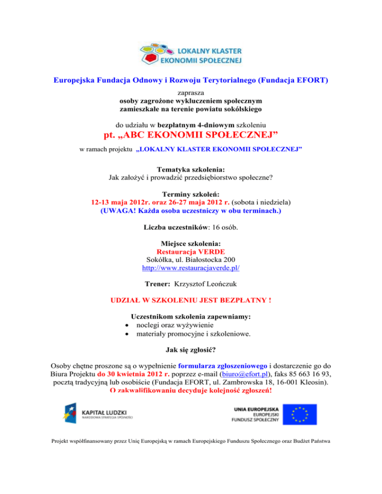 Europejska Fundacja Odnowy i Rozwoju Terytorialnego (Fundacja EFORT) zaprasza osoby zagroŜone wykluczeniem społecznym zamieszkałe na terenie powiatu sokólskiego do udziału w bezpłatnym 4-dniowym szkoleniu pt. „ABC EKONOMII SPOŁECZNEJ” w ramach projektu „LOKALNY KLASTER EKONOMII SPOŁECZNEJ” Tematyka szkolenia: Jak załoŜyć i prowadzić przedsiębiorstwo społeczne? Terminy szkoleń: 12-13 maja 2012r. oraz 26-27 maja 2012 r. (sobota i niedziela) (UWAGA! KaŜda osoba uczestniczy w obu terminach.) Liczba uczestników: 16 osób. Miejsce szkolenia: Restauracja VERDE Sokółka, ul. Białostocka 200 http://www.restauracjaverde.pl/ Trener: Krzysztof Leończuk UDZIAŁ W SZKOLENIU JEST BEZPŁATNY ! Uczestnikom szkolenia zapewniamy: • noclegi oraz wyŜywienie • materiały promocyjne i szkoleniowe. Jak się zgłosić? Osoby chętne proszone są o wypełnienie formularza zgłoszeniowego i dostarczenie go do Biura Projektu do 30 kwietnia 2012 r. poprzez e-mail ([email protected]), faks 85 663 16 93, pocztą tradycyjną lub osobiście (Fundacja EFORT, ul. Zambrowska 18, 16-001 Kleosin). O zakwalifikowaniu decyduje kolejność zgłoszeń! Projekt współfinansowany przez Unię Europejską w ramach Europejskiego Funduszu Społecznego oraz BudŜet Państwa