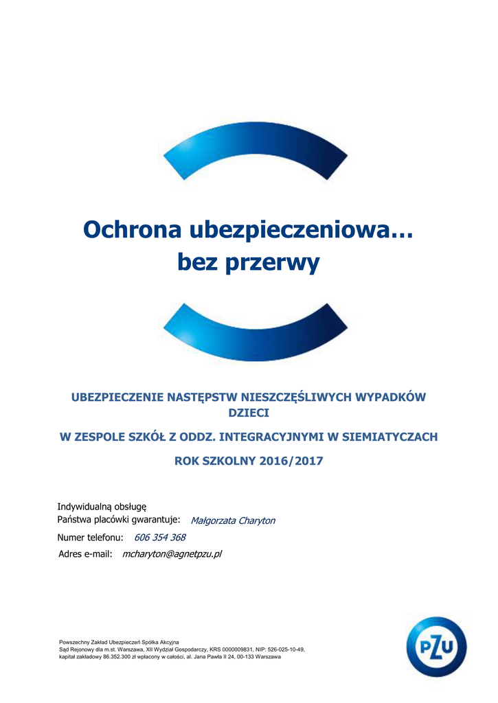 Ochrona ubezpieczeniowa… bez przerwy UBEZPIECZENIE NASTĘPSTW NIESZCZĘŚLIWYCH WYPADKÓW DZIECI W ZESPOLE SZKÓŁ Z ODDZ. INTEGRACYJNYMI W SIEMIATYCZACH ROK SZKOLNY 2016/2017 Indywidualną obsługę Państwa placówki gwarantuje: Numer telefonu: Adres e-mail: Małgorzata Charyton 606 354 368 [email protected] Powszechny Zakład Ubezpieczeń Spółka Akcyjna Sąd Rejonowy dla m.st. Warszawa, XII Wydział Gospodarczy, KRS 0000009831, NIP: 526-025-10-49, kapitał zakładowy 86.352.300 zł wpłacony w całości, al. Jana Pawła II 24, 00-133 Warszawa UBEZPIECZENIE NNW Ubezpieczenie ma charakter ubezpieczenia grupowego. Przedmiot ubezpieczenia to następstwa: nieszczęśliwego wypadku zawału serca krwotoku śródczaszkowego obrażeń ciała, których zaistnienie spowodowane zostało atakiem epilepsji albo omdleniem o nieustalonej przyczynie oraz śmierć ubezpieczonego spowodowana sepsą śmierć przedstawiciela ustawowego lub osoby, która ma na utrzymaniu ucznia lub studenta spowodowana nieszczęśliwym wypadkiem Ochroną objęte są zdarzenia, którym ubezpieczony uległ bez względu na to, gdzie w danym momencie przebywał (w kraju czy za granicą) i o której godzinie doszło do wypadku (ochrona 24 h na dobę), tj. m.in. w czasie nauki/prowadzenia zajęć, w drodze do lub ze szkoły, a także w czasie różnych zajęć pozalekcyjnych, w tym także podczas uprawiania sportu (i wyczynowo, i rekreacyjnie) oraz w życiu prywatnym. Ubezpieczenie obejmuje również wypadki powstałe podczas kolonii, obozów i „zielonych szkół”, a także „działa” podczas ferii, wakacji i dni świątecznych. Podstawa prawna to: ogólne warunki ubezpieczenia następstw nieszczęśliwych wypadków dzieci, młodzieży i personelu w szkołach i innych zakładach ustalone uchwałą UZ/102/2013 z dnia 29 marca 2013 r. oraz uchwałą nr. UZ/393/2015 z dnia 17 grudnia 2015 r 3 UBEZPIECZENIE NNW WARIANT I – suma ubezpieczenia 15.000 PLN Świadczenia podstawowe: w następstwie: nieszczęśliwego wypadku Śmierć ubezpieczonego zawału serca krwotoku śródczaszkowego ataku epilepsji 100% sumy ubezpieczenia sepsy jeżeli w wyniku nieszczęśliwego wypadku, zawału serca, krwotoku śródczaszkowego, ataku epilepsji albo omdlenia o nieustalonej przyczynie ubezpieczony dozna 100% trwałego uszczerbku na zdrowiu, to otrzyma świadczenie w pełnej wysokości sumy ubezpieczenia, tj.: 100% trwałego uszczerbku = 100% sumy Trwały uszczerbek ubezpieczenia, a w razie niższego uszczerbku – taki procent sumy na zdrowiu ubezpieczenia, w jakim ubezpieczony doznał trwałego uszczerbku, tj.: 1% uszczerbku = 1% sumy ubezpieczenia 10% uszczerbku = 10% sumy ubezpieczenia 50% uszczerbku = 50% sumy ubezpieczenia itd. Brak trwałego uszczerbku na zdrowiu Koszty nabycia przedmiotów ortopedycznych i koszty przeszkolenia zawodowego jeżeli uraz ciała wymagał interwencji lekarskiej w placówce medycznej połączonej z dalszym leczeniem i wymagał co najmniej 1 wizyty kontrolnej. koszty nabycia przedmiotów ortopedycznych i środków pomocniczych oraz koszty odbudowy stomatologicznej zębów stałych (do 200 zł za każdy ząb) (teren: kraj i zagranica) Do 100% sumy ubezpieczenia Jednorazowe świadczenie 1% sumy ubezpieczenia Do 25% sumy ubezpieczenia (na każde z tych świadczeń) koszty przeszkolenia zawodowego osób niepełnosprawnych (teren: kraj) 4 UBEZPIECZENIE NNW Świadczenie typu assistance (na terytorium RP): wizyta lekarza w miejscu pobytu ubezpieczonego Pomoc medyczna wizyta ubezpieczonego u lekarza w placówce medycznej transport medyczny Łączna kwota 2 000 zł na każdy nieszczęśliwy wypadek wizyta pielęgniarki w miejscu pobytu ubezpieczonego transport medyczny organizacja procesu rehabilitacji Pomoc rehabilitacyjna i pielęgnacyjna dostawa drobnego sprzętu rehabilitacyjnego lub medycznego dostarczenie do miejsca pobytu leków przepisanych przez Do 500 zł na każdy wypadek Do 300 zł na każdy wypadek lekarza domowa opieka pielęgniarska po hospitalizacji powyżej 2 dni Pomoc psychologa pomoc psychologa Lekcje prywatne dla uczniów szkół podst., gimnazjum oraz szkół ponadgimnazjalnych (z wyłączeniem uczniów szkół policealnych) – jeżeli na skutek zaistnienia nieszczęśliwego wypadku uczeń nie może uczęszczać do szkoły dłużej niż 10 dni od dnia wypadku PZU SA organizuje i pokrywa koszty indywidualnych korepetycji z wybranych przedmiotów (maksymalnie 2) wchodzących w zakres programu nauczania szkoły Do 1 000 zł na każdy wypadek Do 1 500 zł na każdy wypadek dla każdej osoby uprawnionej do skorzystania z tej pomocy Do 400 zł na każdy nieszczęśliwy wypadek 5 UBEZPIECZENIE NNW Świadczenia dodatkowe: Zwrot kosztów leczenia poniesionych w związku z nieszczęśliwym wypadkiem lub zdarzeniem objętym ochroną na terytorium kraju i za granicą w ramach kosztów leczenia odpowiedzialność za koszty rehabilitacji poniesione w okresie 6 miesięcy od dnia nieszczęśliwego wypadku lub zdarzenia objętego ochroną do wysokości 30% sumy ubezpieczenia w przypadku zgonu ubezpieczonego spowodowanego nowotworem złośliwym Jednorazowe świadczenie w przypadku zgonu dziecka, ucznia lub studenta w wieku do 25 lat z powodu wrodzonej wady serca w wysokości 1 000 zł (na każde świadczenie) w przypadku amputacji kończyny lub części kończyny spowodowanej nowotworem złośliwym u dziecka, ucznia lub studenta do 25 roku życia Śmierć przedstawiciela ustawowego lub osoby która ma na utrzymaniu ucznia lub studenta śmierć w następstwie nieszczęśliwego wypadku w wysokości 1 000 zł 6