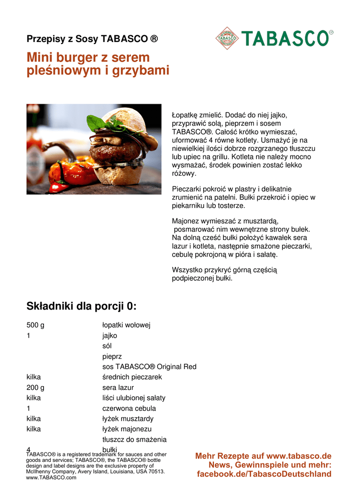 Przepisy z Sosy TABASCO ® Mini burger z serem pleśniowym i grzybami Łopatkę zmielić. Dodać do niej jajko, przyprawić solą, pieprzem i sosem TABASCO®. Całość krótko wymieszać, uformować 4 równe kotlety. Usmażyć je na niewielkiej ilości dobrze rozgrzanego tłuszczu lub upiec na grillu. Kotleta nie należy mocno wysmażać, środek powinien zostać lekko różowy. Pieczarki pokroić w plastry i delikatnie zrumienić na patelni. Bułki przekroić i opiec w piekarniku lub tosterze. Majonez wymieszać z musztardą, posmarować nim wewnętrzne strony bułek. Na dolną cześć bułki położyć kawałek sera lazur i kotleta, następnie smażone pieczarki, cebulę pokrojoną w pióra i sałatę. Wszystko przykryć górną częścią podpieczonej bułki. Składniki dla porcji 0: 500 g 1 kilka 200 g kilka 1 kilka kilka 4 łopatki wołowej jajko sól pieprz sos TABASCO® Original Red średnich pieczarek sera lazur liści ulubionej sałaty czerwona cebula łyżek musztardy łyżek majonezu tłuszcz do smażenia bułki TABASCO® is a registered trademark for sauces and other goods and services; TABASCO®, the TABASCO® bottle design and label designs are the exclusive property of McIlhenny Company, Avery Island, Louisiana, USA 70513. www.TABASCO.com Mehr Rezepte auf www.tabasco.de News, Gewinnspiele und mehr: facebook.de/TabascoDeutschland