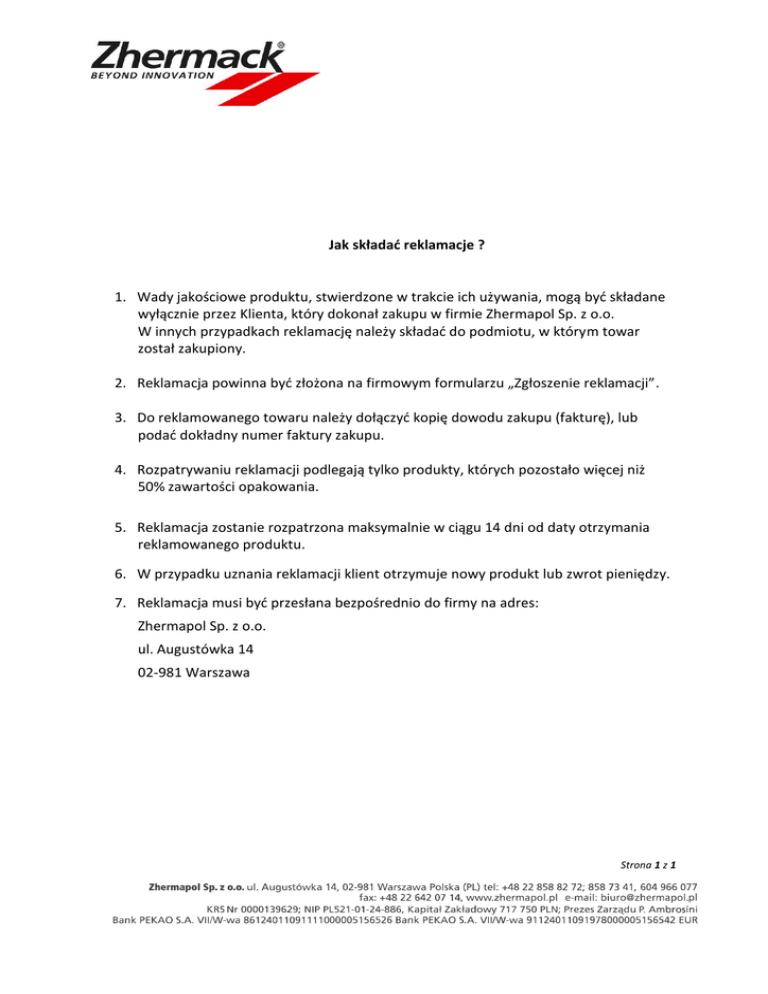 Jak składać reklamacje ? 1. Wady jakościowe produktu, stwierdzone w trakcie ich używania, mogą być składane wyłącznie przez Klienta, który dokonał zakupu w firmie Zhermapol Sp. z o.o. W innych przypadkach reklamację należy składać do podmiotu, w którym towar został zakupiony. 2. Reklamacja powinna być złożona na firmowym formularzu „Zgłoszenie reklamacji”. 3. Do reklamowanego towaru należy dołączyć kopię dowodu zakupu (fakturę), lub podać dokładny numer faktury zakupu. 4. Rozpatrywaniu reklamacji podlegają tylko produkty, których pozostało więcej niż 50% zawartości opakowania. 5. Reklamacja zostanie rozpatrzona maksymalnie w ciągu 14 dni od daty otrzymania reklamowanego produktu. 6. W przypadku uznania reklamacji klient otrzymuje nowy produkt lub zwrot pieniędzy. 7. Reklamacja musi być przesłana bezpośrednio do firmy na adres: Zhermapol Sp. z o.o. ul. Augustówka 14 02-981 Warszawa Strona 1 z 1