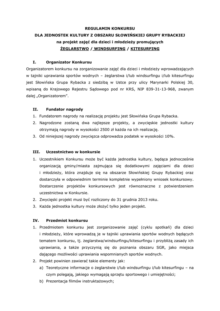 REGULAMIN KONKURSU DLA JEDNOSTEK KULTURY Z OBSZARU SŁOWIŃSKIEJ GRUPY RYBACKIEJ na projekt zajęć dla dzieci i młodzieży promujących ŻEGLARSTWO / WINDSURFING / KITESURFING I. Organizator Konkursu Organizatorem konkursu na zorganizowanie zajęć dla dzieci i młodzieży wprowadzających w tajniki uprawiania sportów wodnych – żeglarstwa i/lub windsurfingu i/lub kitesurfingu jest Słowińska Grupa Rybacka z siedzibą w Ustce przy ulicy Marynarki Polskiej 30, wpisaną do Krajowego Rejestru Sądowego pod nr KRS, NIP 839-31-13-968, zwanym dalej „Organizatorem”. II. Fundator nagrody 1. Fundatorem nagrody na realizację projektu jest Słowińska Grupa Rybacka. 2. Nagrodzone zostaną dwa najlepsze projekty, a zwycięskie jednostki kultury otrzymają nagrody w wysokości 2500 zł każda na ich realizację. 3. Od niniejszej nagrody zwycięzca odprowadza podatek w wysokości 10%. III. Uczestnictwo w konkursie 1. Uczestnikiem Konkursu może być każda jednostka kultury, będąca jednocześnie organizacją gminy/miasta zajmująca się dodatkowymi zajęciami dla dzieci i młodzieży, która znajduje się na obszarze Słowińskiej Grupy Rybackiej oraz dostarczyła w odpowiednim terminie kompletnie wypełniony wniosek konkursowy. Dostarczenie projektów konkursowych jest równoznaczne z potwierdzeniem uczestnictwa w Konkursie. 2. Zwycięski projekt musi być rozliczony do 31 grudnia 2013 roku. 3. Każda jednostka kultury może złożyć tylko jeden projekt. IV. Przedmiot konkursu 1. Przedmiotem konkursu jest zorganizowanie zajęć (cyklu spotkań) dla dzieci i młodzieży, które wprowadzą je w tajniki uprawiania sportów wodnych będących tematem konkursu, tj. żeglarstwa/windsurfingu/kitesurfingu i przybliżą zasady ich uprawiania, a także przyczynią się do poznania obszaru SGR, jako miejsca dającego możliwości uprawiania wspomnianych sportów wodnych. 2. Projekt powinien zawierać takie elementy jak: a) Teoretyczne informacje o żeglarstwie i/lub windsurfingu i/lub kitesurfingu – na czym polegają, jakiego wymagają sprzętu sportowego i umiejętności; b) Prezentacja filmów instruktażowych; c) Spotkania z osobami aktywnie uprawiającymi wyżej wymienione sporty; d) Zapoznanie uczestników zajęć z warunkami przyrodniczymi obszaru SGR umożliwiającymi uprawianie żeglarstwa / windsurfingu / kitesurfingu (na przykładzie konkretnych miejsc, tj. akwenów wodnych); e) Wycieczki fakultatywne. 3. Wprowadzenie do projektu któregokolwiek bądź wszystkich wymienionych wyżej elementów skutkowało będzie otrzymaniem dodatkowo po 1 pkt. 4. Wpisanie w projekt praktycznych zajęć z zakresu żeglarstwa i/lub windsurfingu i/lub kitesurfingu zostanie uhonorowane dodatkowymi 10 pkt. V. Cele konkursu 1. Promocja aktywności ruchowej dzieci i młodzieży z obszaru Słowińskiej Grupy Rybackiej. 2. Edukacja w zakresie tematyki sportów wodnych, tj. żeglarstwa / windsurfingu / kitesurfingu. 3. Promocja obszaru Słowińskiej Grupy Rybackiej jako regionu doskonałego do uprawiania sportów wodnych. VI. Wymogi formalne 1. Projekt musi zawierać pełne dane jednostki: nazwę, dokładny adres, imię i nazwisko osoby odpowiedzialnej za organizację projektu. 2. Projekt musi mieć dołączoną zgodę na jego wykorzystanie do celów marketingowych przez Organizatora Konkursu, a w szczególności publikacji na stronie www.sgr.org.pl, a także wszelkich materiałach tworzonych w ramach funkcjonowania Słowińskiej Grupy Rybackiej. 3. Zgłoszenia niekompletne, nie będą brały udziału w Konkursie. VII. Terminy konkursu 1. Projekty konkursowe należy przesyłać/dostarczać do biura SGR w oryginale od 06 maja 2013 roku do dnia 14 czerwca 2013 roku. 2. Komisja Konkursowa zbierze się w tygodniu pomiędzy 17-21 czerwca 2013 roku w celu oceny projektów. 3. Kryteria oceny projektów konkursowych: a) zgodność treści projektu z założeniami Konkursu (wpisywanie się w cele i spełnienie kryteriów wynikających z przedmiotu konkursu), b) pomysł na ujęcie tematu Konkursu (oryginalność, innowacyjność, atrakcyjność); c) forma realizacji projektu (w tym stopień zaangażowania dzieci i młodzieży); d) Wpływ na: - propagowanie wśród dzieci i młodzieży aktywnych form spędzania czasu wolnego, - podniesienie poziomu aktywności ruchowej, - podniesienie poziomu wiedzy na temat żeglarstwa / windsurfingu / kitesurfingu. 4. Wyniki Konkursu opublikowane zostaną na stronie www.sgr.org.pl do dnia 25 czerwca 2013 roku. 5. Z wykonawcą zwycięskiego projektu zostanie podpisana umowa o współpracy określająca prawa i obowiązki obydwu stron. VIII. Nadsyłanie prac konkursowych 1. Projekty konkursowe należy przesłać/dostarczyć w oryginale na adres Biura Słowińskiej Grupy Rybackiej: ul. Marynarki Polskiej 30, 76-270 Ustka z dopiskiem: Promujemy żeglarstwo/windsurfing/kitesurfing! 2. Decyduje data wpływu projektu do biura SGR. IX. Postanowienia końcowe 1. Regulamin niniejszego Konkursu dostępny jest na stronie internetowej www.sgr.org.pl oraz w siedzibie Słowińskiej Grupy Rybackiej. 2. Organizator może w każdym czasie dokonać zmiany Regulaminu, jak również zastrzega sobie odwołanie lub nierozstrzygnięcie Konkursu. 3. Organizator nie ponosi odpowiedzialności za działania operatora pocztowego ani firmy kurierskiej, z której usług w trakcie Konkursu mogą korzystać uczestnicy Konkursu lub Organizator. 4. Organizator nie ponosi odpowiedzialności za działania dostawców usług poczty elektronicznej, z których korzystają uczestnicy Konkursu. Załączniki: 1. Formularz wniosku konkursowego.