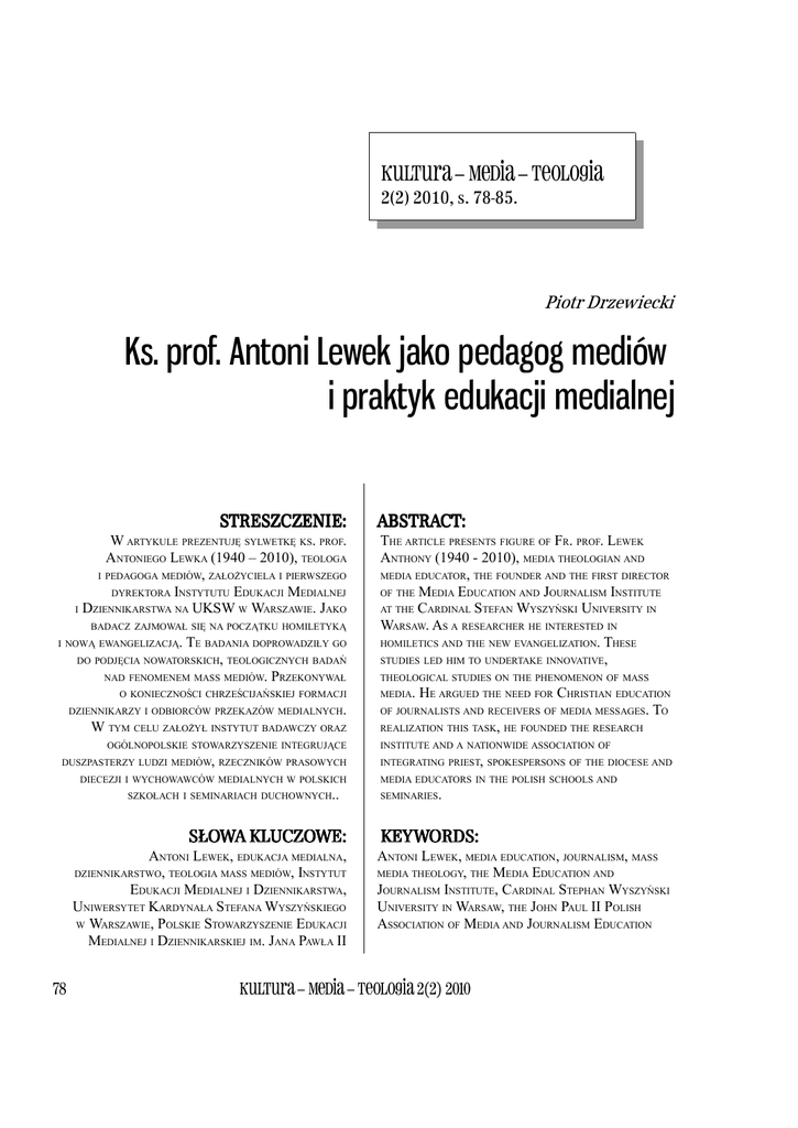 Kultura – Media – Teologia 2(2) 2010, s. 78-85. Piotr Drzewiecki Ks. prof. Antoni Lewek jako pedagog mediów i praktyk edukacji medialnej STRESZCZENIE: W ARTYKULE PREZENTUJĘ SYLWETKĘ KS. PROF. ANTONIEGO LEWKA (1940 – 2010), TEOLOGA I PEDAGOGA MEDIÓW, ZAŁOśYCIELA I PIERWSZEGO DYREKTORA INSTYTUTU EDUKACJI MEDIALNEJ I DZIENNIKARSTWA NA UKSW W WARSZAWIE. JAKO BADACZ ZAJMOWAŁ SIĘ NA POCZĄTKU HOMILETYKĄ I NOWĄ EWANGELIZACJĄ. TE BADANIA DOPROWADZIŁY GO DO PODJĘCIA NOWATORSKICH, TEOLOGICZNYCH BADAŃ NAD FENOMENEM MASS MEDIÓW. PRZEKONYWAŁ O KONIECZNOŚCI CHRZEŚCIJAŃSKIEJ FORMACJI DZIENNIKARZY I ODBIORCÓW PRZEKAZÓW MEDIALNYCH. W TYM CELU ZAŁOśYŁ INSTYTUT BADAWCZY ORAZ OGÓLNOPOLSKIE STOWARZYSZENIE INTEGRUJĄCE DUSZPASTERZY LUDZI MEDIÓW, RZECZNIKÓW PRASOWYCH DIECEZJI I WYCHOWAWCÓW MEDIALNYCH W POLSKICH SZKOŁACH I SEMINARIACH DUCHOWNYCH.. SŁOWA KLUCZOWE: ANTONI LEWEK, EDUKACJA MEDIALNA, DZIENNIKARSTWO, TEOLOGIA MASS MEDIÓW, INSTYTUT EDUKACJI MEDIALNEJ I DZIENNIKARSTWA, UNIWERSYTET KARDYNAŁA STEFANA WYSZYŃSKIEGO W WARSZAWIE, POLSKIE STOWARZYSZENIE EDUKACJI MEDIALNEJ I DZIENNIKARSKIEJ IM. JANA PAWŁA II 78 ABSTRACT: THE ARTICLE PRESENTS FIGURE OF FR. PROF. LEWEK ANTHONY (1940 - 2010), MEDIA THEOLOGIAN AND MEDIA EDUCATOR, THE FOUNDER AND THE FIRST DIRECTOR OF THE MEDIA EDUCATION AND JOURNALISM INSTITUTE AT THE CARDINAL STEFAN WYSZYŃSKI UNIVERSITY IN WARSAW. AS A RESEARCHER HE INTERESTED IN HOMILETICS AND THE NEW EVANGELIZATION. THESE STUDIES LED HIM TO UNDERTAKE INNOVATIVE, THEOLOGICAL STUDIES ON THE PHENOMENON OF MASS MEDIA. HE ARGUED THE NEED FOR CHRISTIAN EDUCATION TO REALIZATION THIS TASK, HE FOUNDED THE RESEARCH OF JOURNALISTS AND RECEIVERS OF MEDIA MESSAGES. INSTITUTE AND A NATIONWIDE ASSOCIATION OF INTEGRATING PRIEST, SPOKESPERSONS OF THE DIOCESE AND MEDIA EDUCATORS IN THE POLISH SCHOOLS AND SEMINARIES. KEYWORDS: ANTONI LEWEK, MEDIA EDUCATION, JOURNALISM, MASS MEDIA THEOLOGY, THE MEDIA EDUCATION AND JOURNALISM INSTITUTE, CARDINAL STEPHAN WYSZYŃSKI UNIVERSITY IN WARSAW, THE JOHN PAUL II POLISH ASSOCIATION OF MEDIA AND JOURNALISM EDUCATION Kultura – Media – Teologia 2(2) 2010 P. Drzewiecki, Ks. prof. Antoni Lewek jako pedagog mediów... K s. prof. Antoni Lewek odszedł do „domu Ojca” 18 lipca 2010 roku. Był załoŜycielem (w 2002 roku) i pierwszym dyrektorem Instytutu Edukacji Medialnej i Dziennikarstwa (IEMiD) Uniwersytetu Kardynała Stefana Wyszyńskiego (UKSW) w Warszawie, a wcześniej (od 1992 roku) kierownikiem Sekcji Teologii Środków Społecznego Przekazu. PrzeŜył w kapłaństwie 47 lat. Od 1973 roku związany z Akademią Teologii Katolickiej (ATK), potem z UKSW, gdzie wykładał aŜ do śmierci. Wypromował kilkuset magistrantów, kilkoro doktorantów (w tym piszącego te słowa). Jego marzeniem było kształcenie przyszłych dziennikarzy w duchu chrześcijańskim oraz promocja chrześcijańskiej edukacji medialnej w seminariach duchowych, szkolnictwie powszechnym i na wyŜszych uczelniach. W artykule chciałbym nakreślić sylwetkę ks. prof. Antoniego Lewka jako pedagoga mediów i animatora edukacji medialnej. To jedno z najwaŜniejszych zagadnień, które uprawiał jako naukowiec (w teorii) i jako nauczyciel akademicki, wychowawca i duszpasterz ludzi mediów (w praktyce). Wcześniej zajmował się homiletyką i teologią nowej ewangelizacji. Przez trzy kadencje przewodniczył Sekcji Homiletów Polskich przy Komisji Episkopatu Polski ds. Nauki Katolickiej. Był promotorem kultu bł. ks. Jerzego Popiełuszki, swojego przyjaciela, którego poznał jako rezydent w parafii św. Stanisława Kostki na warszawskim śoliborzu, gdzie mieszkał aŜ do śmierci. W latach 80. wygłosił tysiące kazań o tematyce patriotycznej, podróŜując po parafiach całej Polski1. Doświadczenia homiletyczne (równieŜ teoretyczne i praktyczne) doprowadziły go do przekonania o konieczności rozwoju nowej dyscypliny teologicznej – teologii środków przekazu – i koniecznej formacji środowiska ludzi mediów i odbiorców przekazów medialnych2. W kierunku teologii środków społecznego przekazu i katolickiej pedagogiki mediów WaŜnym doświadczeniem jego duchowego i naukowego rozwoju był Sobór Watykański II (1962–65). Okres soborowy wiąŜe się przecieŜ z datą jego święceń kapłańskich w 1963 roku. Podejmując studia doktoranckie, a potem prowadząc badania habilitacyjne i profesorskie, zajmował się recepcją nauczania Vaticanum Secundum, szczególnie zagadnieniami odnowy kaznodziejstwa, nową ewangelizacją i kerygmatyczną funkcją Kościoła3. W trakcie swoich studiów w Niemczech (Institut főr Katechetik und Homiletik w Monachium, w latach 1971–1973) poznał wielu teologów epoki Soboru, m.in. Karla Rahnera i Josepha Ratzingera, obecnego PapieŜa. Wczesne zainteresowania ks. prof. Antoniego Lewka i podejmowane zagadnienia badawcze prowadziły ku odkrywaniu i adaptowaniu nowych narzędzi i metod dla ewangelizacji. 1 2 3 Zob. A. Lewek, Bóg - człowiek – Ojczyzna. Homilie wygłoszone w kościele św. Stanisława Kostki w Warszawie w związku z zamordowaniem ks. Jerzego Popiełuszki, t. I – VI, Warszawa: Kuria Metropolitalna Warszawska 1986 – 1990. Zob. teŜ sylwetkę śp. ks. prof. A. Lewka na stronie internetowej parafii św. Stanisława Kostki na warszawskim śoliborzu, http://www.popieluszko.net.pl/parafia/xlewek.php (dostęp 27.07.2010). Por. A. Lewek, Współczesna odnowa kaznodziejstwa, Warszawa: ATK 1980; Funkcja kerygmatyczna Kościoła w świetle Vaticanum II. Istota i zadania, t. I – II, Warszawa: ATK 1984; Nowa ewangelizacja w duchu Soboru Watykańskiego II, t. I – II, Katowice: Księgarnia św. Jacka 1995. Kultura – Media – Teologia 2(2) 2010 79 KS. PROF. ANTONI LEWEK (1940-2010) – śYCIE I DZIEŁO Za takie narzędzie Ksiądz Profesor uznawał mass media, poszukując w dziennikarstwie nowej przestrzeni i metody głoszenia Chrystusa. To równieŜ wypełnienie zaleceń Soboru, którego Ojcowie stwierdzają w „