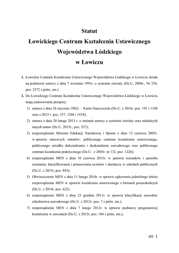 Statut Łowickiego Centrum Kształcenia Ustawicznego Województwa Łódzkiego w Łowiczu 1. Łowickie Centrum Kształcenia Ustawicznego Województwa Łódzkiego w Łowiczu działa na podstawie ustawy z dnia 7 września 1991r. o systemie oświaty (Dz.U. 2004r., Nr 256, poz. 2572 z późn. zm.) 2. Do Łowickiego Centrum Kształcenia Ustawicznego Województwa Łódzkiego w Łowiczu mają zastosowanie przepisy: 1) ustawa z dnia 26 stycznia 1982r. – Karta Nauczyciela (Dz.U. z 2014r. poz. 191 i 1198 oraz z 2015 r. poz. 357, 1268 i 1418); 2) ustawa z dnia 20 lutego 2015 r. o zmianie ustawy o systemie oświaty oraz niektórych innych ustaw (Dz.U. 2015r., poz. 357); 3) rozporządzenie Ministra Edukacji Narodowej i Sportu z dnia 13 czerwca 2003r. w sprawie ramowych statutów: publicznego centrum kształcenia ustawicznego, publicznego ośrodka dokształcania i doskonalenia zawodowego oraz publicznego centrum kształcenia praktycznego (Dz.U. z 2003r. nr 132, poz. 1226); 4) rozporządzenie MEN z dnia 10 czerwca 2015r. w sprawie warunków i sposobu oceniania, klasyfikowania i promowania uczniów i słuchaczy w szkołach publicznych (Dz.U. z 2015r, poz. 843); 5) Obwieszczenie MEN z dnia 11 lutego 2014r. w sprawie ogłoszenia jednolitego tekstu rozporządzenie MEN w sprawie kształcenia ustawicznego z formach pozaszkolnych (Dz.U. z 2014r. poz. 622); 6) rozporządzenie MEN z dnia 23 grudnia 2011r. w sprawie klasyfikacji zawodów szkolnictwa zawodowego (Dz.U. z 2012r. poz. 7 z późn. zm.); 7) rozporządzenie MEN z dnia 7 lutego 2012r. w sprawie podstawy programowej kształcenia w zawodach (Dz.U. z 2012r. poz. 184 z późn. zm.); str. 1 8) rozporządzenie MEN z dnia 29 sierpnia 2014r. w sprawie sposobu prowadzenia przez publiczne przedszkola, szkoły i placówki dokumentacji przebiegu nauczania, działalności wychowawczej i opiekuńczej oraz rodzajów tej dokumentacji (Dz.U. z 2014r. poz. 1170 z późn. zm.); 9) Obwieszczenie Marszałka Sejmu Rzeczypospolitej Polskiej z dnia 21 czerwca 2013 r. w sprawie ogłoszenia jednolitego tekstu ustawy o finansach publicznych (Dz.U. z 2013r. poz. 885). 3. Ilekroć w statucie jest mowa bez bliższego określenia o: 1) centrum – należy przez to rozumieć Łowickie Centrum Kształcenia Ustawicznego Województwa Łódzkiego w Łowiczu; 2) radzie centrum – należy rozumieć wszystkich pracowników pedagogicznych Centrum; 3) samorządzie słuchaczy – należy rozumieć słuchaczy szkół wchodzących w skład Centrum; 4) słuchaczu – należy przez to rozumieć słuchacza Centrum; 5) szkole – należy rozumieć każdą jednostkę wchodzącą w skład Centrum. str. 2 Rozdział 1. Postanowienia ogólne § 1. 1. Nazwa Centrum: Łowickie Centrum Kształcenia Ustawicznego Województwa Łódzkiego w Łowiczu. 2. Siedziba Centrum mieści się w Łowiczu przy ul. Ułańskiej 2. 3. Zajęcia edukacyjne odbywają się w siedzibie Centrum. Zajęcia mogą być prowadzone na terenie innych placówek oświatowych Samorządu Województwa Łódzkiego. 4. Organem prowadzącym Centrum jest Samorząd Województwa Łódzkiego. 5. Organem sprawującym nadzór pedagogiczny jest Łódzki Kurator Oświaty. 6. Nazwa Centrum używana jest w pełnym brzmieniu. Na pieczęciach może być używany skrót nazwy w brzmieniu ŁCKU WŁ w Łowiczu. § 2. 1. W skład Centrum wchodzą następujące szkoły: 1) Szkoła Policealna Samorządu Województwa Łódzkiego im M. Kopernika w Łowiczu; 2) Łowicka Szkoła Policealna Województwa Łódzkiego dla Dorosłych w Łowiczu. 2. Dopuszcza się możliwość tworzenia w ramach Centrum nowych jednostek organizacyjnych, jeśli potrzeba taka wynika z prowadzonej działalności. § 3. 1. Centrum może organizować filie na terenie województwa łódzkiego. 2. W przypadku utworzenia filii, jej pracą kieruje kierownik filii. 3. Nazwa filii Centrum zawiera nazwę Centrum oraz określenie ”Filia” wraz z miejscowością, w której się znajduje. § 4. 1. Szkoła Policealna Samorządu Województwa Łódzkiego im. M. Kopernika w Łowiczu wchodząca w skład Centrum kształci w formie stacjonarnej zgodnie z klasyfikacją szkolnictwa zawodowego w następujących zawodach wg obszarów kształcenia: 1) medyczno-społeczny: a) asystent osoby niepełnosprawnej, b) asystentka stomatologiczna, c) opiekun medyczny, d) opiekun osoby starszej, e) opiekun w domu pomocy społecznej, f) opiekunka środowiskowa, str. 3 g) technik bezpieczeństwa i higieny pracy, h) technik farmaceutyczny, i) technik masażysta, j) technik ochrony fizycznej osób i mienia; k) terapeuta zajęciowy, 2) administracyjno-usługowy: a) technik administracji, b) technik usług kosmetycznych. 2. Łowicka Szkoła Policealna Województwa Łódzkiego dla Dorosłych w Łowiczu wchodząca w skład Centrum kształci słuchaczy w formie stacjonarnej i zaocznej zgodnie z klasyfikacją szkolnictwa zawodowego w następujących zawodach wg obszarów kształcenia: 1) medyczno-społeczny: a) asystent osoby niepełnosprawnej, b) asystentka stomatologiczna, c) higienistka stomatologiczna, d) opiekun medyczny, e) opiekun osoby starszej, f) opiekun w domu pomocy społecznej, g) opiekunka środowiskowa, h) technik bezpieczeństwa i higieny pracy, i) technik masażysta, j) technik ochrony fizycznej osób i mienia; k) technik sterylizacji medycznej, l) terapeuta zajęciowy; 2) elektryczno-elektroniczny: a) technik informatyk; 3) budowlany: a) technik geodeta; 4) administracyjno-usługowy: a) technik administracji, b) technik rachunkowości, c) technik usług kosmetycznych. str. 4 3. W Centrum prowadzi się kształcenie ustawiczne w formach pozaszkolnych określonych przez ministra właściwego ds. oświaty i wychowania. 4. Dla wszystkich jednostek Centrum prowadzi wspólną obsługę administracyjnofinansową i kadrową. § 5. 1. Czas trwania cyklu nauczania w poszczególnych jednostkach Centrum, a także kształcenia w formie kursów jest zgodny z przepisami w sprawie ramowych planów nauczania, określonymi przez min