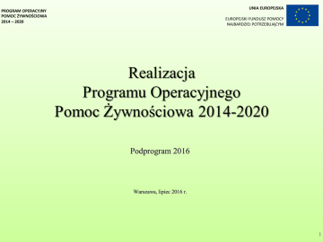 UNIA EUROPEJSKA PROGRAM OPERACYJNY POMOC ŻYWNOŚCIOWA 2014 – 2020 EUROPEJSKI FUNDUSZ POMOCY NAJBARDZIEJ POTRZEBUJĄCYM Podprogram 2016 Warszawa, lipiec 2016 r. 1 UNIA EUROPEJSKA PROGRAM OPERACYJNY POMOC ŻYWNOŚCIOWA 2014 – 2020 EUROPEJSKI FUNDUSZ POMOCY NAJBARDZIEJ POTRZEBUJĄCYM Przewidywana liczba odbiorców końcowych Planowana liczba odbiorców - 1 330 000 osób, w tym: FPBŻ - 719 000 osób (54,1 %) PKPS - 283 000 osób (21,3 %) CARITAS - 232 000 osób (17,4 %) PCK - 96 000 osób (7,2 %) UNIA EUROPEJSKA PROGRAM OPERACYJNY POMOC ŻYWNOŚCIOWA 2014 – 2020 EUROPEJSKI FUNDUSZ POMOCY NAJBARDZIEJ POTRZEBUJĄCYM Ilości artykułów spożywczych w Podprogramie 2016 Ogółem: 64 637 t 3 PROGRAM OPERACYJNY POMOC ŻYWNOŚCIOWA 2014 – 2020 UNIA EUROPEJSKA EUROPEJSKI FUNDUSZ POMOCY NAJBARDZIEJ POTRZEBUJĄCYM DOKUMENTY 4 PROGRAM OPERACYJNY POMOC ŻYWNOŚCIOWA 2014 – 2020 UNIA EUROPEJSKA EUROPEJSKI FUNDUSZ POMOCY NAJBARDZIEJ POTRZEBUJĄCYM Załącznik nr 5. 5 PROGRAM OPERACYJNY POMOC ŻYWNOŚCIOWA 2014 – 2020 UNIA EUROPEJSKA EUROPEJSKI FUNDUSZ POMOCY NAJBARDZIEJ POTRZEBUJĄCYM 6 PROGRAM OPERACYJNY POMOC ŻYWNOŚCIOWA 2014 – 2020 UNIA EUROPEJSKA EUROPEJSKI FUNDUSZ POMOCY NAJBARDZIEJ POTRZEBUJĄCYM Załącznik nr 6. 7 PROGRAM OPERACYJNY POMOC ŻYWNOŚCIOWA 2014 – 2020 UNIA EUROPEJSKA EUROPEJSKI FUNDUSZ POMOCY NAJBARDZIEJ POTRZEBUJĄCYM 8 PROGRAM OPERACYJNY POMOC ŻYWNOŚCIOWA 2014 – 2020 UNIA EUROPEJSKA EUROPEJSKI FUNDUSZ POMOCY NAJBARDZIEJ POTRZEBUJĄCYM Załącznik nr 7. 9 PROGRAM OPERACYJNY POMOC ŻYWNOŚCIOWA 2014 – 2020 UNIA EUROPEJSKA EUROPEJSKI FUNDUSZ POMOCY NAJBARDZIEJ POTRZEBUJĄCYM 10 PROGRAM OPERACYJNY POMOC ŻYWNOŚCIOWA 2014 – 2020 UNIA EUROPEJSKA EUROPEJSKI FUNDUSZ POMOCY NAJBARDZIEJ POTRZEBUJĄCYM Załącznik nr 1. 11 PROGRAM OPERACYJNY POMOC ŻYWNOŚCIOWA 2014 – 2020 UNIA EUROPEJSKA EUROPEJSKI FUNDUSZ POMOCY NAJBARDZIEJ POTRZEBUJĄCYM Załącznik nr 2. 12 PROGRAM OPERACYJNY POMOC ŻYWNOŚCIOWA 2014 – 2020 UNIA EUROPEJSKA EUROPEJSKI FUNDUSZ POMOCY NAJBARDZIEJ POTRZEBUJĄCYM Załącznik nr 4. 13 PROGRAM OPERACYJNY POMOC ŻYWNOŚCIOWA 2014 – 2020 UNIA EUROPEJSKA EUROPEJSKI FUNDUSZ POMOCY NAJBARDZIEJ POTRZEBUJĄCYM 14 UWAGA!!! W kolumnie oznaczenie partii magazynowej: wpisujemy numer partii magazynowej /zawsze będzie jeden/ a nie numer partii produkcyjnej /tych może być wiele/!!! PROGRAM OPERACYJNY POMOC ŻYWNOŚCIOWA 2014 – 2020 UNIA EUROPEJSKA EUROPEJSKI FUNDUSZ POMOCY NAJBARDZIEJ POTRZEBUJĄCYM Załącznik nr 8. 16 PROGRAM OPERACYJNY POMOC ŻYWNOŚCIOWA 2014 – 2020 UNIA EUROPEJSKA EUROPEJSKI FUNDUSZ POMOCY NAJBARDZIEJ POTRZEBUJĄCYM Diecezja Legnicka 17 PROGRAM OPERACYJNY POMOC ŻYWNOŚCIOWA 2014 – 2020 » magazyny: » Jelenia Góra - 2595 osób BOGATYNIA, św. Marii Magdaleny BOGATYNIA, św. Piotra i Pawła DZIAŁOSZYN, św. Bartłomieja DZIWISZÓW, św. Wawrzyńca GRYFÓW ŚLĄSKI, św. Jadwigi HENRYKÓW LUBAŃSKI, św. Mikołaja KRZESZÓW, Wniebowzięcia NMP LUBAŃ, Najśw. Serca PJ i św. Jakuba LUBAŃ, Trójcy Świętej OLSZYNA, św. Józefa Obl. ŚWIERADÓW ZDRÓJ, Podwyż. Krzyża Św. WĘGLINIEC, Najświętszego Serca PJ WLEŃ, św. Mikołaja WOJANÓW, Wniebowzięcia NMP UNIA EUROPEJSKA EUROPEJSKI FUNDUSZ POMOCY NAJBARDZIEJ POTRZEBUJĄCYM PROGRAM OPERACYJNY POMOC ŻYWNOŚCIOWA 2014 – 2020 » Legnica - 4173 osób UNIA EUROPEJSKA EUROPEJSKI FUNDUSZ POMOCY NAJBARDZIEJ POTRZEBUJĄCYM BOLESŁAWIEC, Najśw. Ciała i Krwi Chrystusa BOLESŁAWIEC, Wniebowzięcia NMP CHOCIANÓW, Wniebowzięcia NMP CHOJNÓW, Niepokalanego Poczęcia NMP CZERWONA WODA, Wniebowzięcia NMP LEGNICA, MB Częstochowskiej LEGNICA, Najświętszego Serca PJ LEGNICA, św. Jacka LEGNICA, św. Jadwigi LEGNICA, św. Jana Chrzciciela LEGNICA, św. Piotra i Pawła LEGNICA, Trójcy Świętej LWÓWEK ŚL., Wniebowzięcia NMP PRUSICE, św. Jadwigi ŚWIERZAWA, Wniebowzięcia NMP TRZEBIEŃ, Świętego Krzyża WIELOWIEŚ, Narodzenia NMP ZŁOTORYJA, Narodzenia NMP ZŁOTORYJA, św. Jadwigi ZŁOTORYJA, św. Józefa Robotnika TWARDOCICE, św. ap. Piotra i Pawła CHOJNÓW, Stowarzyszenie na Rzecz Osób Niepełnosprawnych i Potrzebujących „Dajmy Szansę” 19 UNIA EUROPEJSKA PROGRAM OPERACYJNY POMOC ŻYWNOŚCIOWA 2014 – 2020 EUROPEJSKI FUNDUSZ POMOCY NAJBARDZIEJ POTRZEBUJĄCYM Sprawozdawczość w Podprogramie 2016 Sprawozdawczość w obszarze dystrybucji Rodzaj sprawozdania Termin na złożenie sprawozdania wynikający z Wytycznych IZ Sprawozdanie z dystrybucji za okres sierpień 2016 r. – październik 2016 r. 08.11.2016 r. „Sprawozdanie z dystrybucji artykułów spożywczych” za okres sierpień 2016 r. – grudzień 2016 r. (zgodnie z wzorem wskazanym w Tabeli I i II Załącznika nr 10 do Wytycznych) 09.01.2017 r. Sprawozdanie z dystrybucji za okres styczeń 2017 r. – marzec 2017 r. 10.04.2017 r. „Sprawozdanie końcowe z dystrybucji artykułów spożywczych” 07.07.2017 r. 20 UNIA EUROPEJSKA PROGRAM OPERACYJNY POMOC ŻYWNOŚCIOWA 2014 – 2020 EUROPEJSKI FUNDUSZ POMOCY NAJBARDZIEJ POTRZEBUJĄCYM Sprawozdawczość w Podprogramie 2016 Sprawozdawczość w obszarze środków towarzyszących Rodzaj sprawozdania Termin na złożenie sprawozdania wynikający z Wytycznych IZ „Sprawozdanie z przebiegu realizacji działań w ramach środków towarzyszących” za okres sierpień 2016 r. – grudzień 2016 r. 15.01.2017 r. „Sprawozdanie końcowe z przebiegu działań w ramach środków towarzyszących” 15.07.2017 r. 21 PROGRAM OPERACYJNY POMOC ŻYWNOŚCIOWA 2014 – 2020 UNIA EUROPEJSKA EUROPEJSKI FUNDUSZ POMOCY NAJBARDZIEJ POTRZEBUJĄCYM Zasady dystrybucji (OPR i OPL) Żywność dystrybuowana przez w ramach realizacji PO PŻ wydawana jest nieodpłatnie. Organizacje partnerskie wydająca żywność nie mogą pobierać od odbiorców końcowych jakichkolwiek opłat za wydawaną żywność ani uzależniać wydania żywności od jakichkolwiek świadczeń na rzecz OPR/OPL, czyli Caritas lub parafii. 22 PROGRAM OPERACYJNY POMOC ŻYWNOŚCIOWA 2014 – 2020 UNIA EUROPEJSKA EUROPEJSKI FU