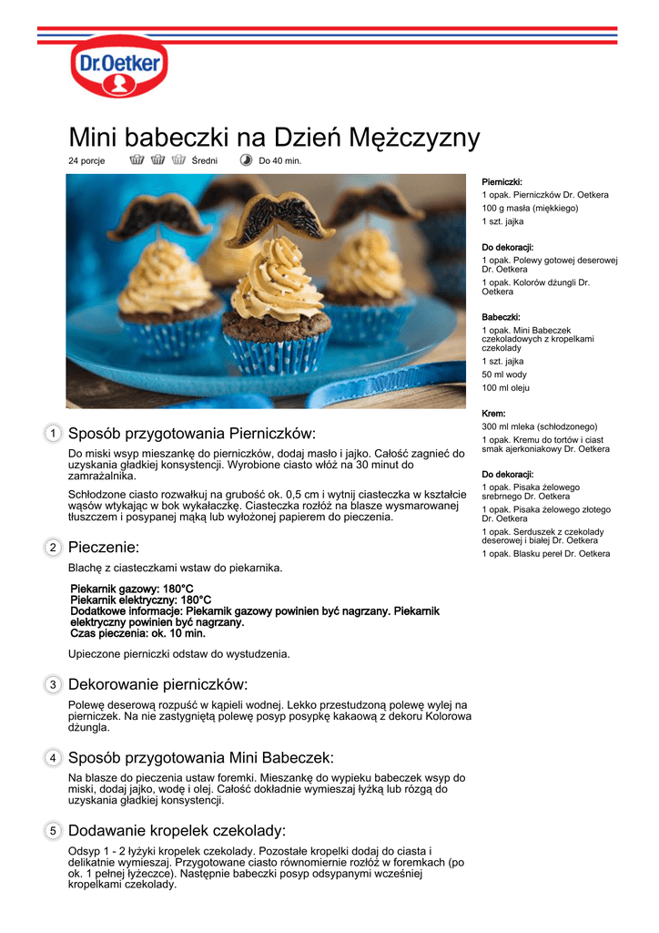 Mini babeczki na Dzień Mężczyzny 24 porcje Średni Do 40 min. Pierniczki: 1 opak. Pierniczków Dr. Oetkera 100 g masła (miękkiego) 1 szt. jajka Do dekoracji: 1 opak. Polewy gotowej deserowej Dr. Oetkera 1 opak. Kolorów dżungli Dr. Oetkera Babeczki: 1 opak. Mini Babeczek czekoladowych z kropelkami czekolady 1 szt. jajka 50 ml wody 100 ml oleju 1 Sposób przygotowania Pierniczków: Do miski wsyp mieszankę do pierniczków, dodaj masło i jajko. Całość zagnieć do uzyskania gładkiej konsystencji. Wyrobione ciasto włóż na 30 minut do zamrażalnika. Schłodzone ciasto rozwałkuj na grubość ok. 0,5 cm i wytnij ciasteczka w kształcie wąsów wtykając w bok wykałaczkę. Ciasteczka rozłóż na blasze wysmarowanej tłuszczem i posypanej mąką lub wyłożonej papierem do pieczenia. 2 Pieczenie: Blachę z ciasteczkami wstaw do piekarnika. Piekarnik gazowy: 180°C Piekarnik elektryczny: 180°C Dodatkowe informacje: Piekarnik gazowy powinien być nagrzany. Piekarnik elektryczny powinien być nagrzany. Czas pieczenia: ok. 10 min. Upieczone pierniczki odstaw do wystudzenia. 3 Dekorowanie pierniczków: Polewę deserową rozpuść w kąpieli wodnej. Lekko przestudzoną polewę wylej na pierniczek. Na nie zastygniętą polewę posyp posypkę kakaową z dekoru Kolorowa dżungla. 4 Sposób przygotowania Mini Babeczek: Na blasze do pieczenia ustaw foremki. Mieszankę do wypieku babeczek wsyp do miski, dodaj jajko, wodę i olej. Całość dokładnie wymieszaj łyżką lub rózgą do uzyskania gładkiej konsystencji. 5 Dodawanie kropelek czekolady: Odsyp 1 - 2 łyżyki kropelek czekolady. Pozostałe kropelki dodaj do ciasta i delikatnie wymieszaj. Przygotowane ciasto równomiernie rozłóż w foremkach (po ok. 1 pełnej łyżeczce). Następnie babeczki posyp odsypanymi wcześniej kropelkami czekolady. Krem: 300 ml mleka (schłodzonego) 1 opak. Kremu do tortów i ciast smak ajerkoniakowy Dr. Oetkera Do dekoracji: 1 opak. Pisaka żelowego srebrnego Dr. Oetkera 1 opak. Pisaka żelowego złotego Dr. Oetkera 1 opak. Serduszek z czekolady deserowej i białej Dr. Oetkera 1 opak. Blasku pereł Dr. Oetkera 6 Pieczenie: Blachę z foremkami wstaw do piekarnika. Piekarnik gazowy: 180°C Piekarnik elektryczny: 180°C Dodatkowe informacje: Piekarnik gazowy powinien być nagrzany. Piekarnik elektryczny powinien być nagrzany. Czas pieczenia: ok. 15 - 17 min. Babeczki można zacząć dekorować gdy całkowicie ostygną. 7 Krem: Mleko wlej do wysokiego naczynia, dodaj zawartość kremu i miksuj ok. 3 minuty. Gotowy krem odstaw do schłodzenia na 10 minut. Następnie krem przełóż do rękawa cukierniczego i nakładaj na babeczki. Aby uzyskać różne kształty do nakładania kremu można użyć różnych końcówek dekoracyjnych. 8 Dekorowanie: Na środku rozety przymocuj pierniczek na wykałaczce. Babeczki udekoruj perełkami z dekoru Kolorowa dżungla przed podaniem. © Dr. Oetker Polska Sp. z o.o. · 80-339 Gdańsk ul. Adm. Dickmana 14/15 · www.oetker.pl E-Mail: [email protected] · Tel. (Infolinia) 801 100 700 (koszt 1 impulsu połączenia lokalnego)