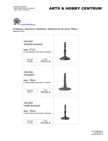ARTS & HOBBY CENTRUM Materiały witrażowe Dla profesjonalistów i hobbystów Szkło, sprzęt, narzędzia www.artshobby.pl Podstawy, elementy metalowe i elektryczne do lamp Tiffany kwiecień 2014 100-002 "średnia toczona" wys. 21cm w cenę wliczona jest harfa i szyszka cena netto 132,85 brutto 163,41 zł 100-004 "drzewko" wys. 18cm w cenę wliczona jest harfa i szyszka cena netto 125,71 brutto 154,62 zł 100-005 "mała toczona" wys. 15cm w cenę wliczona jest harfa i szyszka cena netto 111,43 brutto 137,05 zł www.artshobby.pl 22 666 95 80 [email protected] ARTS & HOBBY CENTRUM Materiały witrażowe Dla profesjonalistów i hobbystów Szkło, sprzęt, narzędzia 100-006 "art noveau" wys. 29cm w cenę wliczona jest harfa i szyszka cena netto 225,71 brutto 277,62 zł 100-009 a "tulipan mały" wys. 23cm w cenę wliczona jest harfa i szyszka cena netto 125,71 brutto 154,62 zł 100-009 b "tulipan duży" wys. 31cm w cenę wliczona jest harfa i szyszka cena netto 140,00 brutto 172,20 zł www.artshobby.pl 22 666 95 80 [email protected] ARTS & HOBBY CENTRUM Materiały witrażowe Dla profesjonalistów i hobbystów Szkło, sprzęt, narzędzia 100-010 "korzeń" wys. 16cm w cenę wliczona jest harfa i szyszka cena netto 125,71 brutto 154,62 zł 100-011 "włochata" wys. 26cm w cenę wliczona jest harfa i szyszka cena netto 197,14 brutto 242,48 zł 100-017 "papuga" wys. 32cm w cenę wliczona jest harfa i szyszka cena netto 225,71 brutto 277,62 zł www.artshobby.pl 22 666 95 80 [email protected] ARTS & HOBBY CENTRUM Materiały witrażowe Dla profesjonalistów i hobbystów Szkło, sprzęt, narzędzia 100-018 a "papugi małe" wys. 26cm w cenę wliczona jest harfa i szyszka cena netto 147,14 Brutto 180,98 zł 100-018 b "papugi duże" wys. 32cm w cenę wliczona jest harfa i szyszka cena netto 225,71 brutto 277,62 zł 100-024 "grzyb" wys. 34cm w cenę wliczona jest harfa i szyszka cena netto 240 Brutto 295,20 zł www.artshobby.pl 22 666 95 80 [email protected] ARTS & HOBBY CENTRUM Materiały witrażowe Dla profesjonalistów i hobbystów Szkło, sprzęt, narzędzia 100-030 "silverado" wys. 23cm w cenę wliczona jest harfa i szyszka cena netto 140,00 brutto 172,20 zł 100-036 a (z przewodem i oprawką) "flamand mały" wys. 54cm cena netto 290,00 brutto 356,70 zł 100-036 b (z przewodem i oprawką) "flamand duży" wys. 65cm cena netto 290,00 brutto 356,70 zł www.artshobby.pl 22 666 95 80 [email protected] ARTS & HOBBY CENTRUM Materiały witrażowe Dla profesjonalistów i hobbystów Szkło, sprzęt, narzędzia Arts Hobby wys. 35cm w cenę wliczona jest harfa i szyszka cena netto 158,57 brutto 195,04 zł 100-037 a (z przewodem i oprawką) "podłogowa toczona" wys. 155cm cena netto 878,57 brutto 1080,64 zł www.artshobby.pl 22 666 95 80 [email protected]