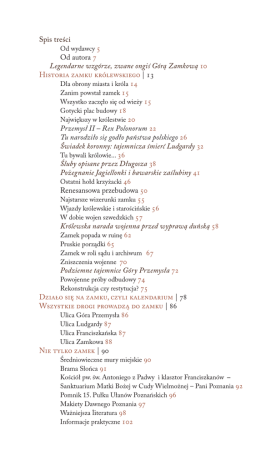 Spis treści Od wydawcy 5 Od autora 7 Legendarne wzgórze, zwane ongiś Górą Zamkową 10 Historia zamku królewskiego | 13 Dla obrony miasta i króla 14 Zanim powstał zamek 15 Wszystko zaczęło się od wieży 15 Gotycki plac budowy 18 Największy w królestwie 20 Przemysł II – Rex Polonorum 22 Tu narodziło się godło państwa polskiego 26 Świadek koronny: tajemnicza śmierć Ludgardy 32 Tu bywali królowie... 36 Śluby opisane przez Długosza 38 Pożegnanie Jagiellonki i bawarskie zaślubiny 41 Ostatni hołd krzyżacki 46 Renesansowa przebudowa 50 Najstarsze wizerunki zamku 55 Wjazdy królewskie i starościńskie 56 W dobie wojen szwedzkich 57 Królewska narada wojenna przed wyprawą duńską 58 Zamek popada w ruinę 62 Pruskie porządki 65 Zamek w roli sądu i archiwum 67 Zniszczenia wojenne 70 Podziemne tajemnice Góry Przemysła 72 Powojenne próby odbudowy 74 Rekonstrukcja czy restytucja? 75 Działo się na zamku, czyli kalendarium | 78 Wszystkie drogi prowadzą do zamku | 86 Ulica Góra Przemysła 86 Ulica Ludgardy 87 Ulica Franciszkańska 87 Ulica Zamkowa 88 Nie tylko zamek | 90 Średniowieczne mury miejskie 90 Brama Słońca 91 Kościół pw. św. Antoniego z Padwy i klasztor Franciszkanów – Sanktuarium Matki Bożej w Cudy Wielmożnej – Pani Poznania 92 Pomnik 15. Pułku Ułanów Poznańskich 96 Makiety Dawnego Poznania 97 Ważniejsza literatura 98 Informacje praktyczne 102