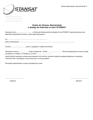 Ożarów Mazowiecki, dnia 06-03-2017 ...................................... ...................................... ...................................... Aneks do Umowy Abonenckiej o dostęp do Internetu w sieci STANSAT Zawartej w dniu .................................... w Ożarowie Mazowieckim pomiędzy firmą STANSAT reprezentowaną przez właściciela Stanisława Grzesika, zwaną dalej Operatorem a p. .......................................................................................... adres zamieszkania .............................................................................................................................. Z dniem ................................. punkt 1 paragrafu 4 nabiera brzmienia: Abonament wynosi ...................... brutto miesięcznie - Pakiet ................................. Okres obowiązywania umowy zostaje przedłużony o kolejne 12 miesięcy tj. do dnia ................................. . Jeżeli Abonent wypowie umowę przed upływem w/w terminu zostanie obciążony opłatą dodatkową w wysokości 122,00zł brutto, wynikającą z przyznanej ulgi na zmianę pakietu. Pozostałe postanowienia umowy pozostają bez zmian. .......................................... Operator .......................................... Abonent